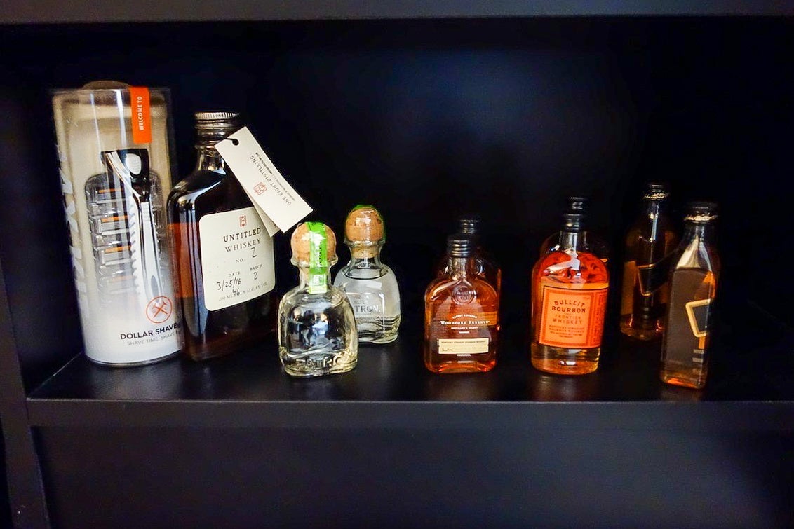 There was a small bottle of wine and spirits bottles and a Dollar Shave Club kit.