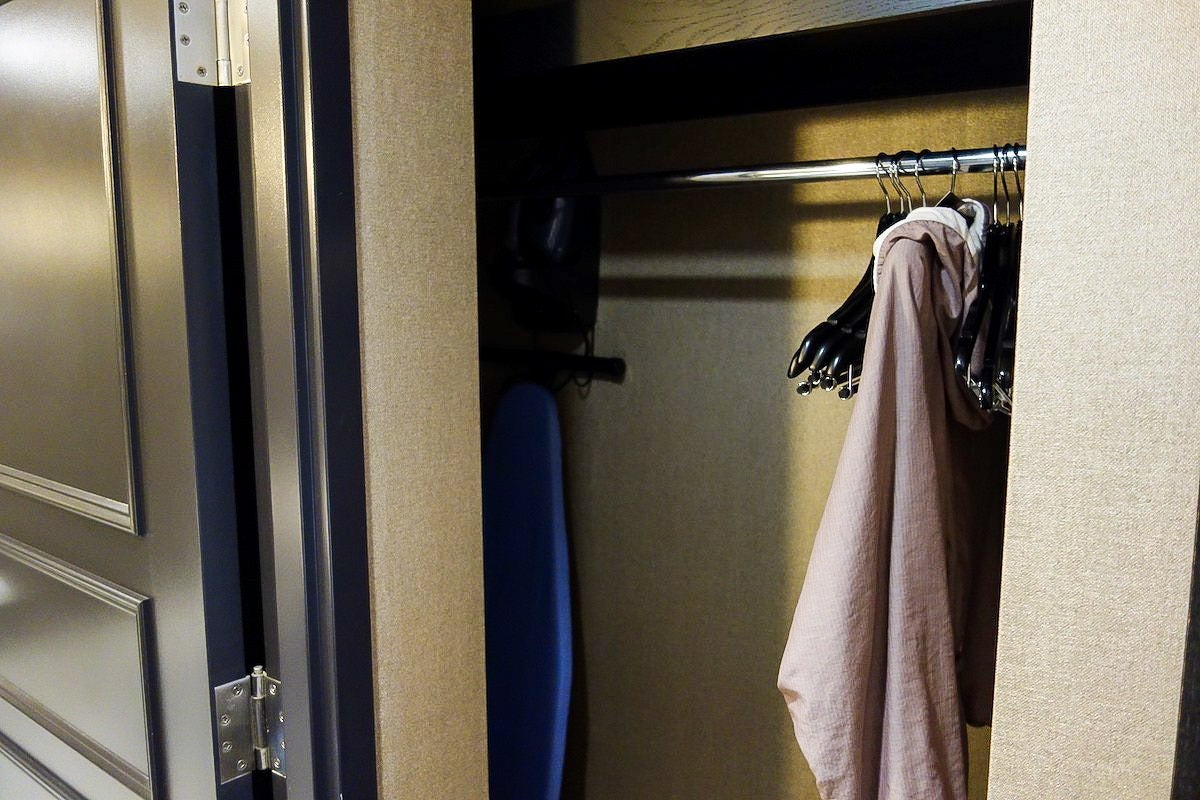 Next to the bed, the closet was actually the entrance to the bathroom. There was a rack for hanging clothes to one side.