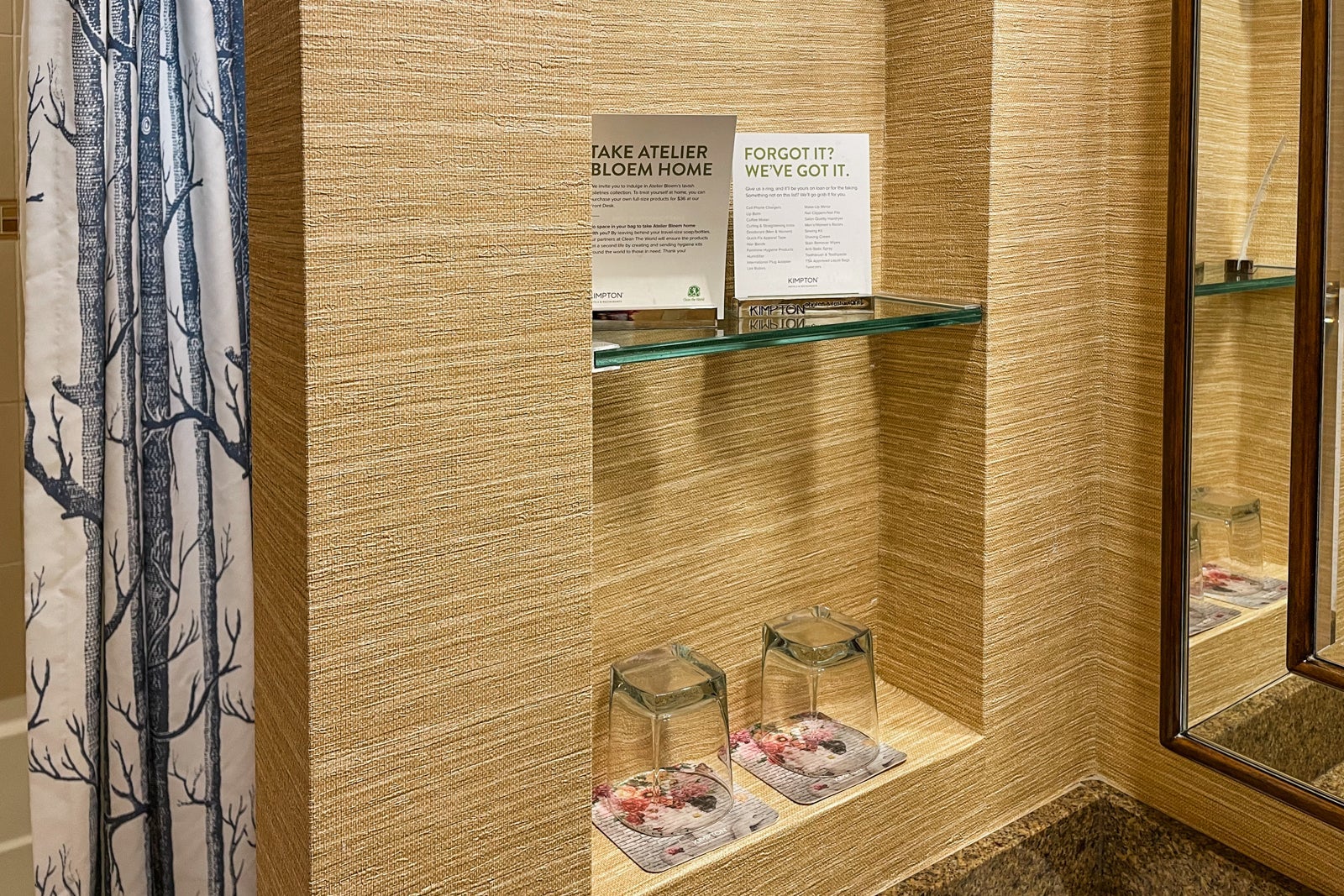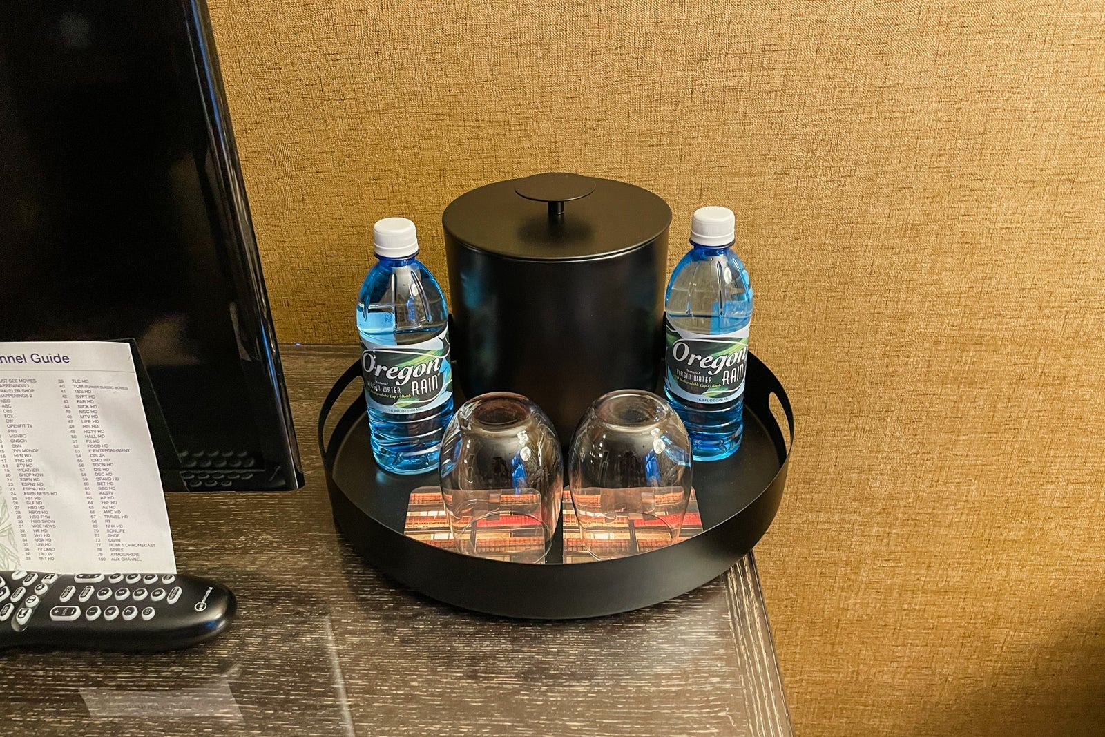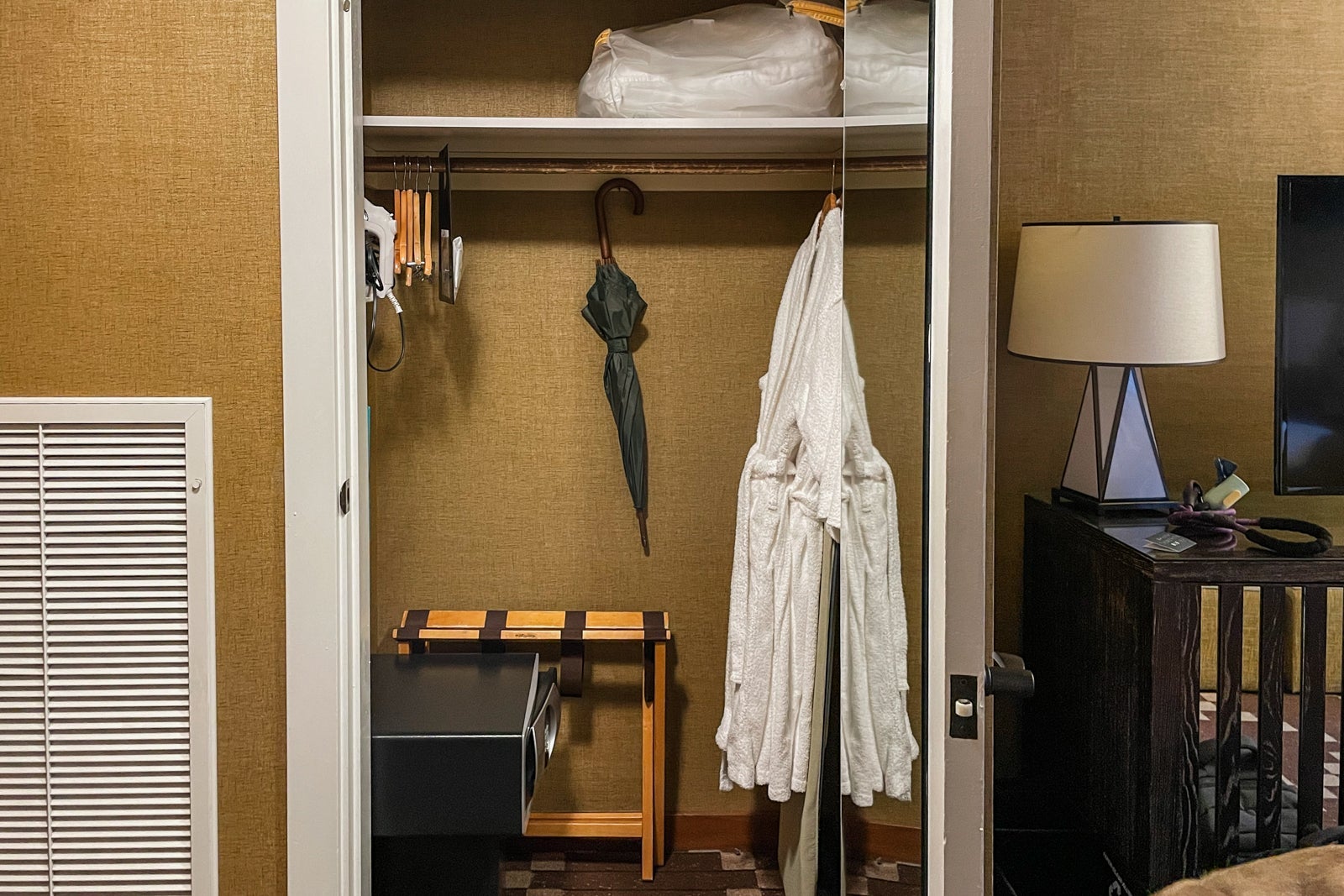 The bathroom was clean and equipped with the essentials. Robes were included in the hotel room's closet, along with a safe, yoga mats, an umbrella and a luggage stand. The lighting in the room was soft, giving it a cozy feel. That said, the room was a little on the dark side, especially since I stayed during Portland's rainy season.