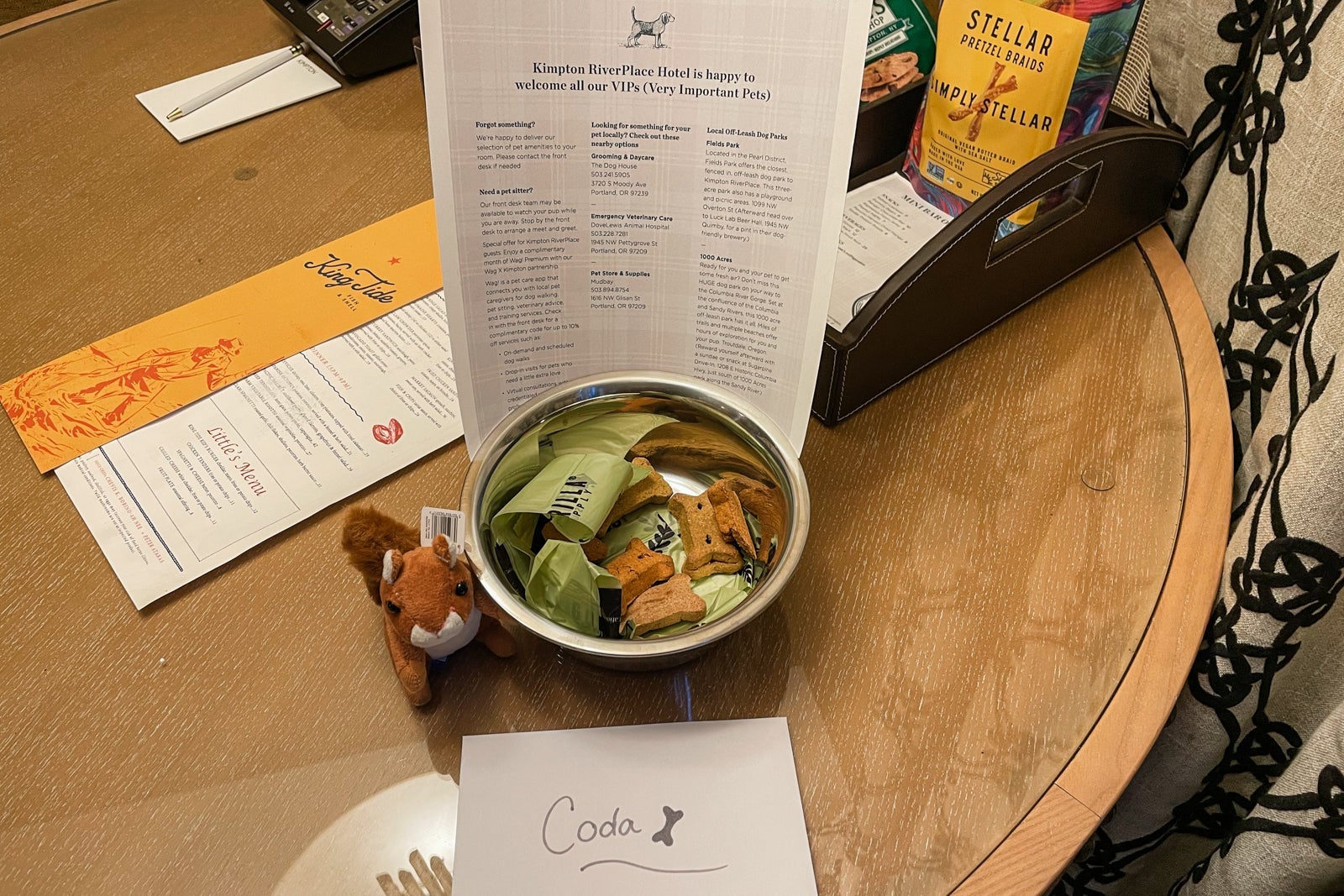 In our room, there was a welcome package for Koda, which was sweet. It included a dog bowl, waste bags, several dog treats, a small stuffed squirrel and a bed. The bed was too small for him, but he tried to make it work anyway.