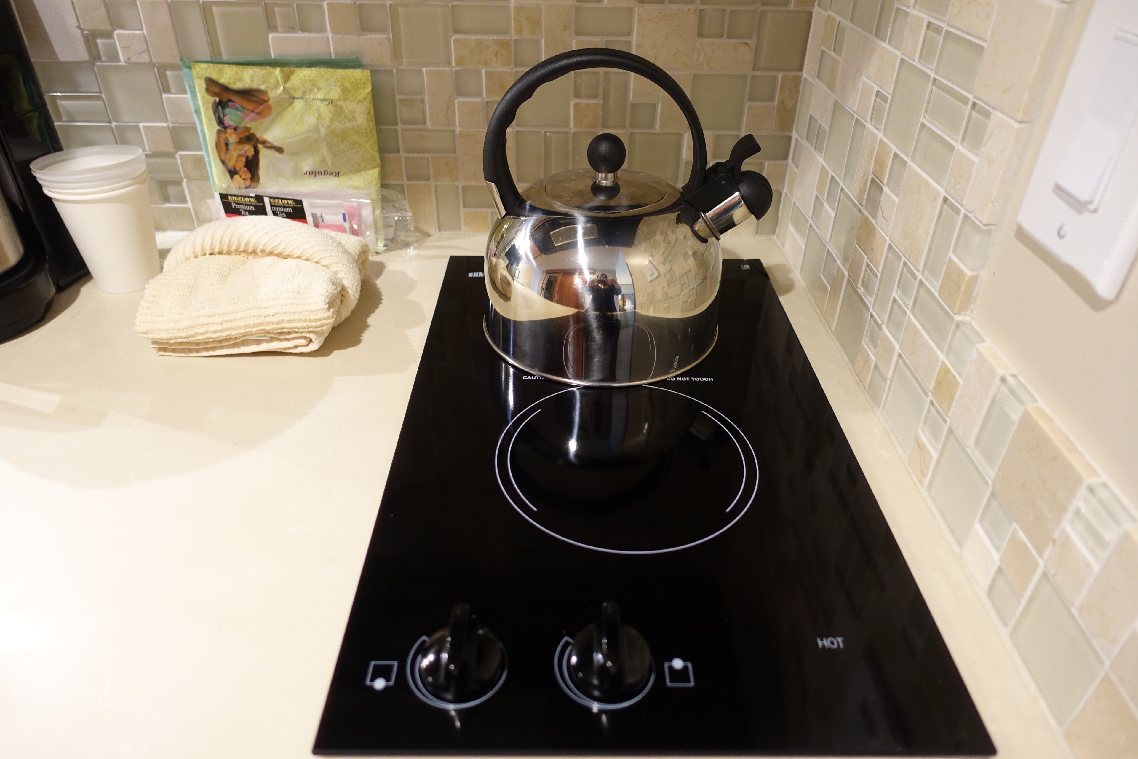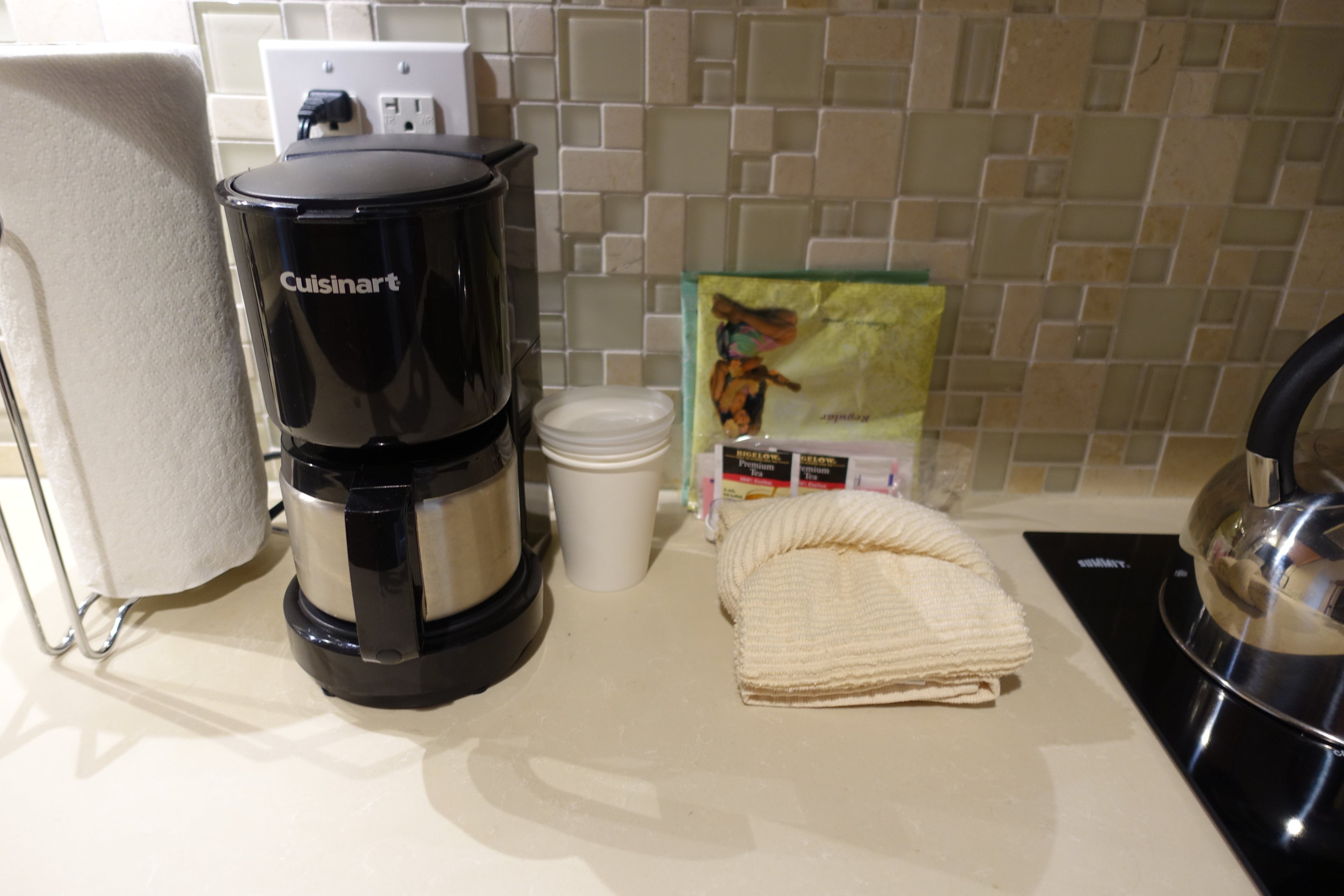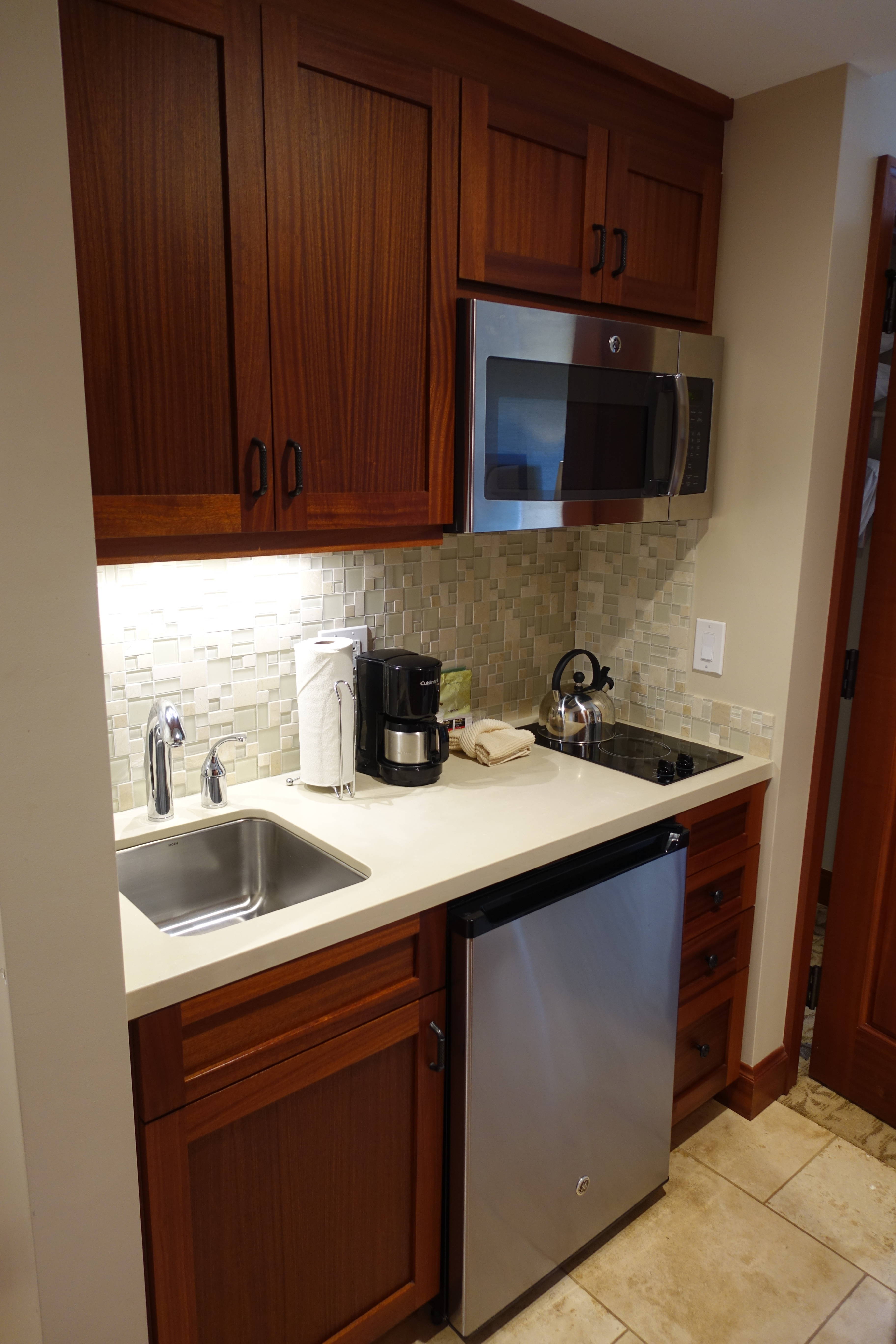 The space also had a tight but fully outfitted kitchen with two stovetop burners, a tea kettle, coffeemaker, minifridge and microwave. There were also a few complimentary coffee packets and tea bags. The resort offered incoming guests the option to stock their pantries with goodies like chips, macadamia nuts, coffee, juice, beer, wine, liquor and even grocery staples like bread, milk and cereal.