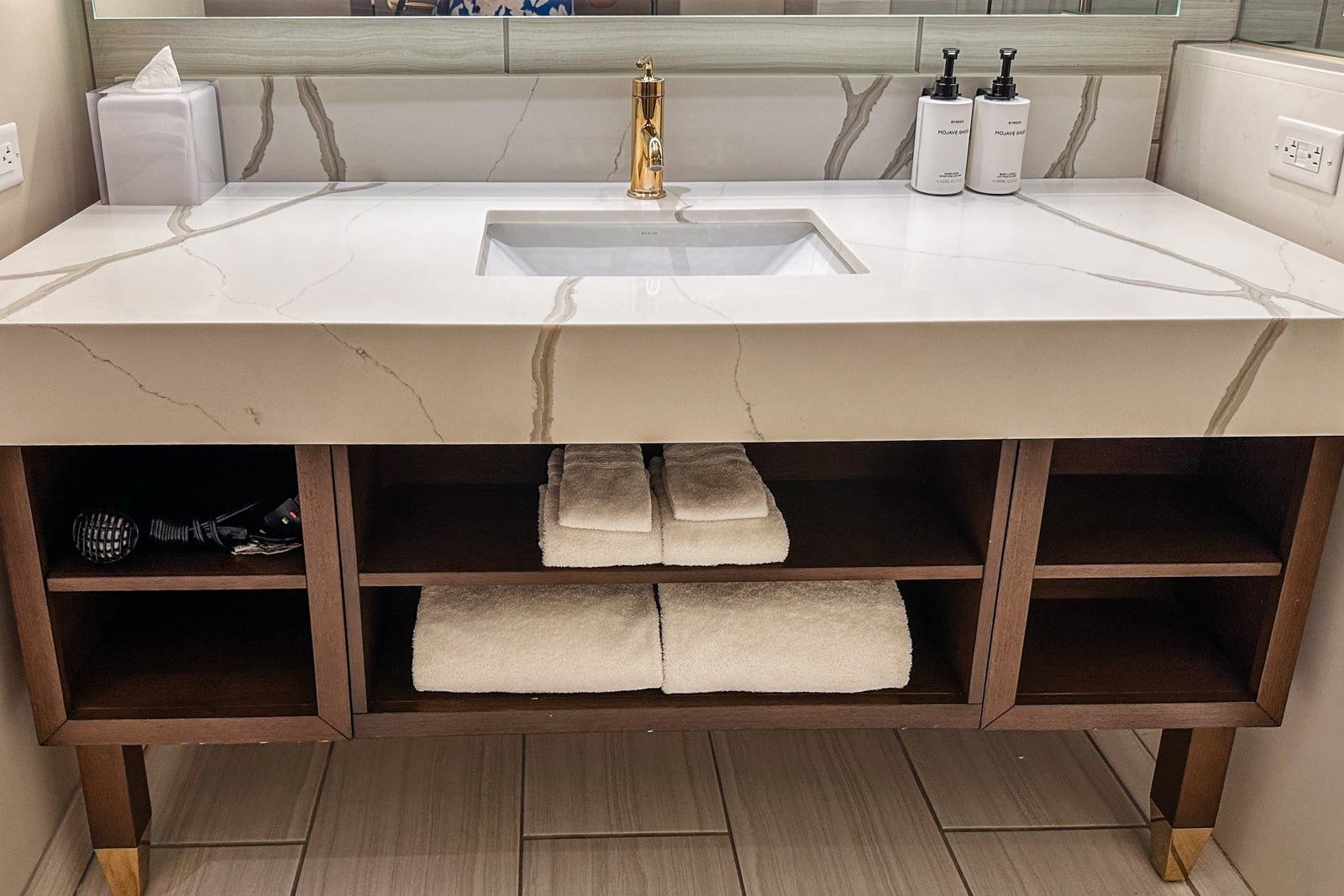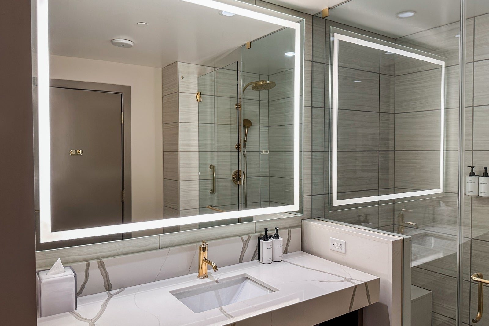 Like the room, the bathroom also felt quite spacious, with enough counter space to unpack toiletries with room to spare. It was also especially helpful to have double outlets on both sides of the vanity for things like hair tools, clothing steamers or chargers.