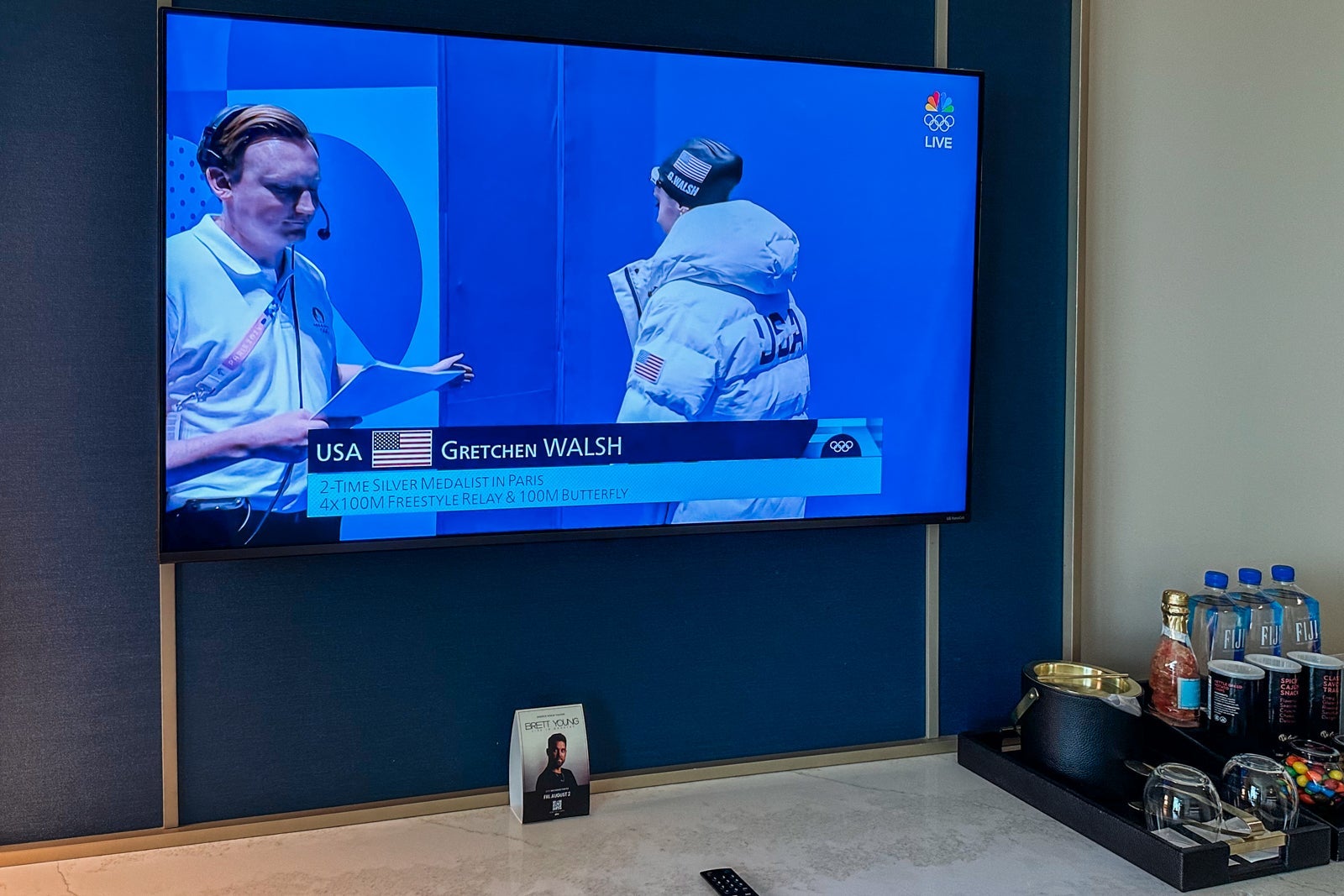 The TV was mounted on the wall opposite the bed, which allowed me to switch between different Olympic games as I unpacked and settled into the space.