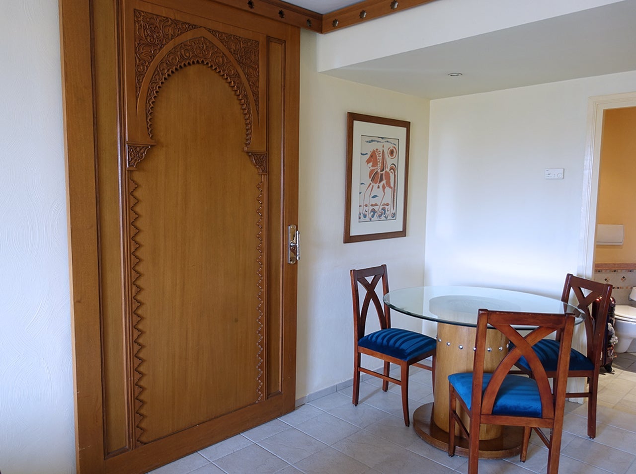 The living room also had a closet with ironing board and TV. Large, beautiful doors with wooden etchings led to the bedroom.