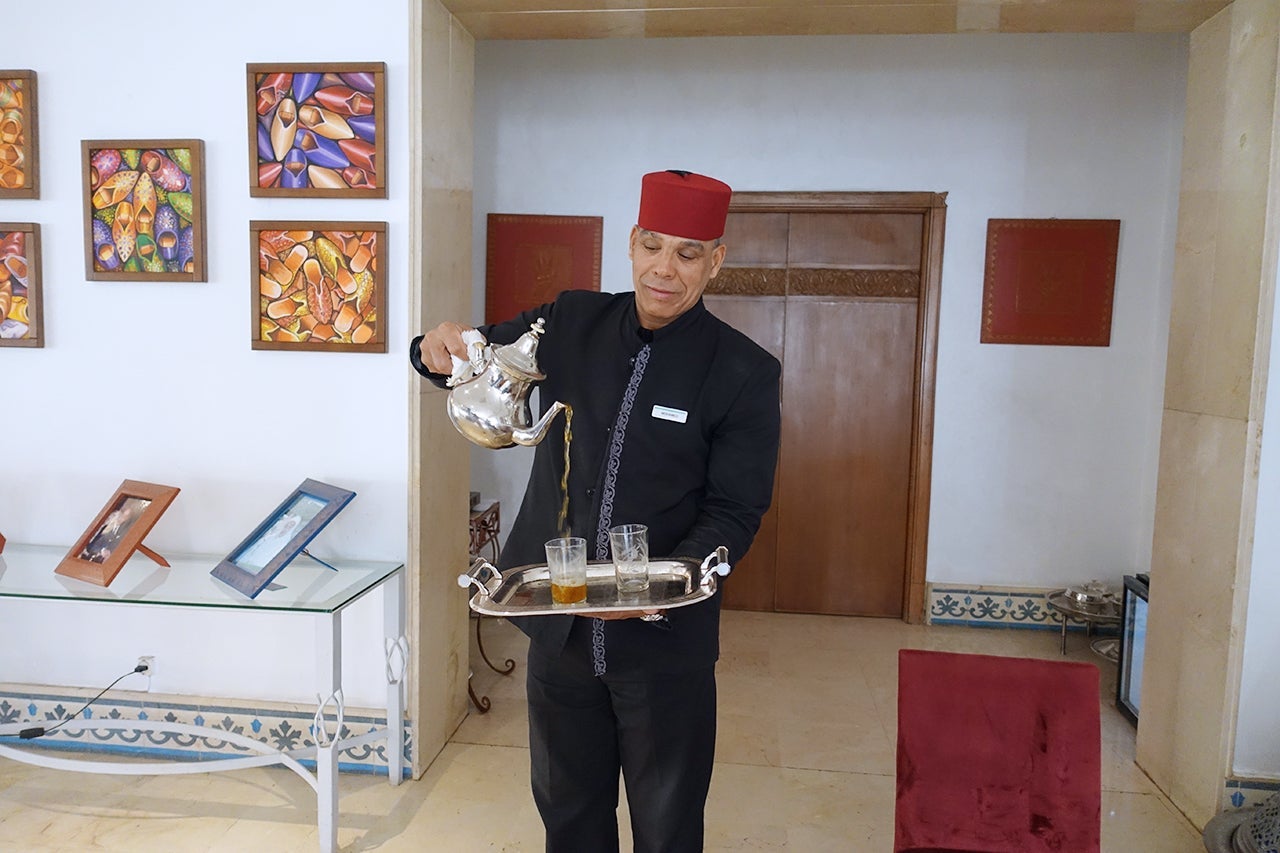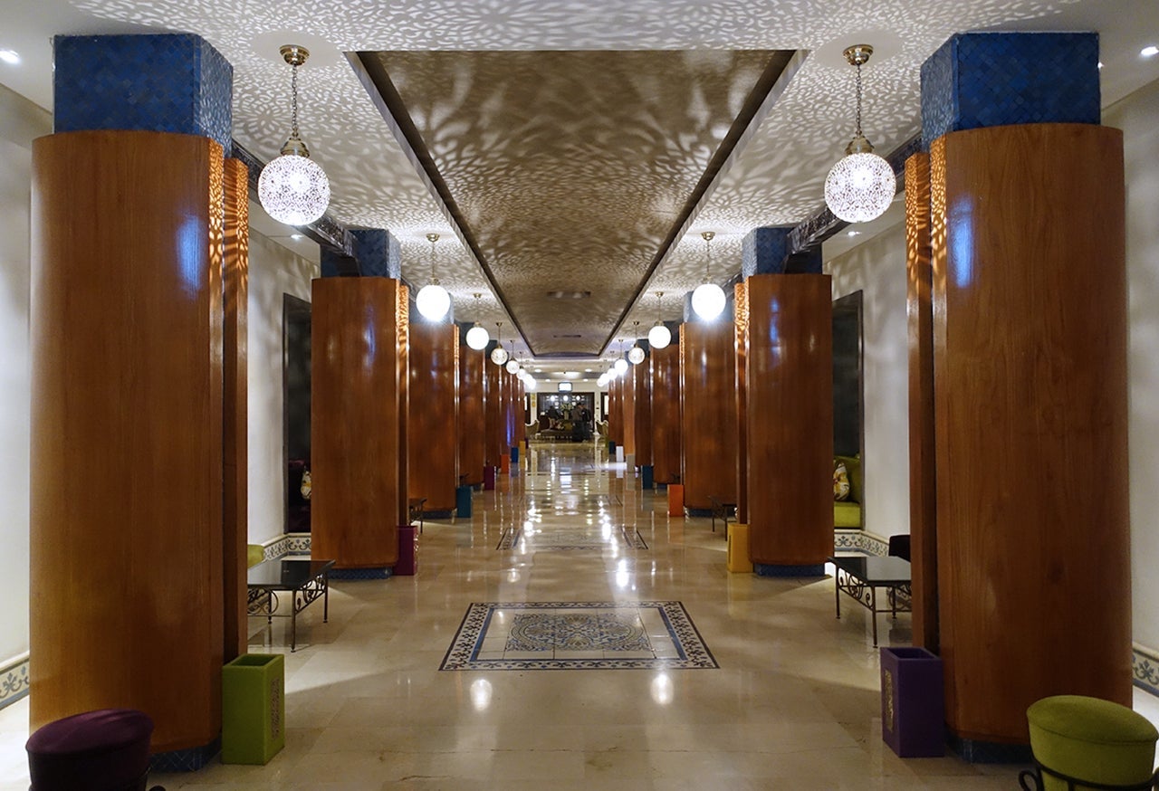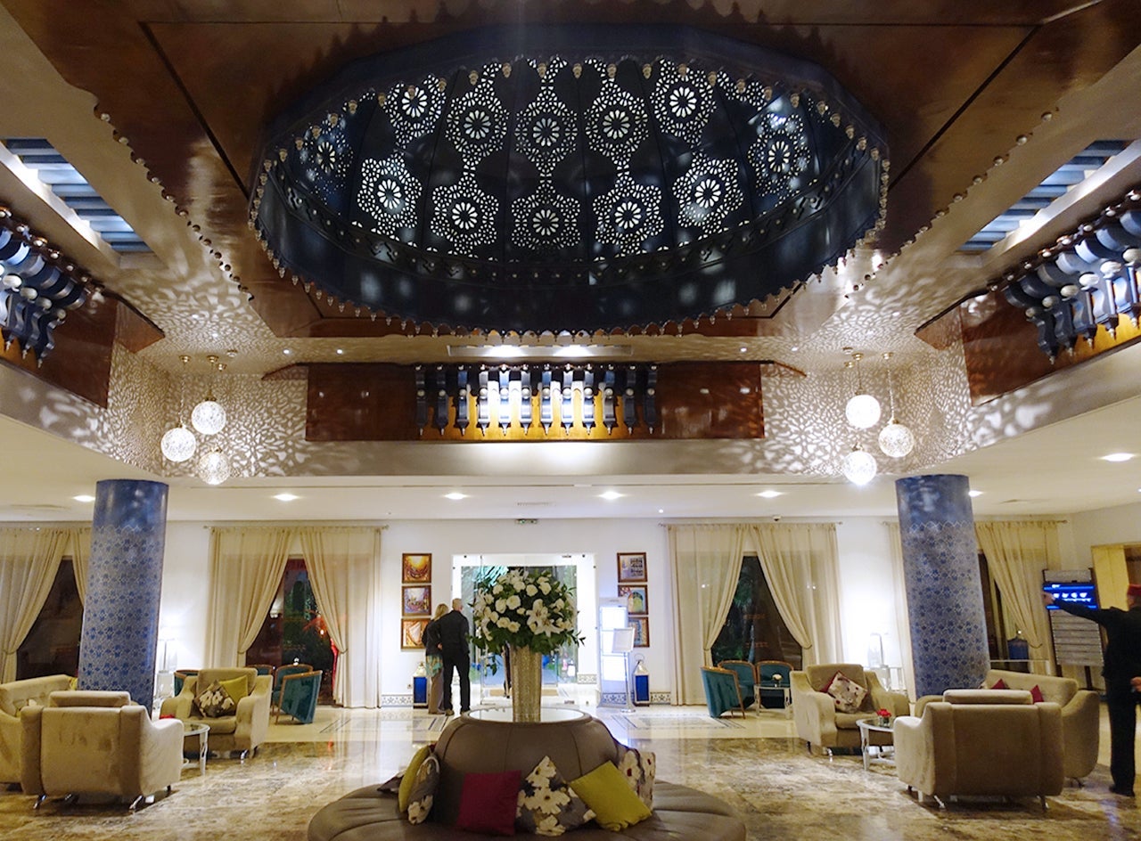 A man with a beautiful silver teapot poured me a glass of Moroccan mint tea (he would pour me tea pretty much any time I was in the lobby for the remainder of my stay, which was amazing). The lobby was luminous and large, with comfortable sofas and a beautiful decorative dome.