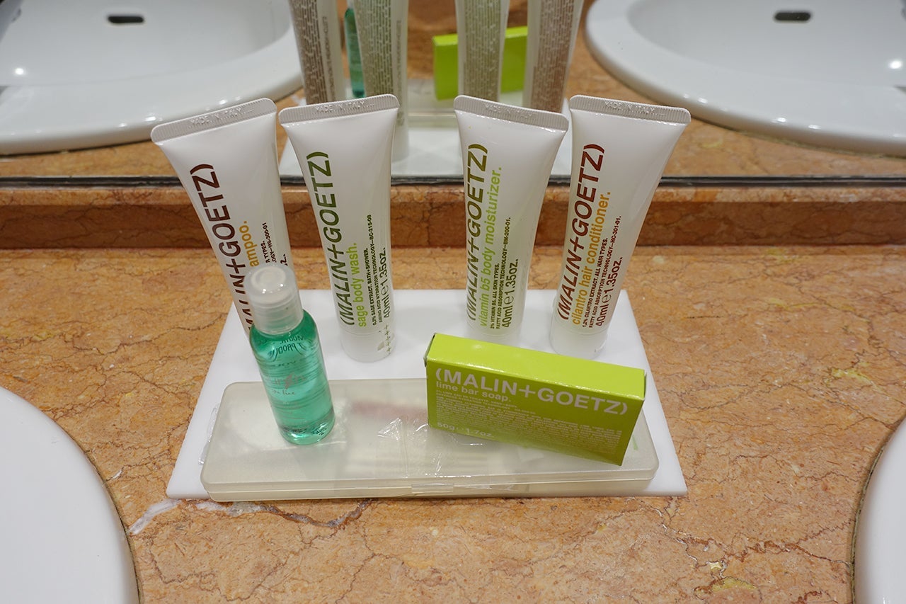 The double vanity was visibly dated, but the plentiful Malin+Goetz amenities were greatly appreciated.