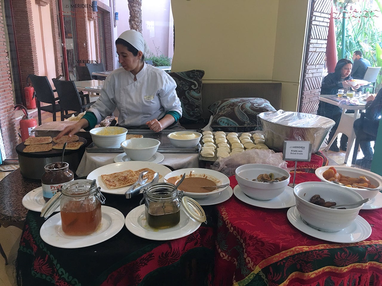 The breakfast buffet was available from 6:30am to 10:30am, and the space was off the lobby with both indoor and outdoor seating options. The buffet was well-stocked with fresh fruit, cereal, pastries and hot food like eggs, cooked vegetables and breakfast meats. Freshly squeezed juice was also available, and there were two large coffeemakers. Of course, there was plenty of mint tea. A woman made Moroccan pancakes off to one side, with honey, jam or olive oil available as toppings.