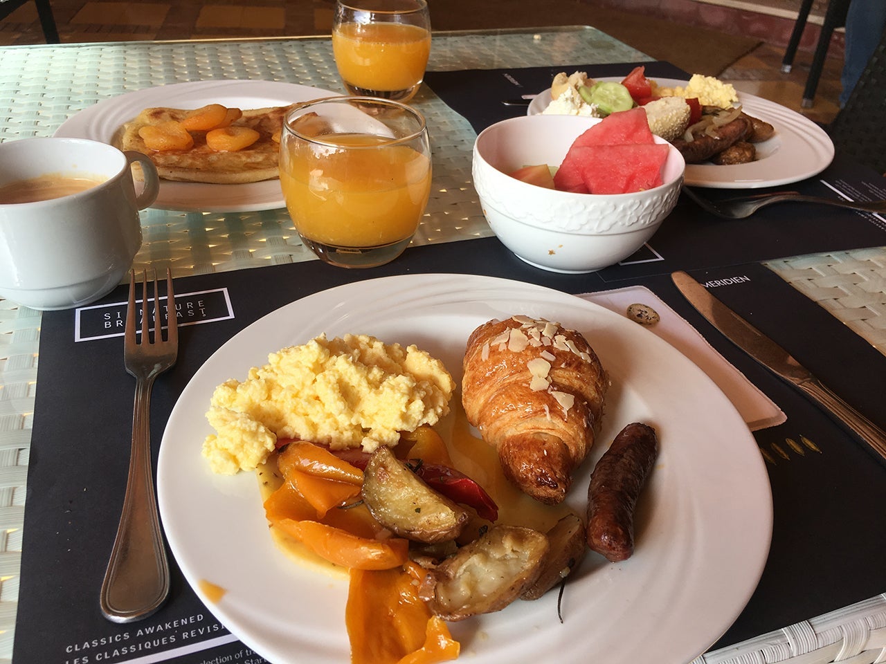Although the food at the buffet was pretty good, the number of children running around was obnoxious. While I recognized and appreciated that the hotel was family-friendly, it was unsafe (and annoying) to have children running around and shoving people during the buffet. More than once, I had to quickly jump aside carrying a full plate of food to avoid being run over by rowdy kids. I also saw children (in full view of the parents) touching food in the buffet and putting it back and dropping fruit on the floor that would be left there, untouched and not cleaned up by staff. I was relieved both mornings to finally sit down with my plate of food, knowing I had made it unscathed to my table, even pre-coffee!