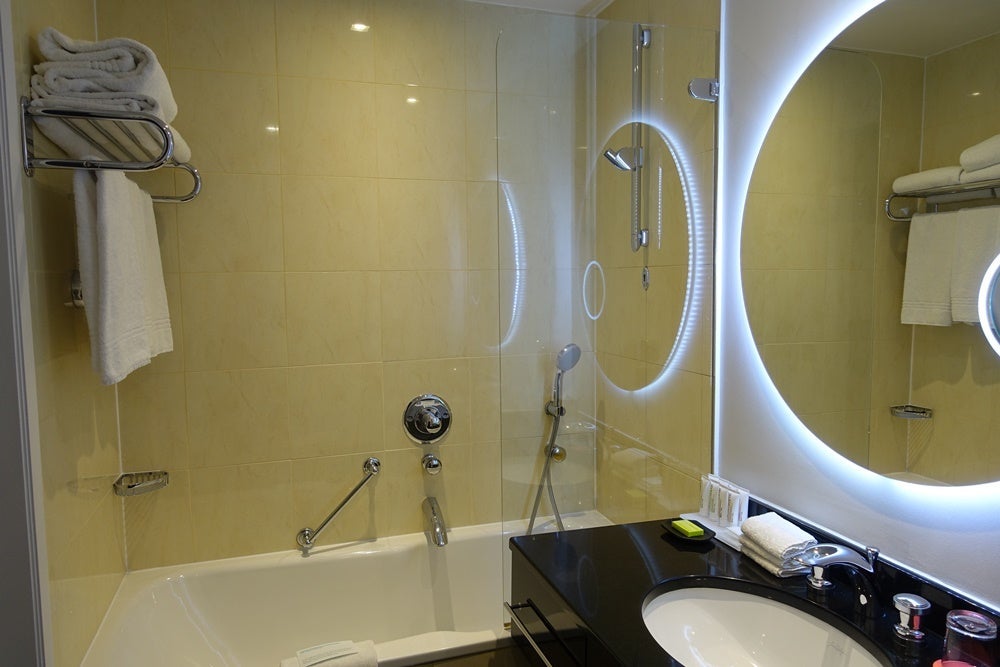 The bathroom was large and well-lit, with a bathtub and shower that had great water pressure.