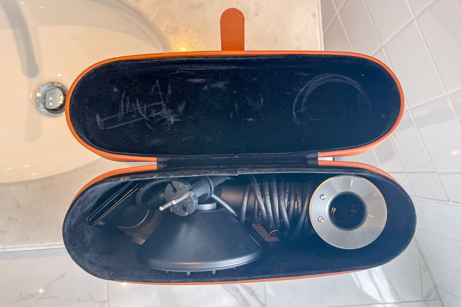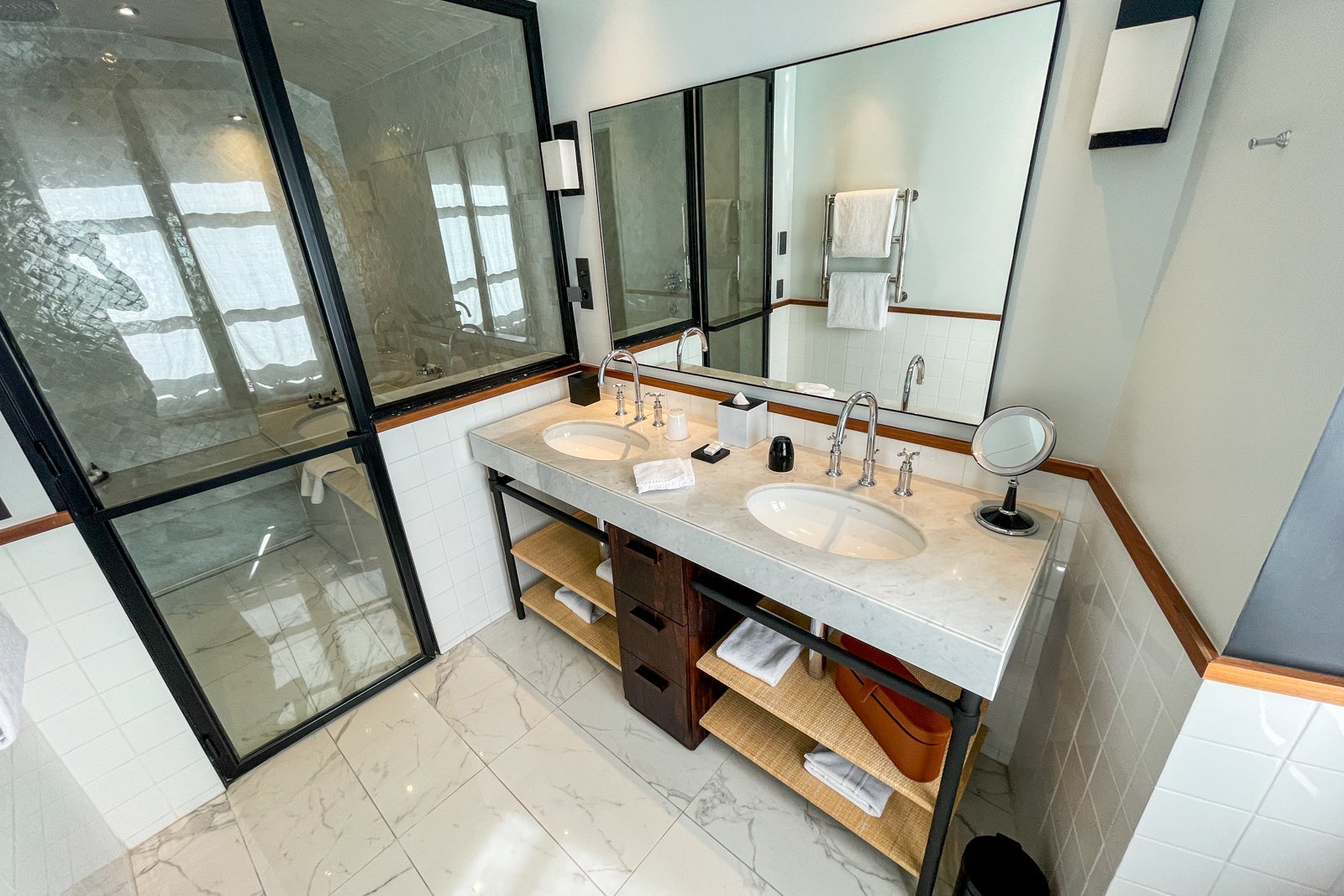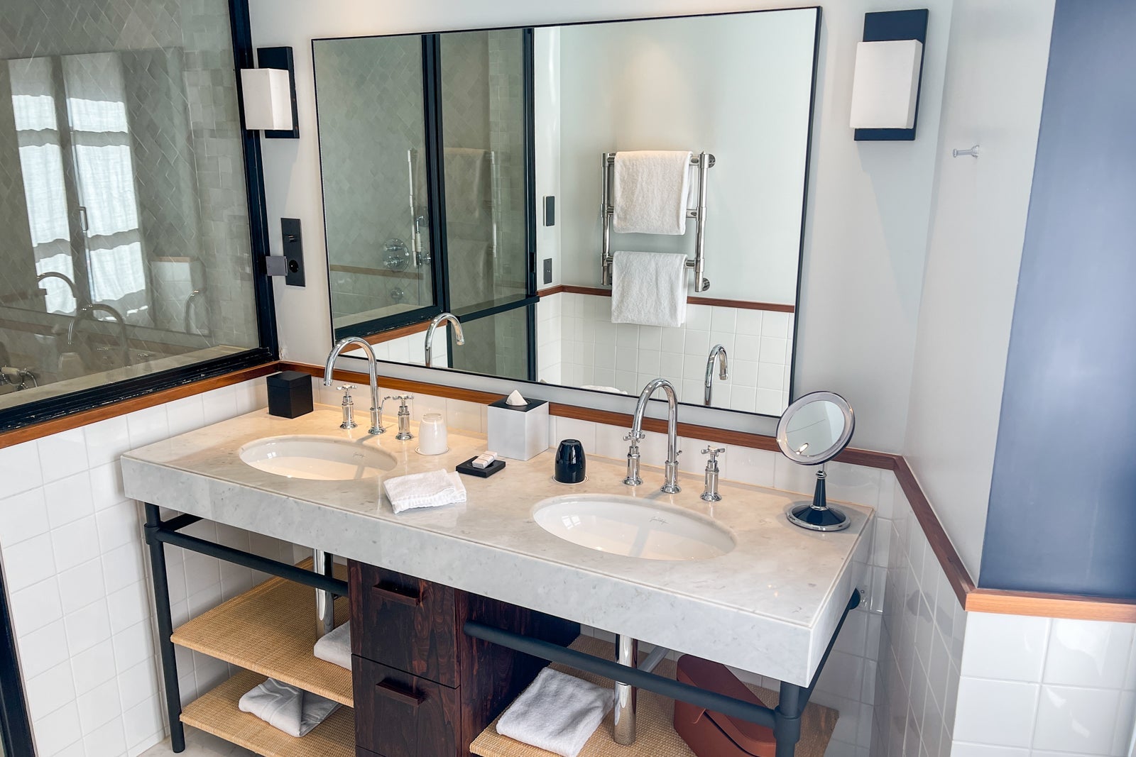Now for the best part of the room: the washroom. This is no average washroom — it's more like a spa in your room. When you walk in, you'll see a vast vanity, two sinks and cups. Underneath, you'll find a super cool Dyson hairdryer and extra hand towels. The whole vanity is well designed, and — despite not needing a hairdryer — I found myself wanting to purchase one from Dyson. Across from the vanity is a heated towel rack.