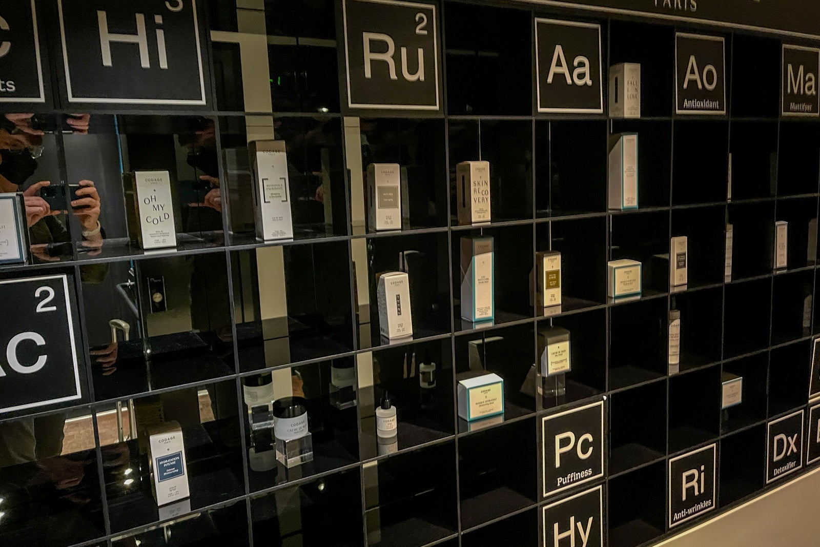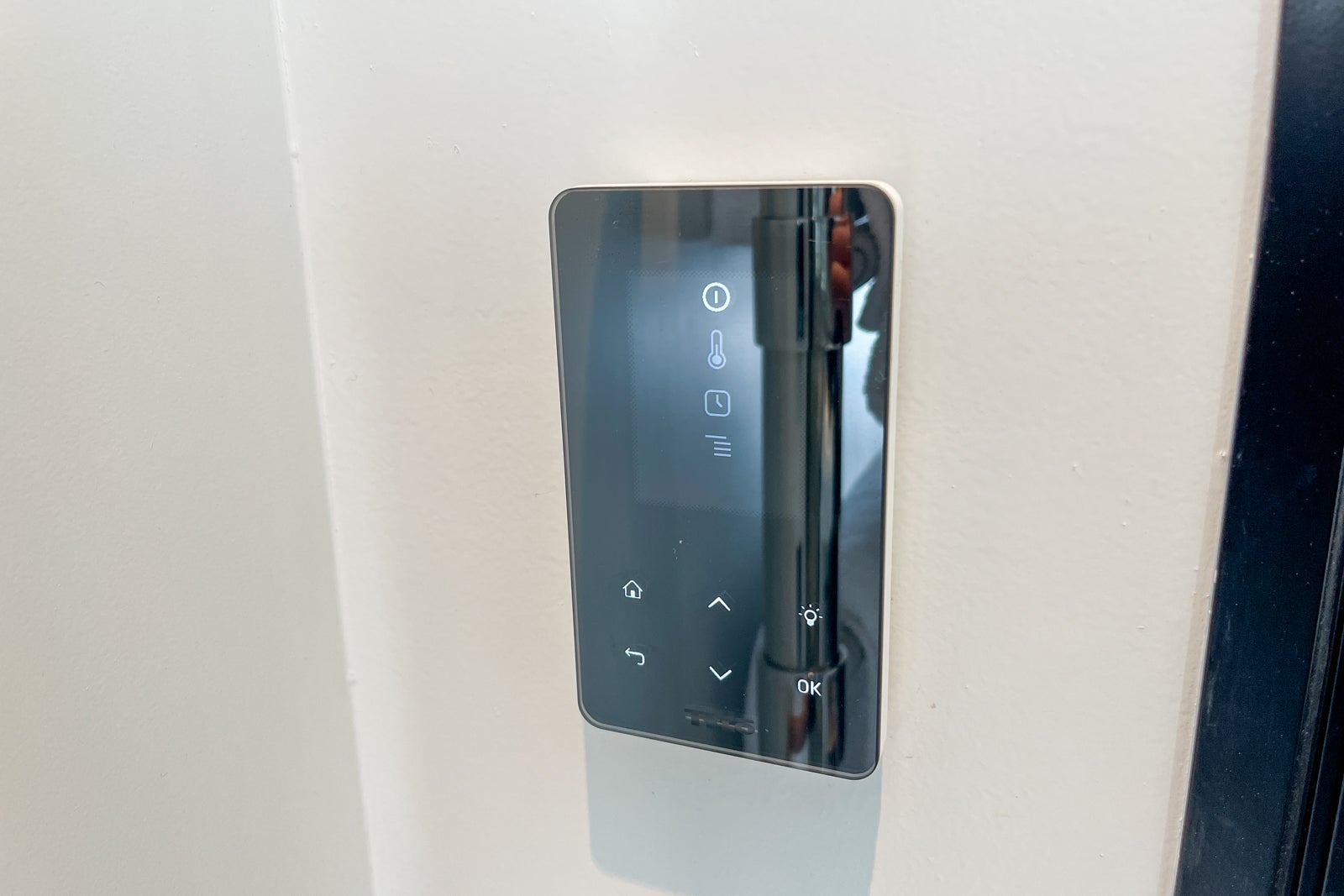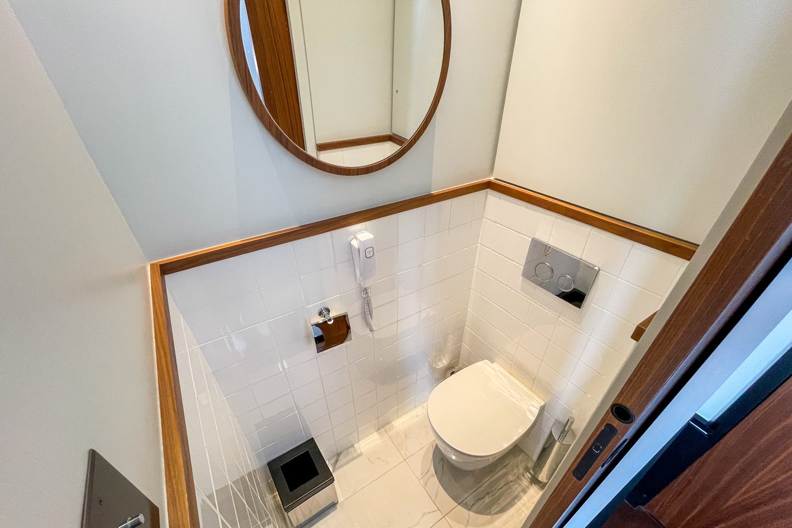 The best part of the washroom is the shower room. Inside, there's a rainfall shower and tub. It's stocked with high-end single-use toiletries and bath salts, which I much prefer to shared toiletries. Even more astonishing, it doubles as a steam room that you can control with the touch screen outside the entrance. Trust me when I say that a sit in the steam room is the perfect way to recover from a transatlantic flight.