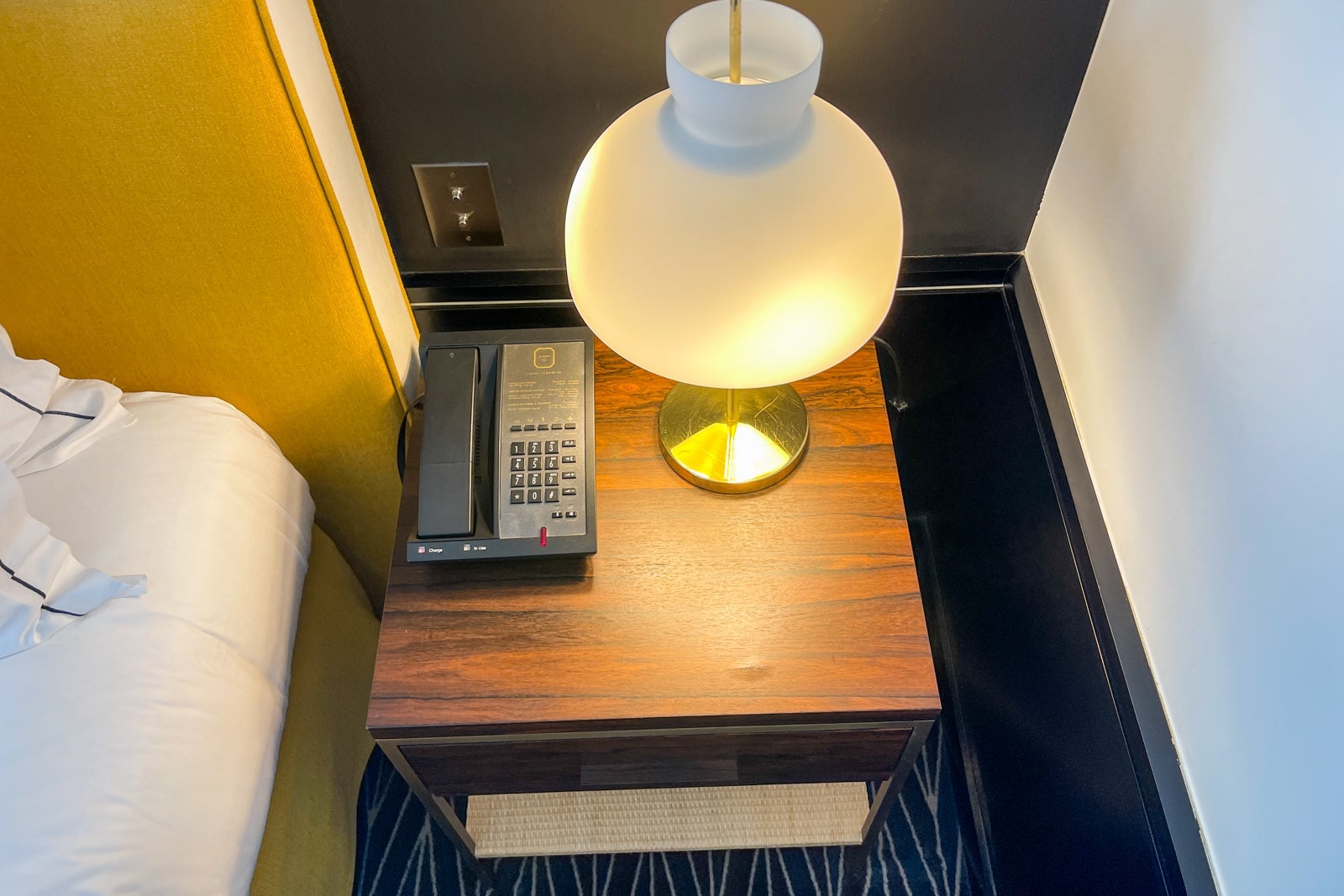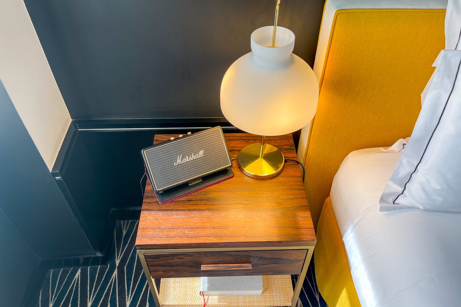 The bedroom has everything you'd expect. There's a large king-size bed with ultra-soft pillows and a plush comforter across from a large desk and TV. There are plenty of outlets on each nightstand and on the desk, so you can keep your gadgets charged without issue. There's also a Marshall-branded Bluetooth speaker on the nightstand.