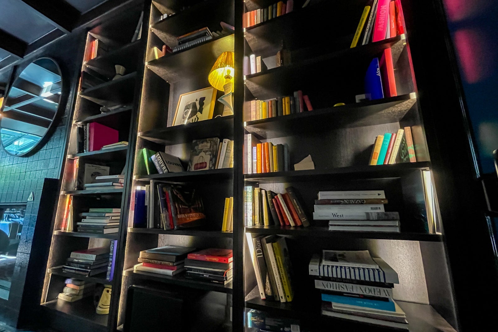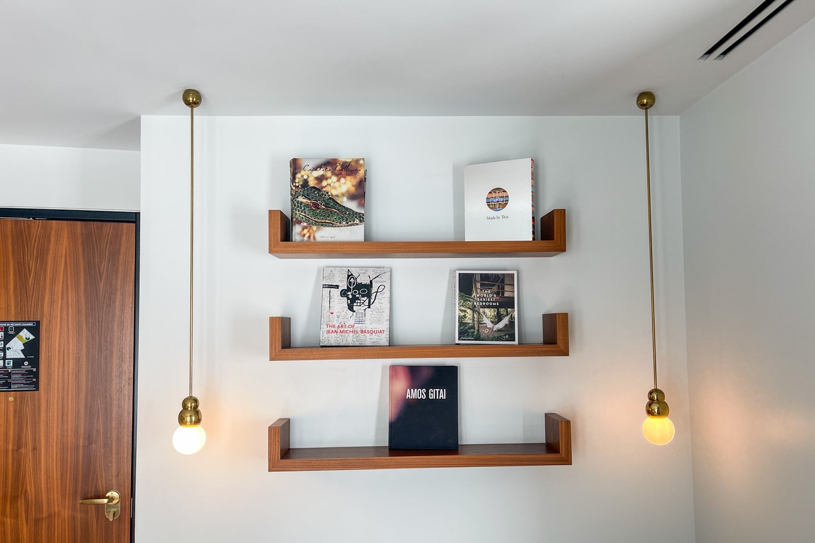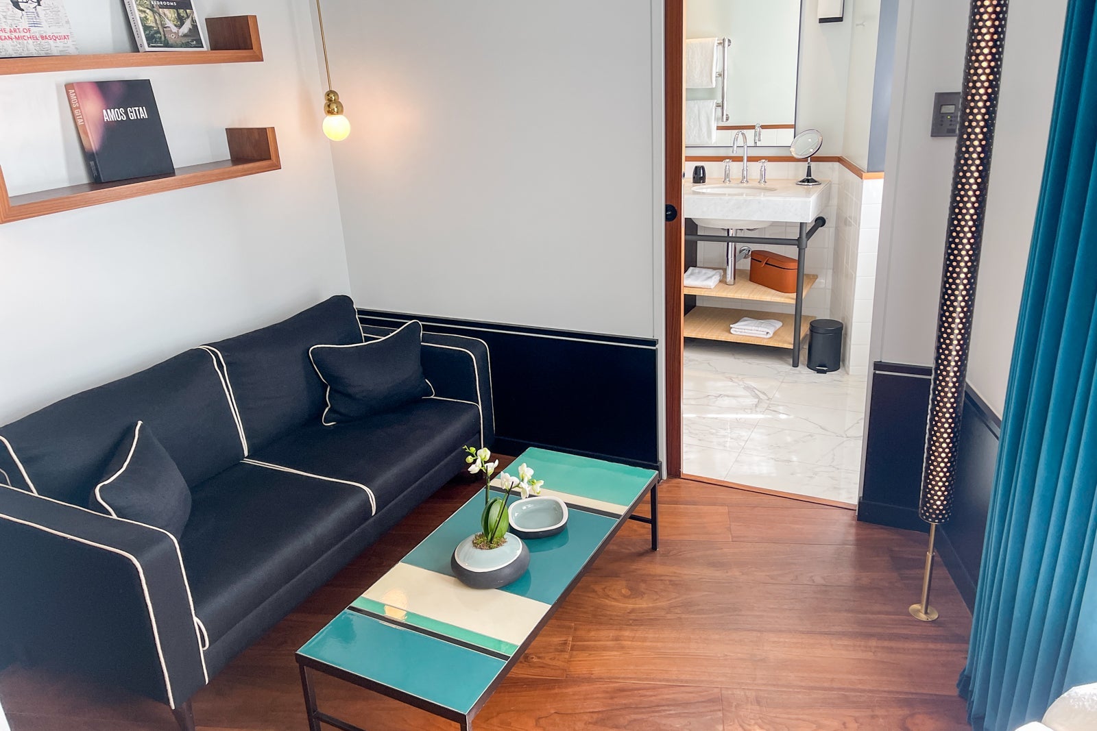 I booked a standard room at Le Roch, but my Platinum Elite status got me an upgrade to a suite. Upon walking into the suite, you'll see a living area with a couch, chair, table and TV. Behind the sofa is a hanging bookshelf with art and design books that were nice to flip through.
