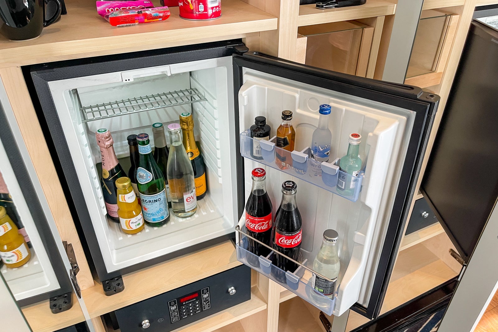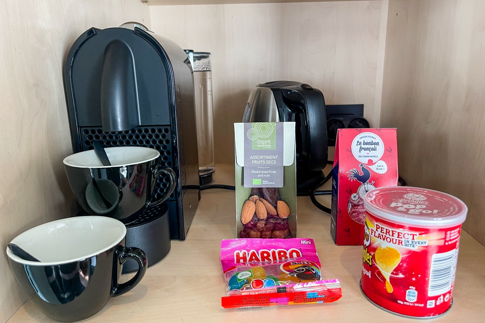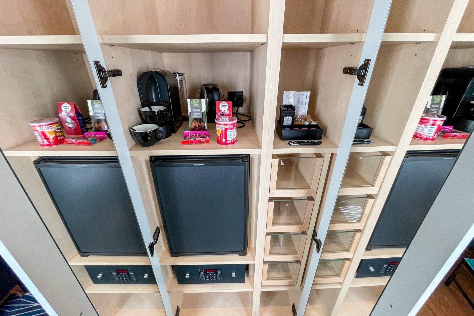 Between the bedroom and living area is a small hallway. You'll find closets on each side, one of which houses the minibar and coffee maker. Each room has a Nespresso machine — one of my favorite European hotel amenities — and espresso pods are restocked daily. The minibar was fully stocked but exorbitantly expensive. Think 10 euros for Pringles and 8 euros for a Coke. Thankfully the espresso was complimentary.