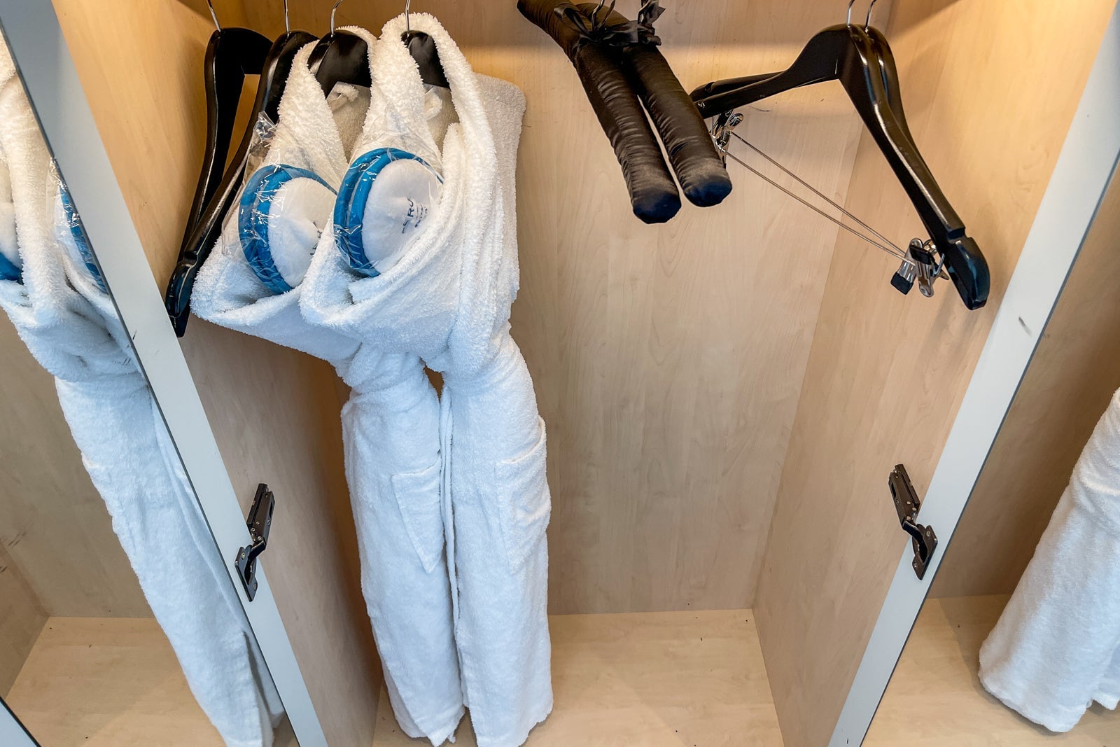 Across from the minibar, you'll find a closet with robes, a laundry bag, a shoe mitt and a sewing kit.