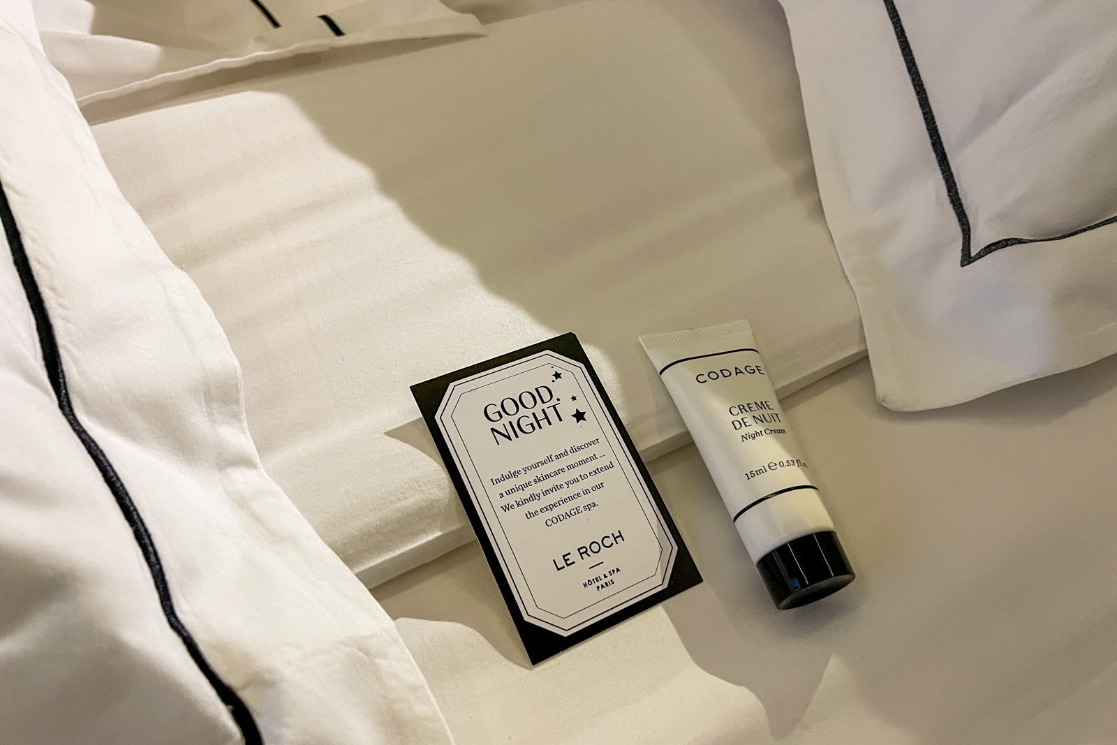 The hotel provided turndown service every night, when housekeeping laid out new pillows and left a little bottle of nighttime moisturizer. I was surprised to see Le Roch still offering turndown service in a COVID-19 world where hotels are moving toward a contactless future. Regardless, it was nice to see a bit of normalcy.