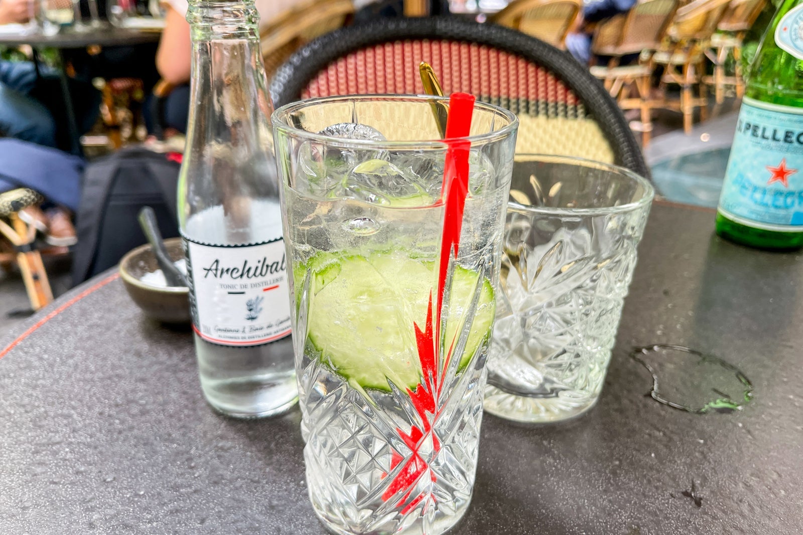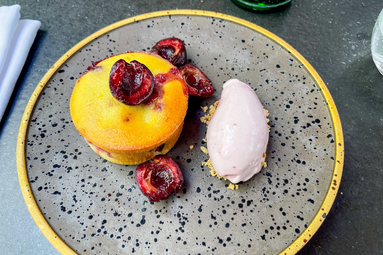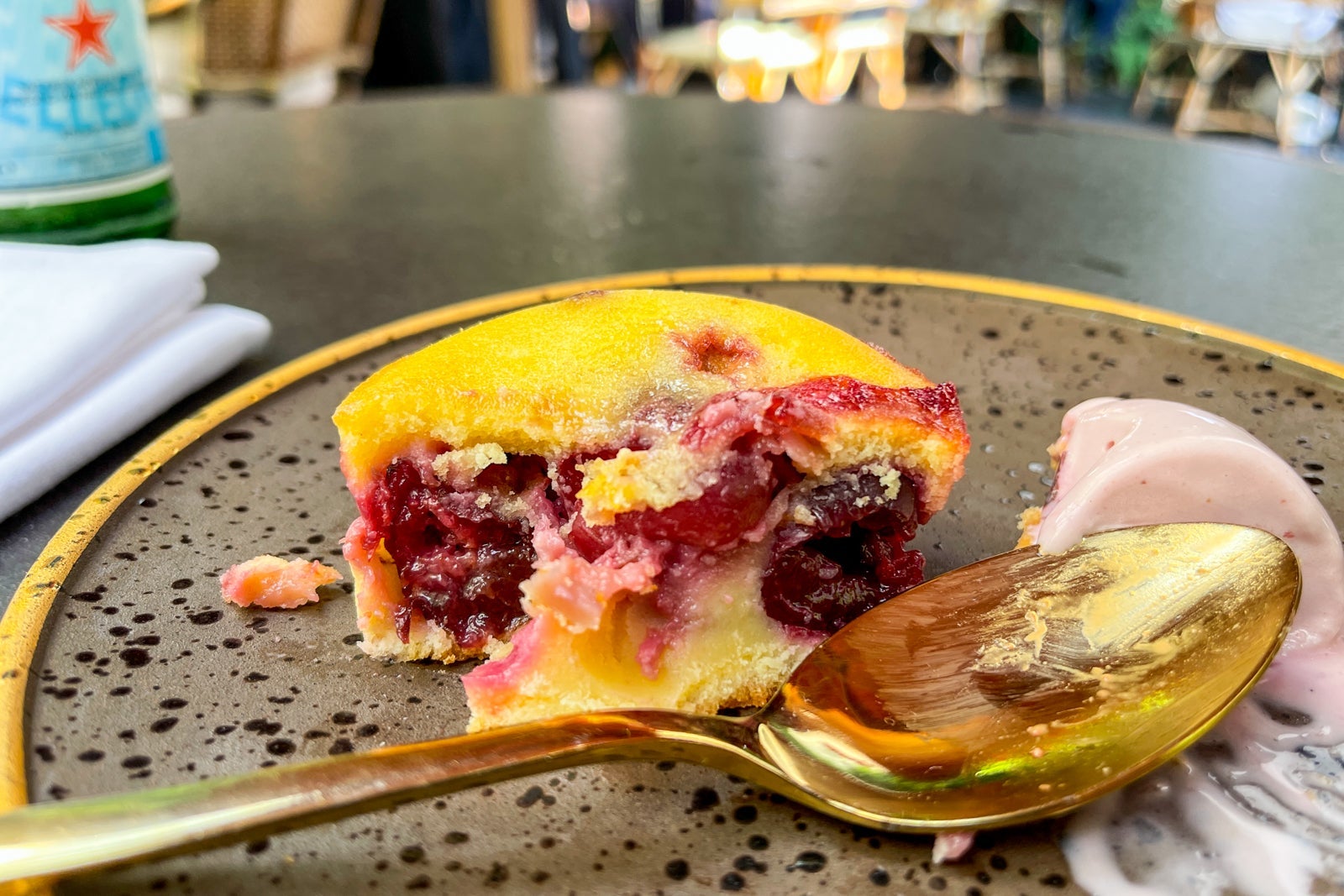 For dessert, I had a delicious cherry clafoutis and yogurt sorbet. The waiter also brought me a small glass of Champagne and told me to enjoy my time in Paris.