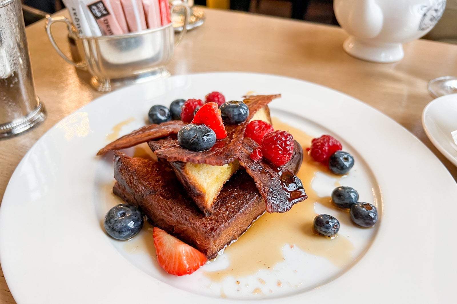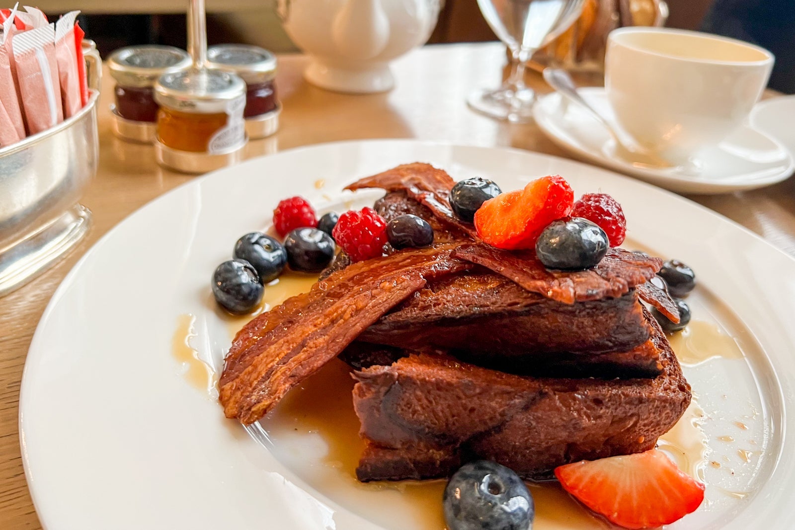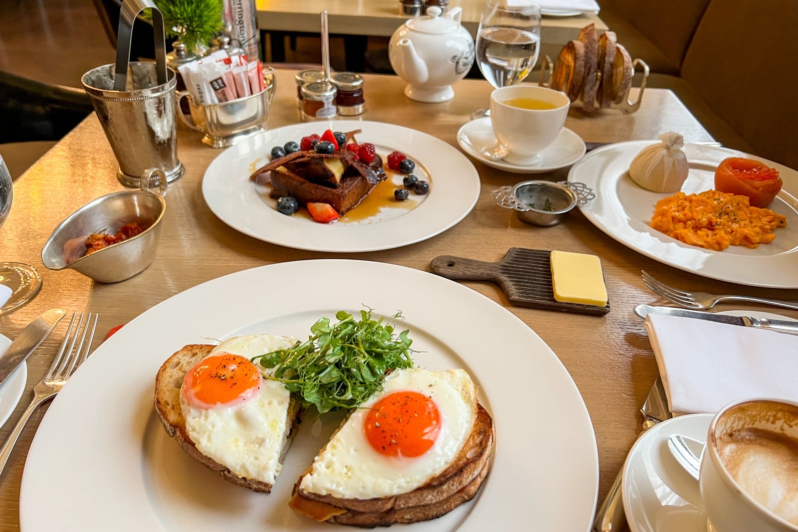 I didn't try to get in for a proper supper during my visit, so I instead opted to visit for breakfast one morning. I was thoroughly satisfied with everything I tried, including the Crispy Dingley Dell sandwich with bacon, onion jam and two fried eggs for 19 British pounds ($24) and the brioche French toast topped with bacon, berries and maple syrup for 15 British pounds ($19).
