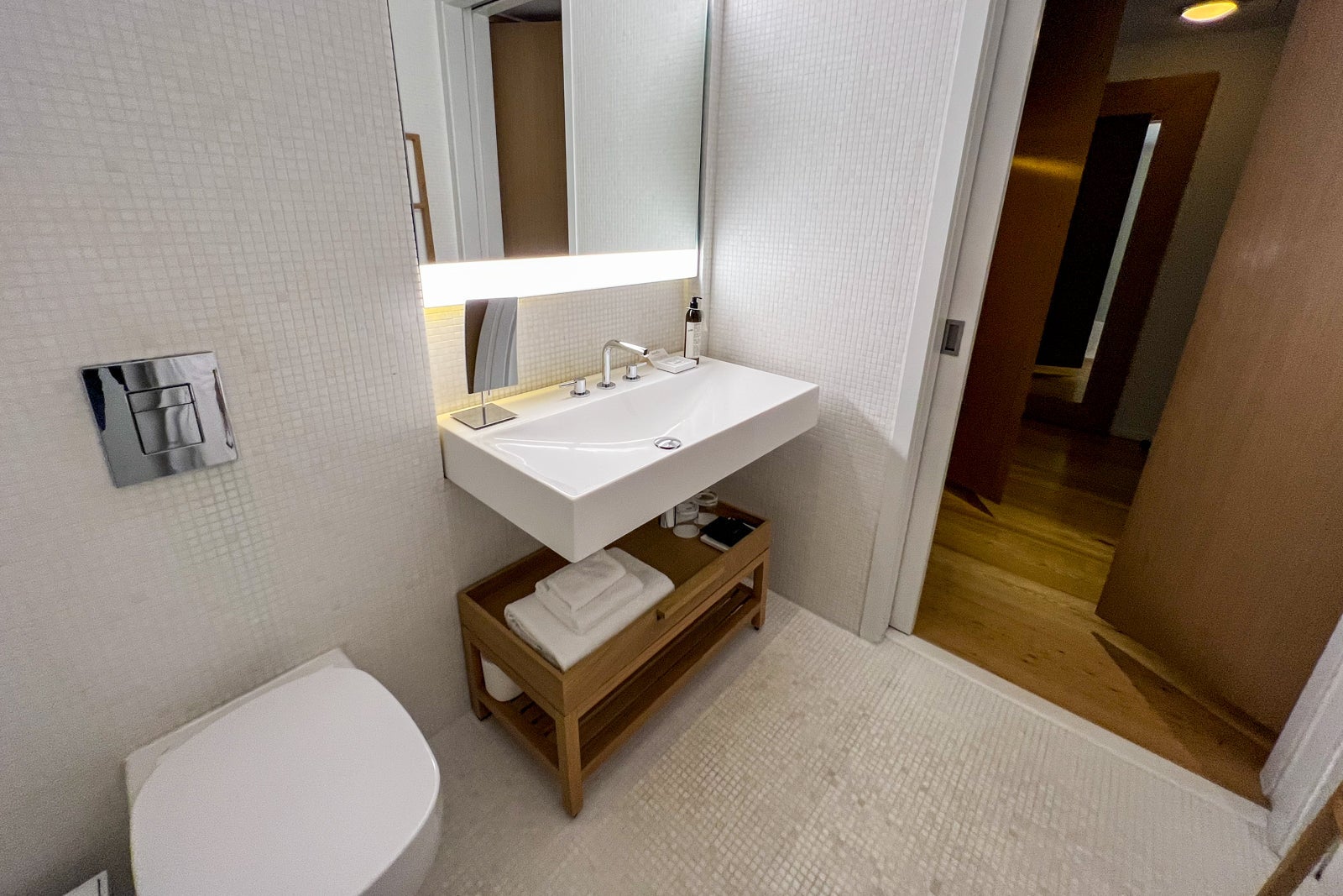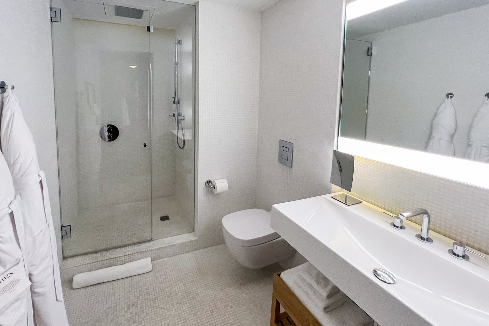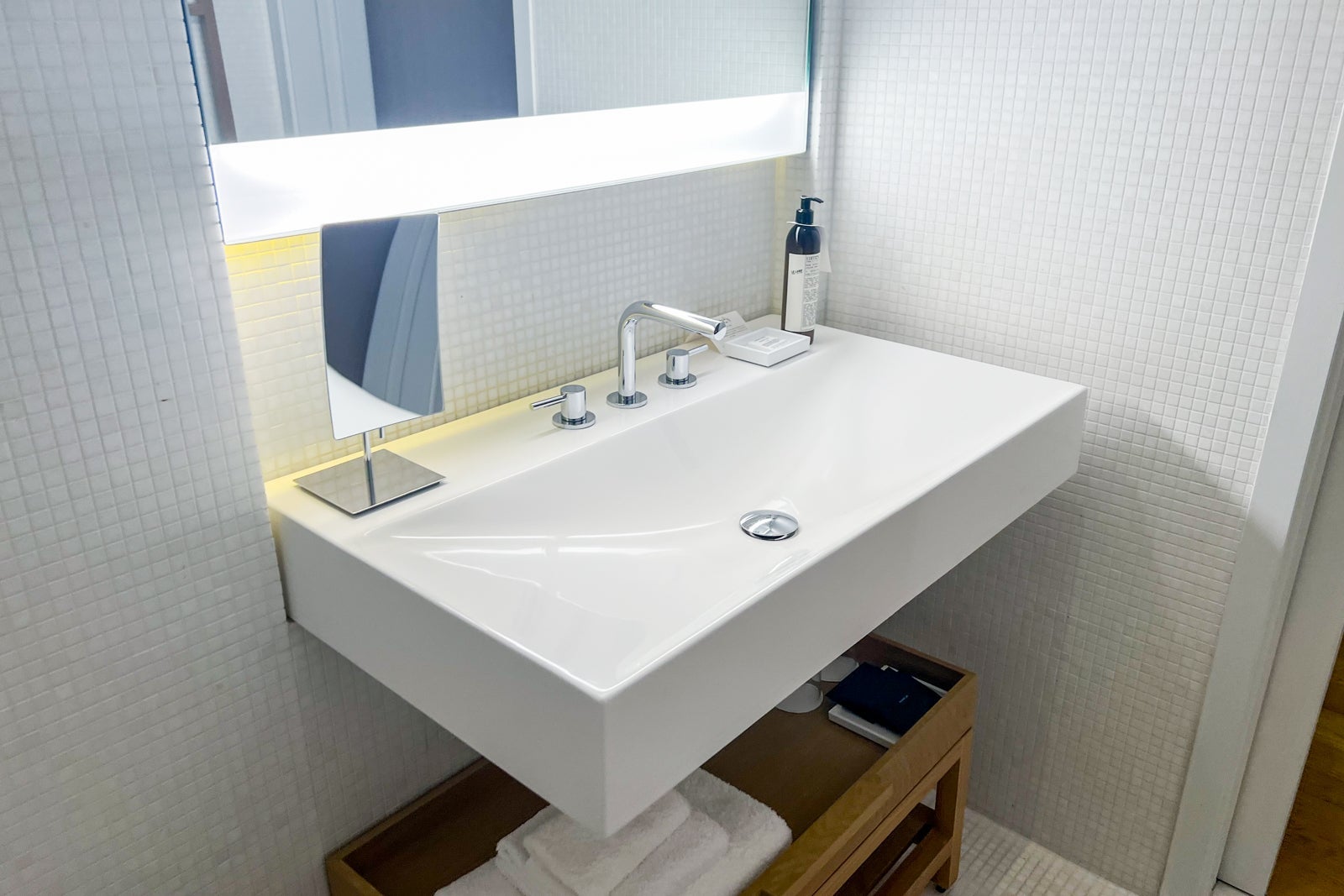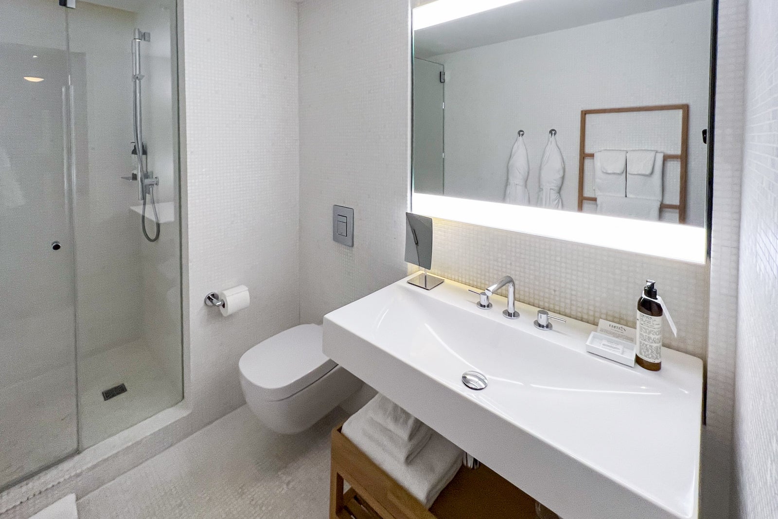 The all-white design is made up of white tiles that cover the floors, walls and walk-in shower stall. Natural wood elements beneath the long porcelain sink and on the wall for towels add an element of warmth to the space, and Le Labo toiletries in a custom woodsy, masculine scent provide a touch of luxury and exclusivity my travel companion and I loved.