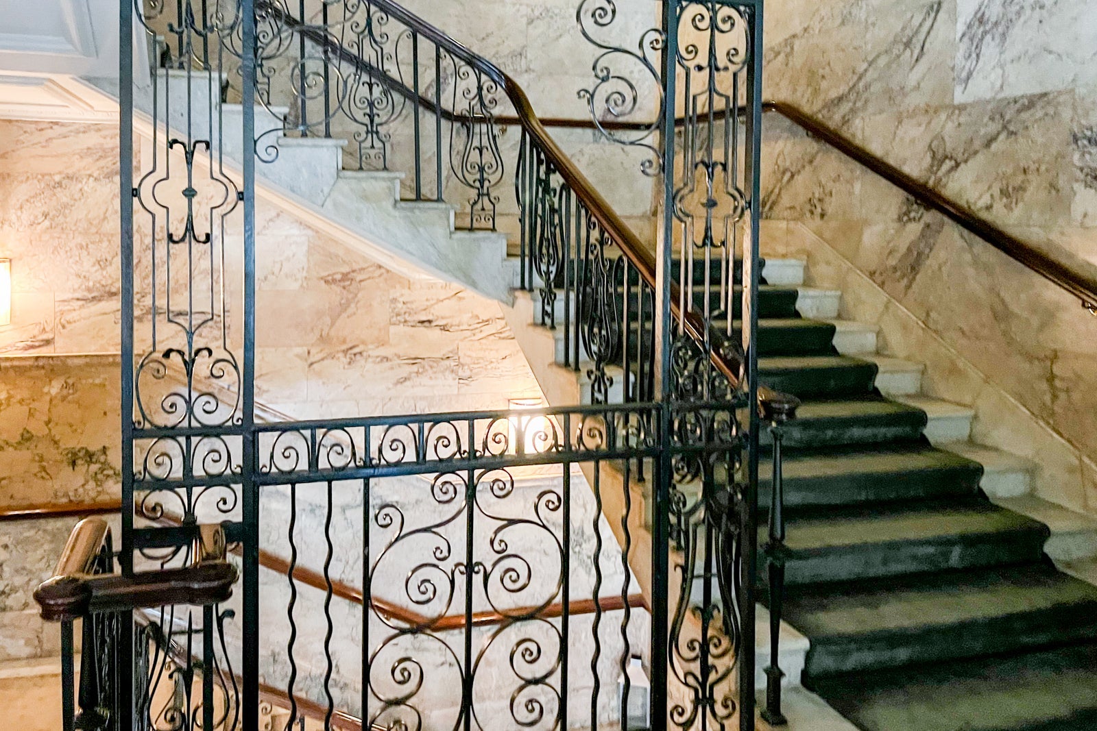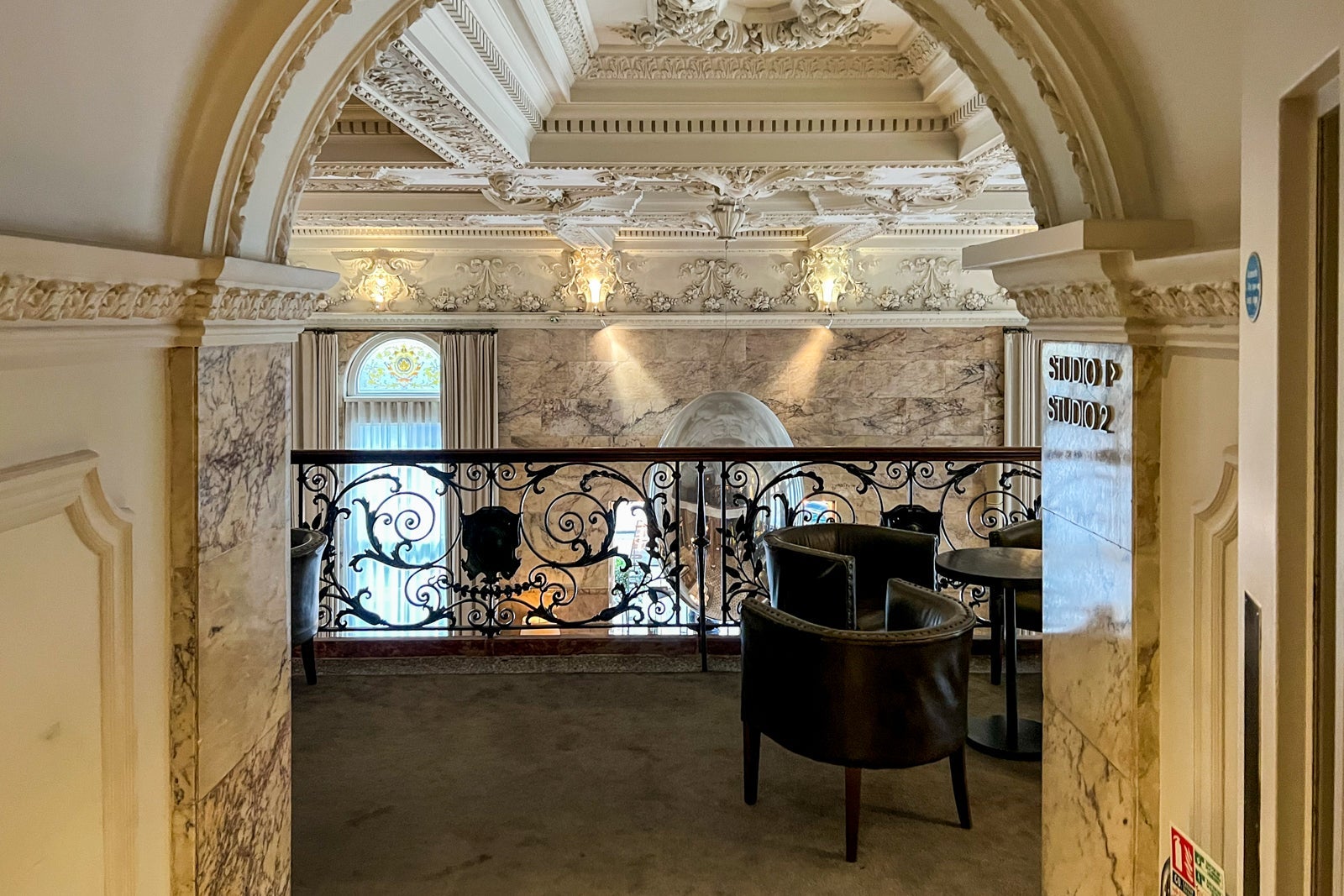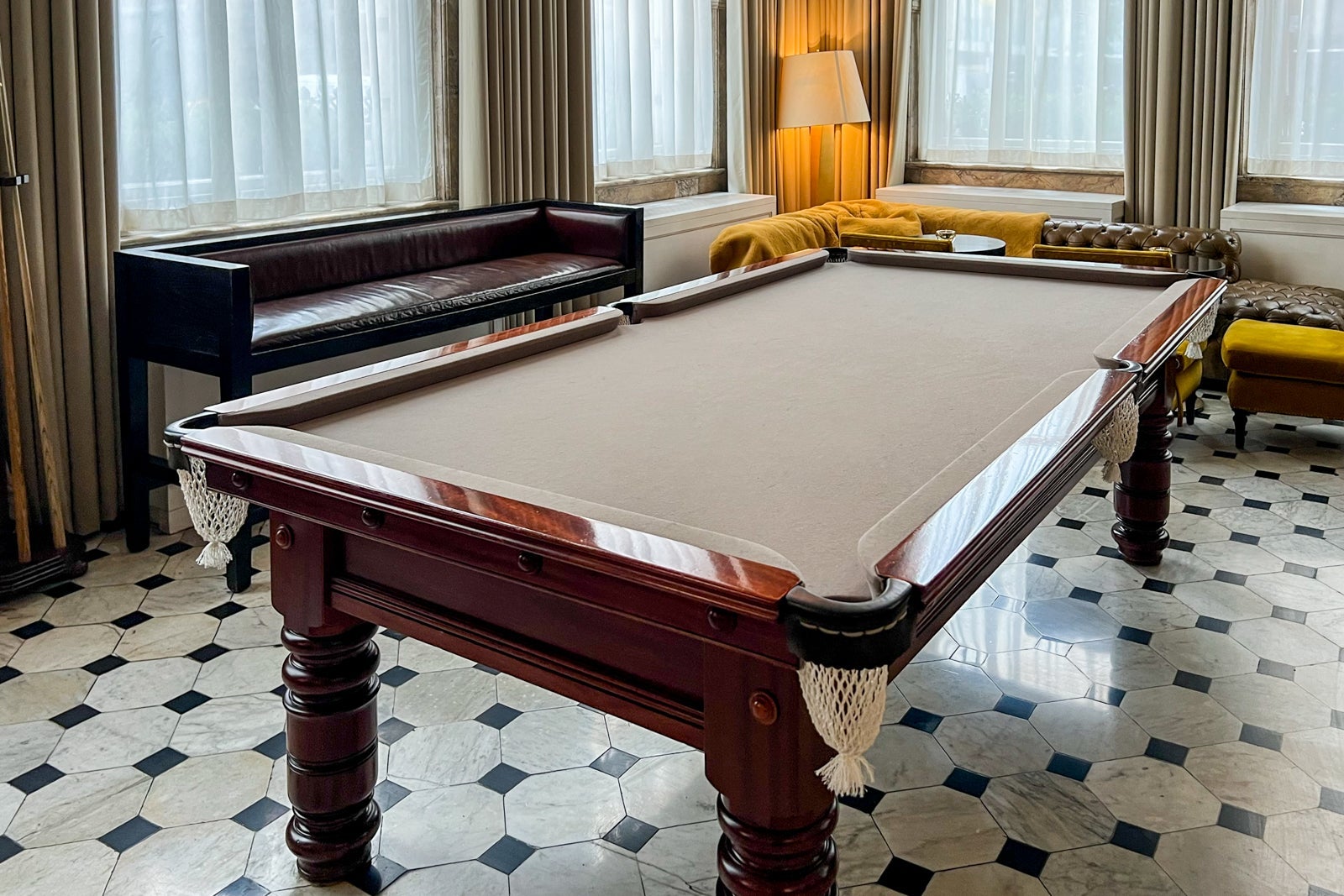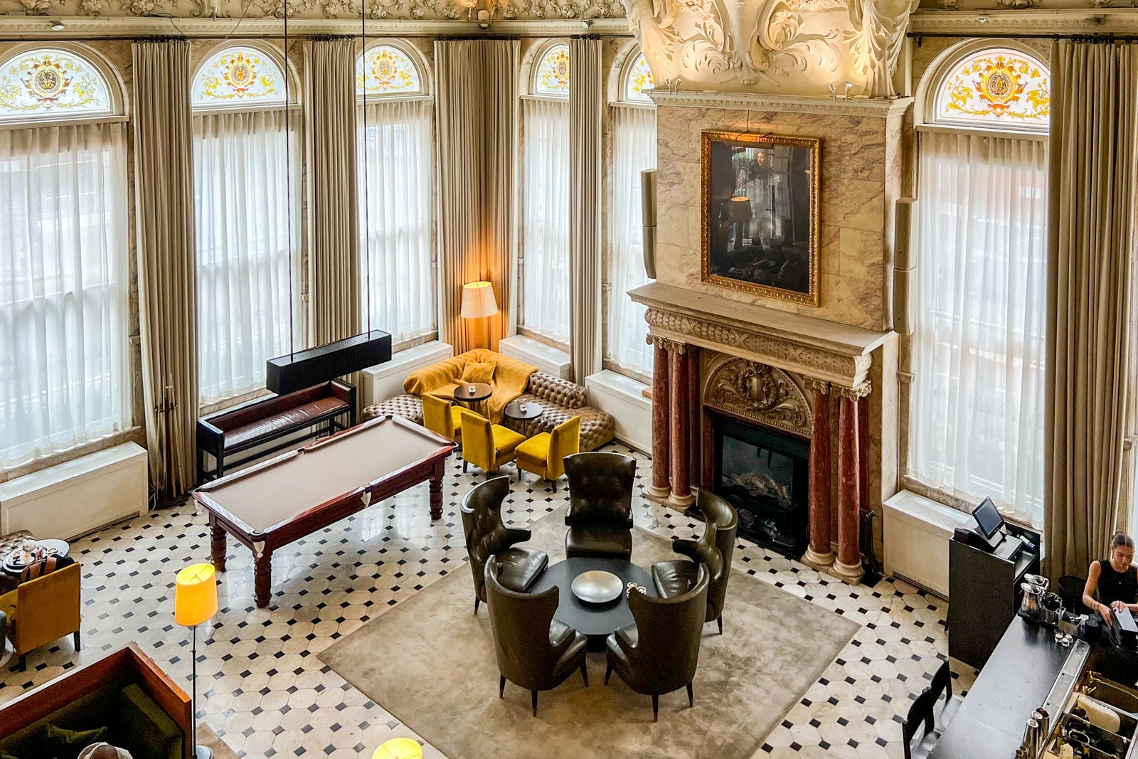 When you step into the lobby, your eyes are immediately drawn to the ornate ceiling up above, plus the grand staircase and walls of marble all around. There's a wide variety of seating options to choose from. Additionally, you'll find a classic snooker table in one corner, adding to the upscale yet relaxed atmosphere the lobby offers during the day.
