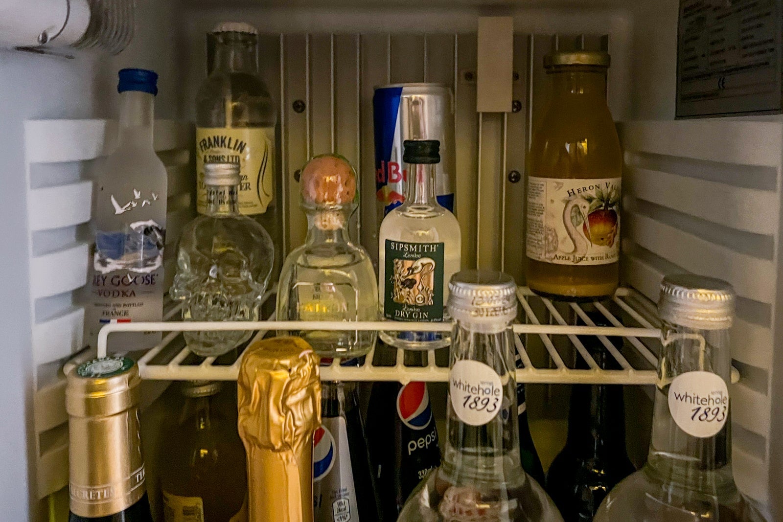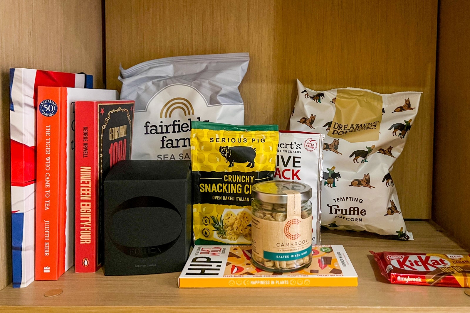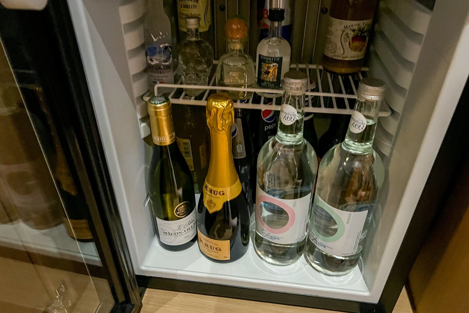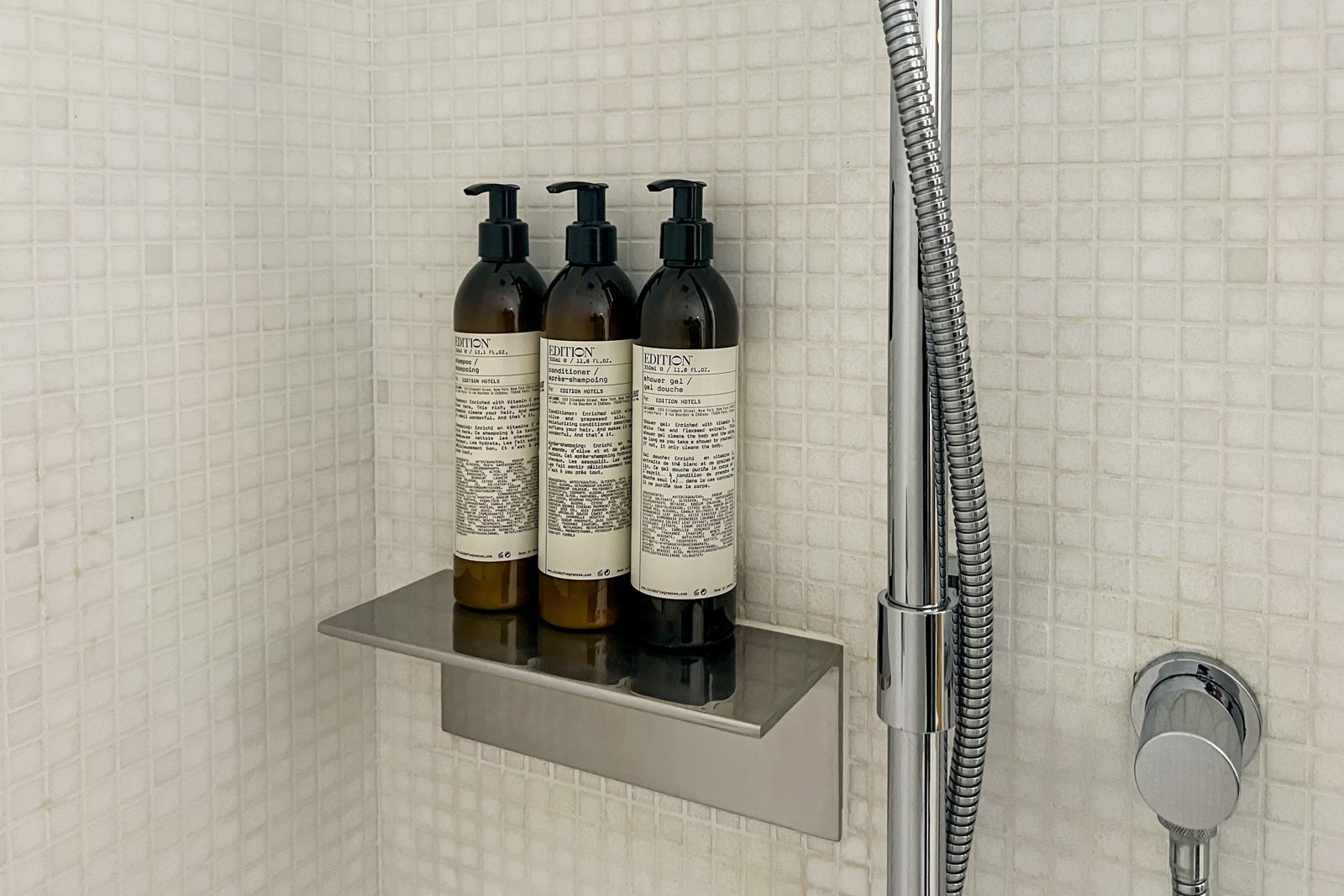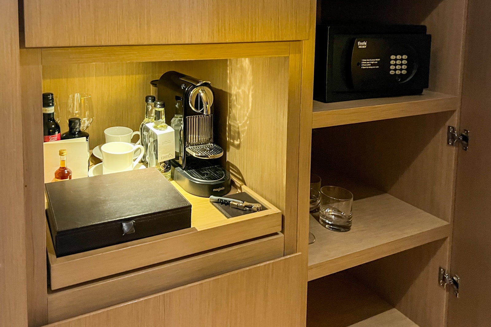 Additional features include a small seating area with two tufted club chairs; a long, thin desk beneath the flat-screen TV; and a well-stocked minibar with a Nespresso machine, complimentary bottled water from United Kingdom-based Berrington and a couple of small bottles of spirits. You'll also notice a few books alongside an assortment of items available for purchase, including an Edition candle and a mix of salty and sweet snacks, and a minifridge full of alcohol and still and sparkling water.