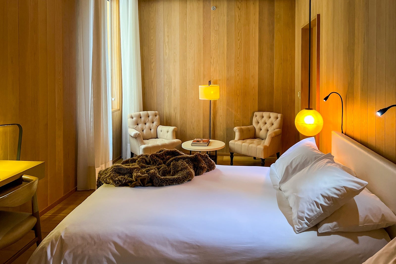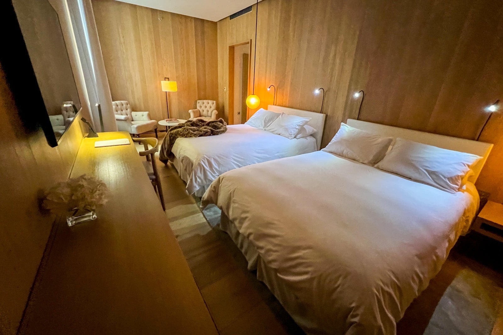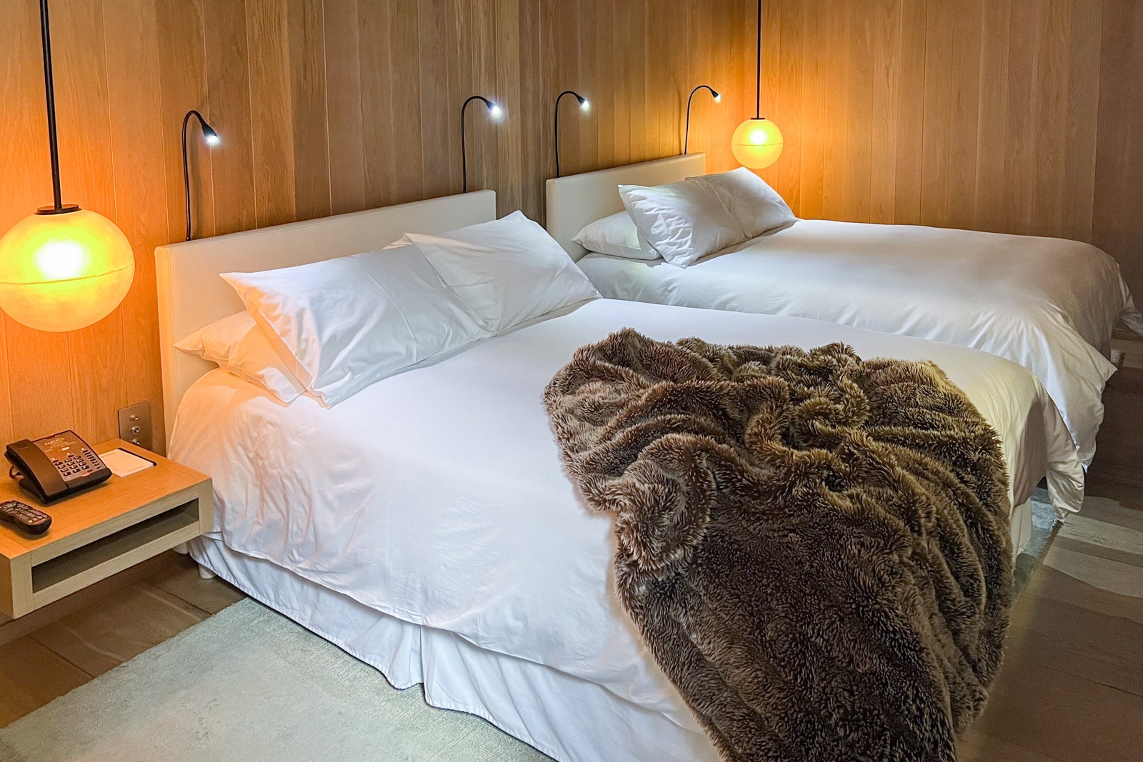 That said, I appreciated the tidy, streamlined look of the room. You'll find the signature Edition faux-fur throws on the comfortable beds, as well as pristine 300-thread-count bedding in a crisp white hue.