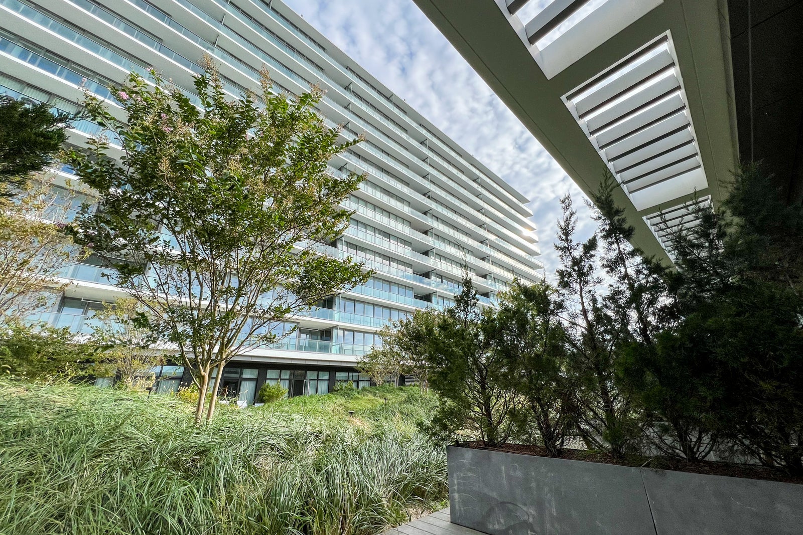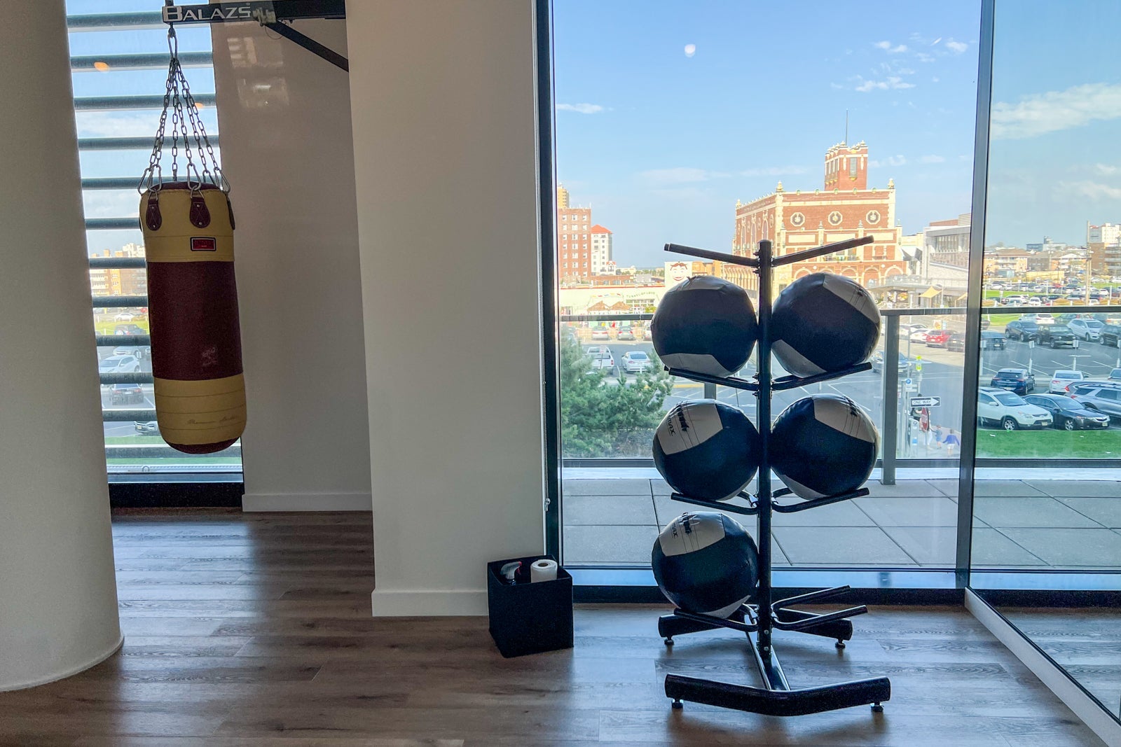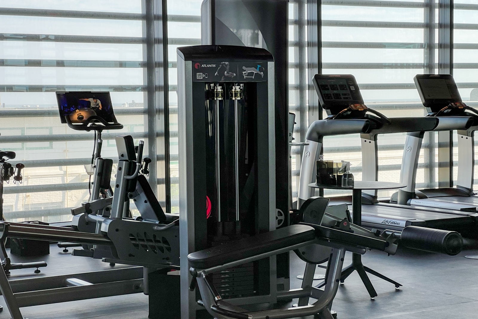 The gym was shared with the apartments above and was spacious, with lots of natural light and new equipment, including three Peloton bikes.