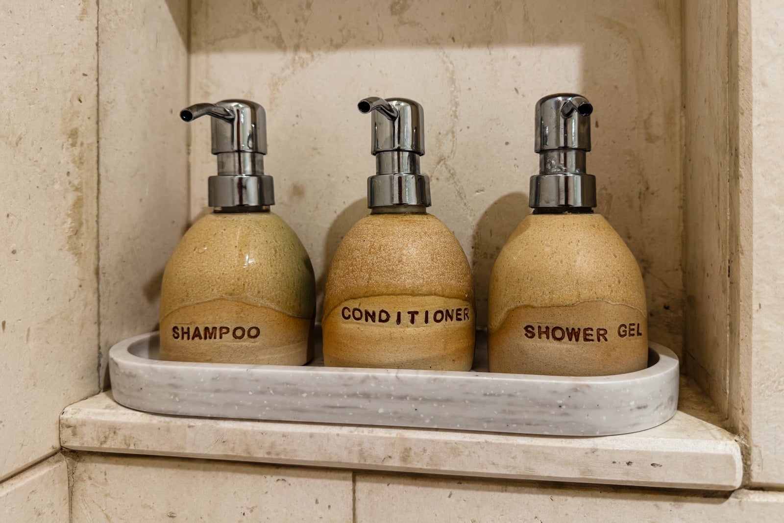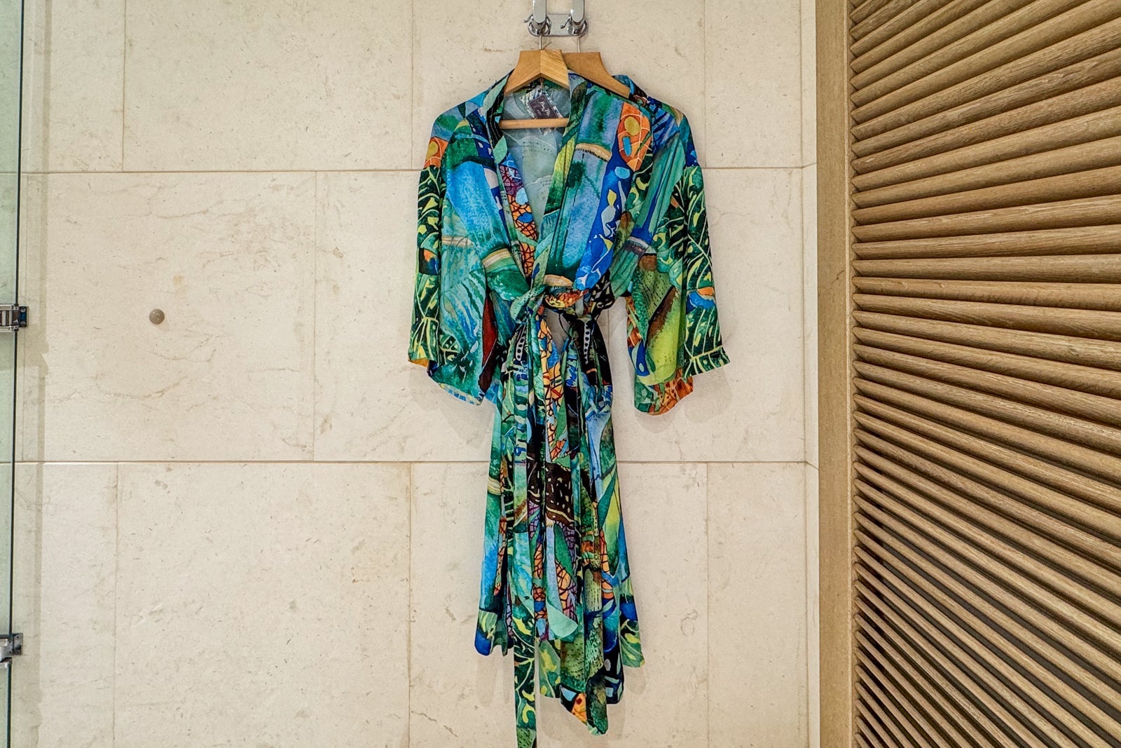 The hotel stocks locally made Belleriche skin and hair products in large-format bottles as well as brightly patterned lightweight robes with vibrant patterns designed by Seychelles-based artist Alyssa Adams.