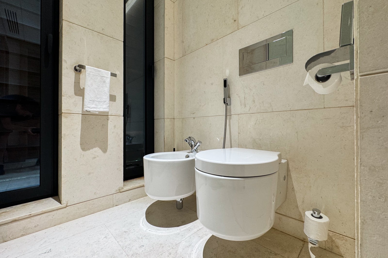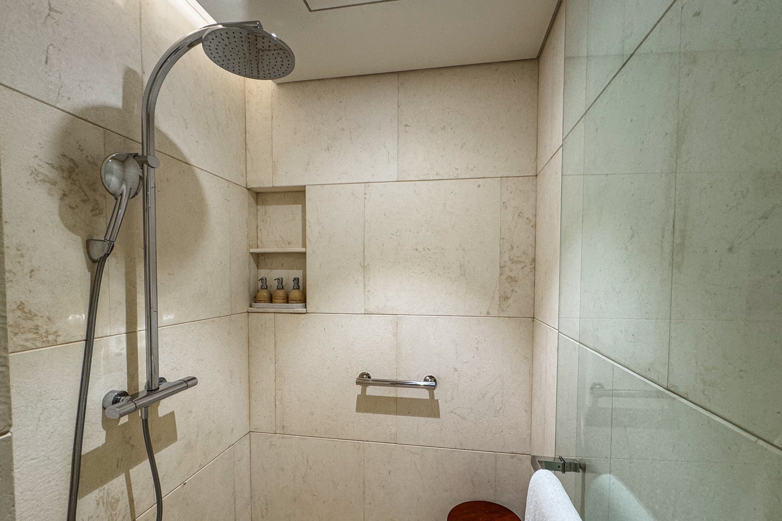 The entry foyer had copious closet space and led past sliding wooden doors into the generous, granite-tiled bathroom with dual vanities and separate stalls for the toilet and the walk-in shower with overhead and handheld showerheads.