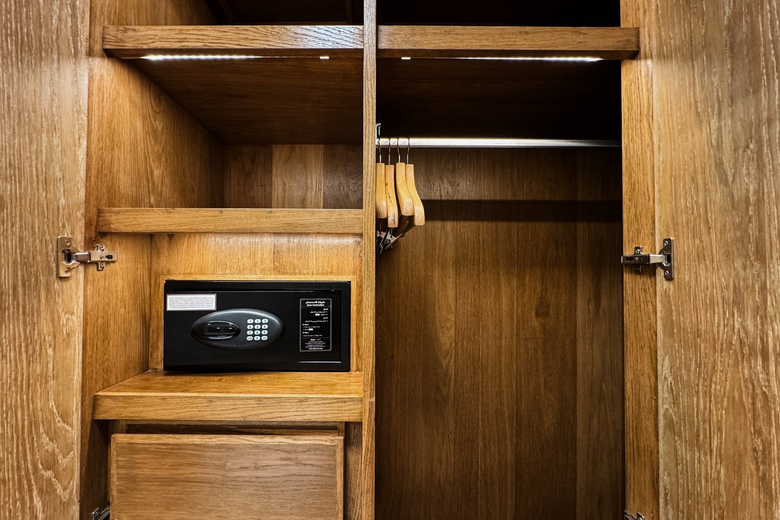 There is a wheelchair-accessible King Deluxe room with a 32-inch-wide door and various features such as lowered beds, counters and room controls, as well as grab bars in the bathroom and emergency pull cords.