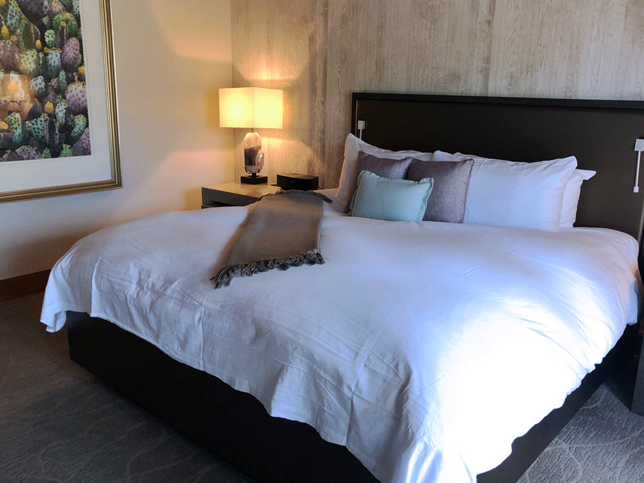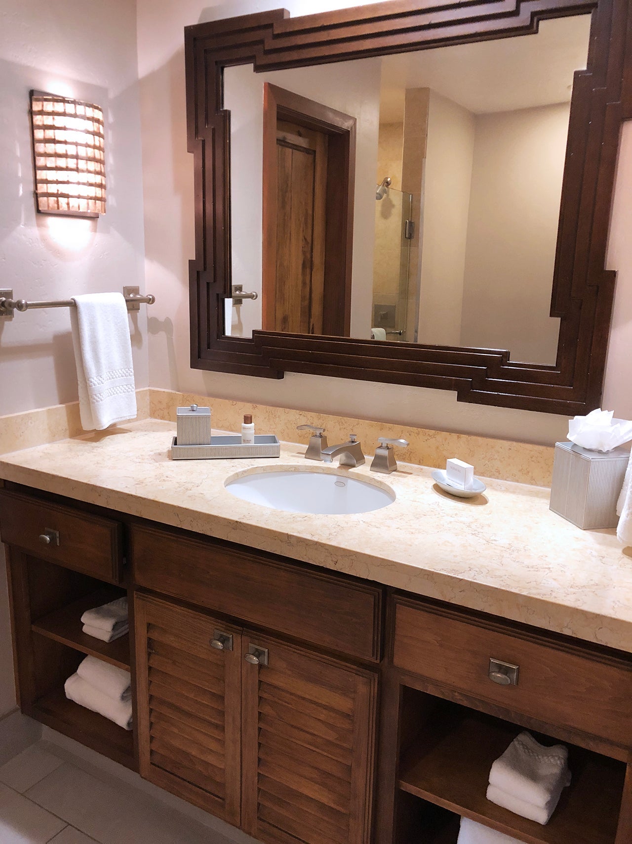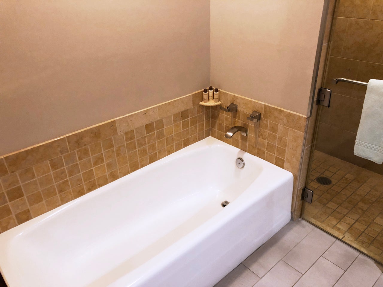 The bathroom had a tub and separate shower that were both unremarkable but fine. Aside from the amazing bed, the room was comfortable but perhaps a notch or two below what you might expect for the price, especially if you were paying with cold hard cash. The property has excellent bones, but the rooms, and especially the bathrooms, are approaching time for a refresh, given the high-end nature of the resort.