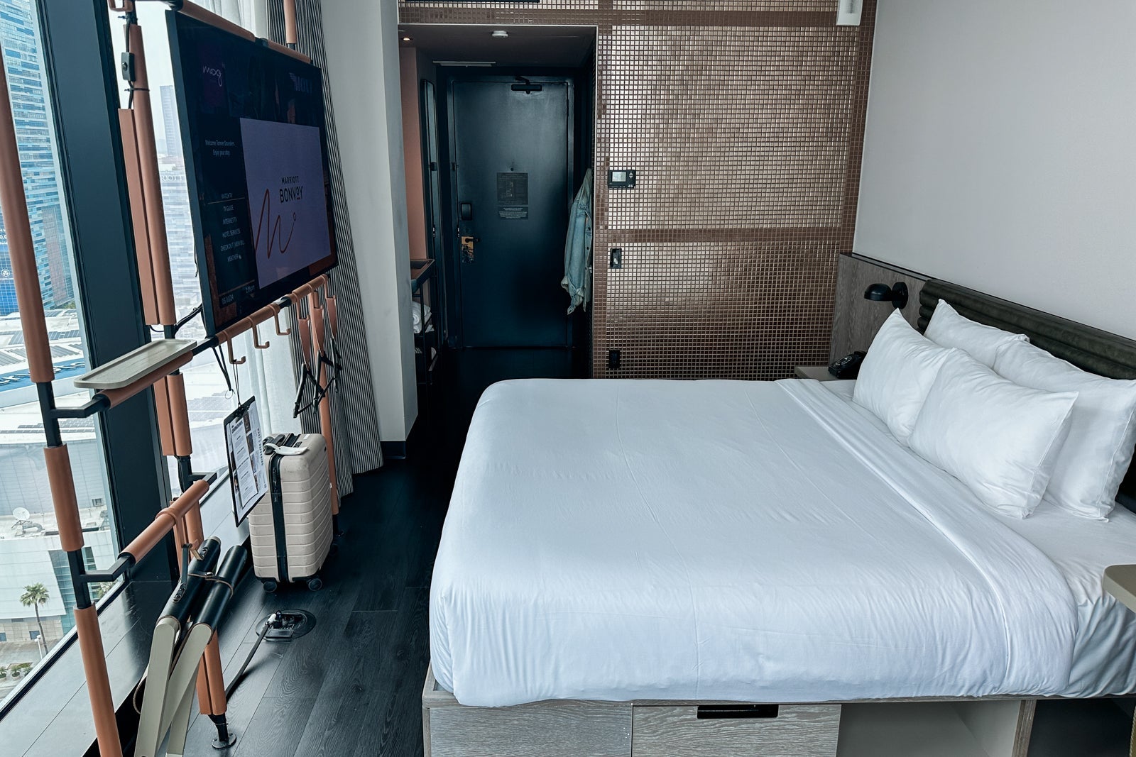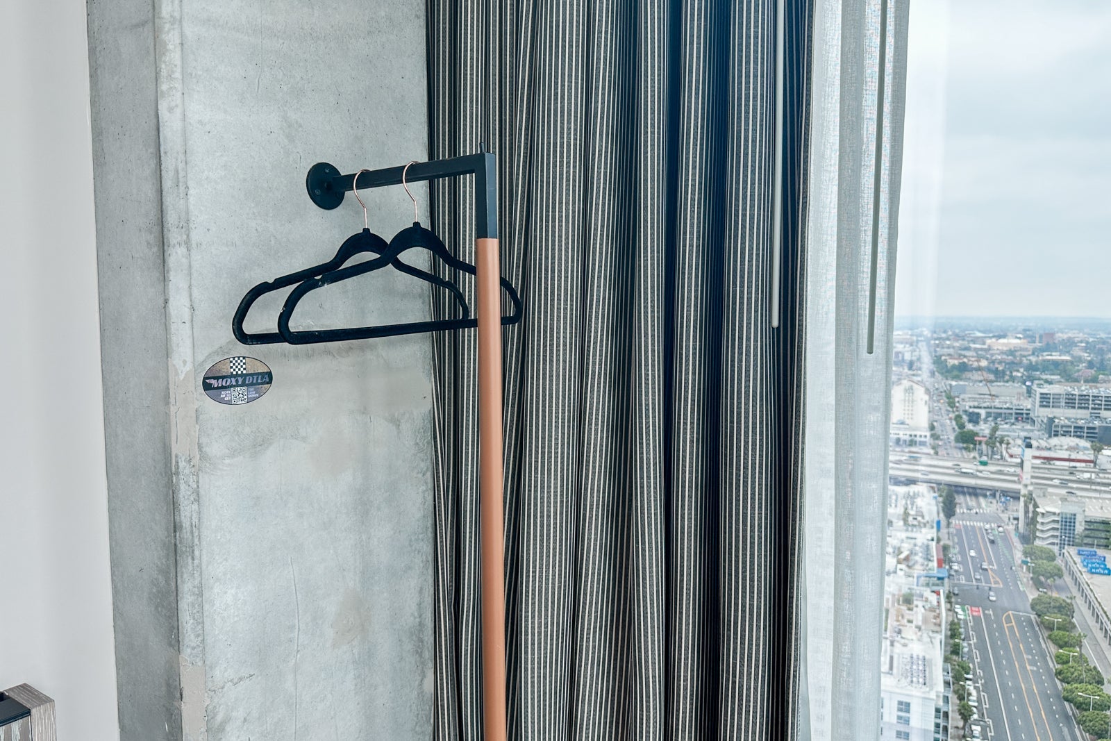 Moxy Downtown Los Angeles has 380 rooms, and even though they come in a few different configurations, they all have a similar aesthetic and similar features, like a design-forward take on Moxy's signature peg wall holding the TV and clothing hangers.