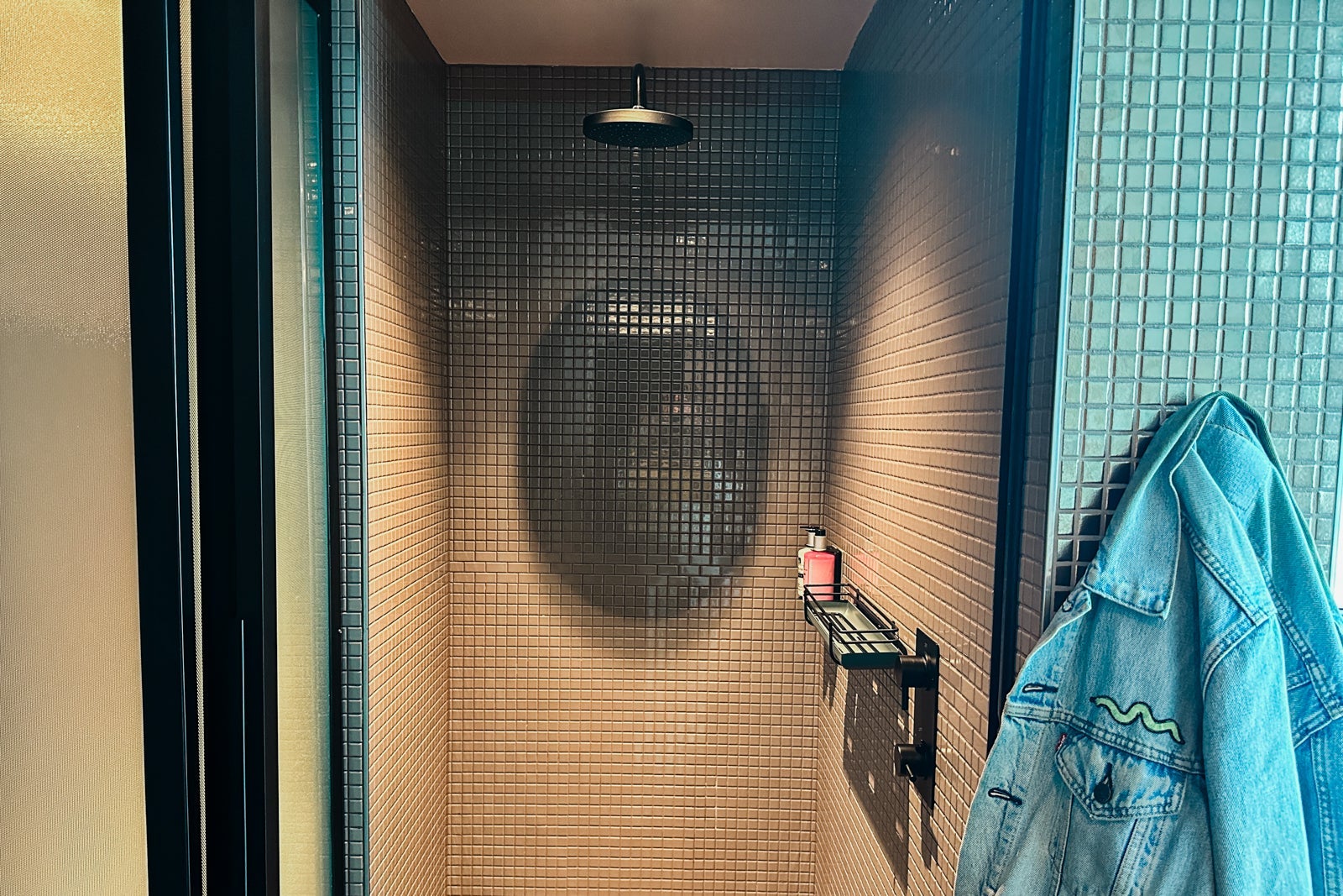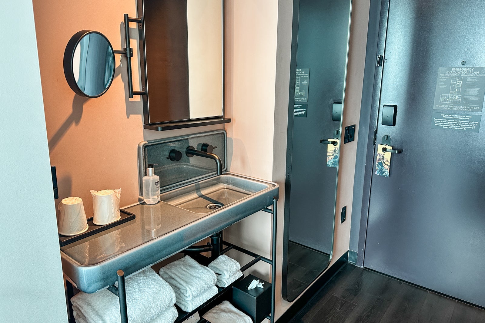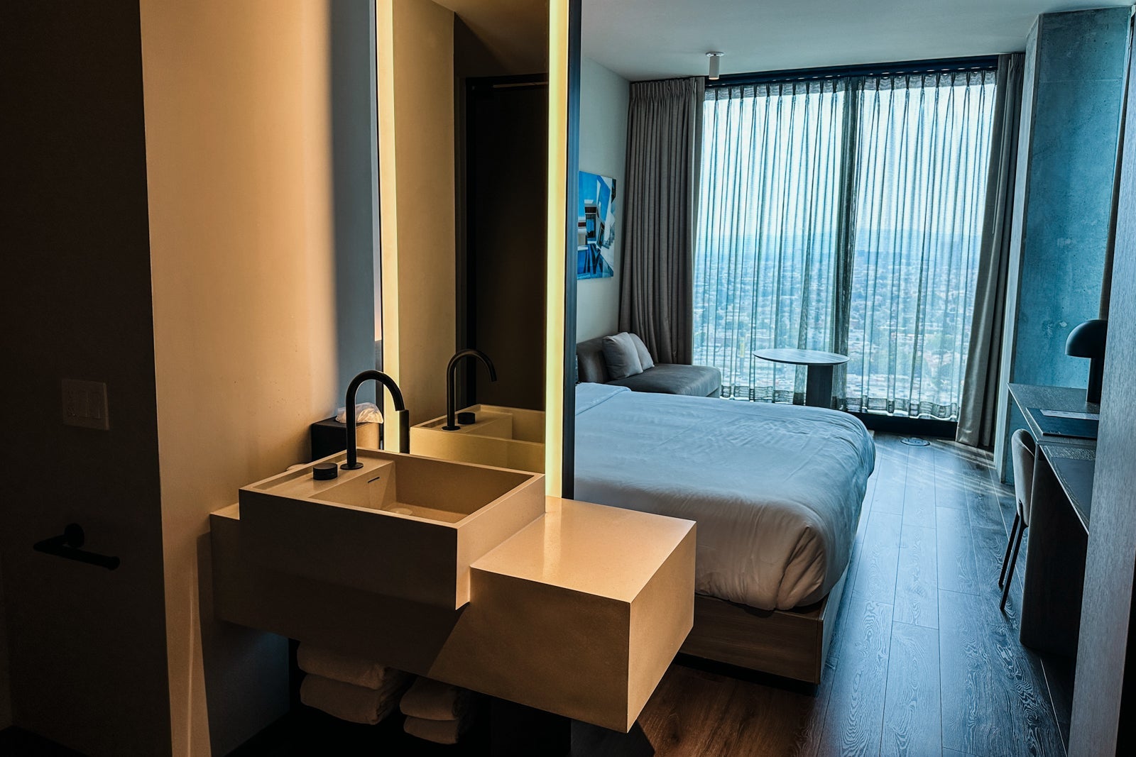 The bathroom area was also minimal, with the sink and mirror floating off to the side and, as in the Moxy, the shower and toilet divided into two rooms across from the vanity.