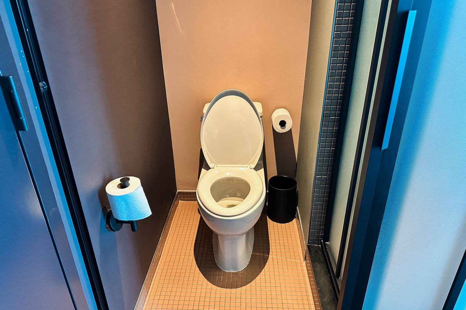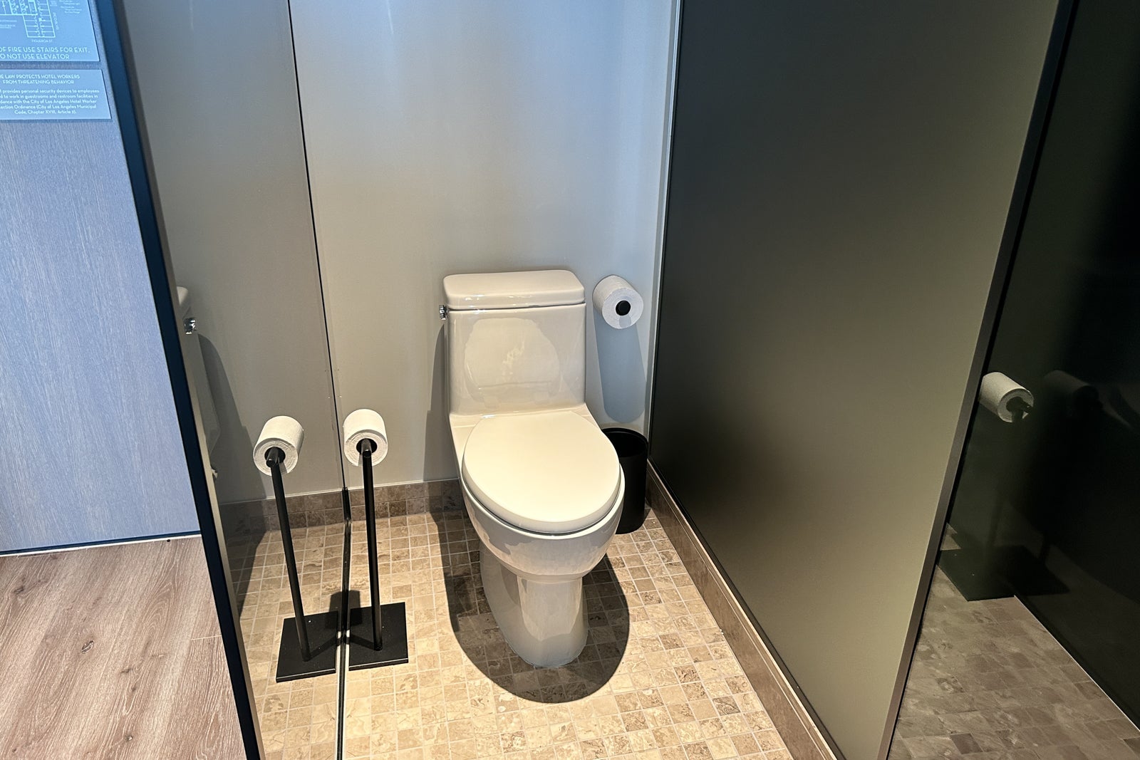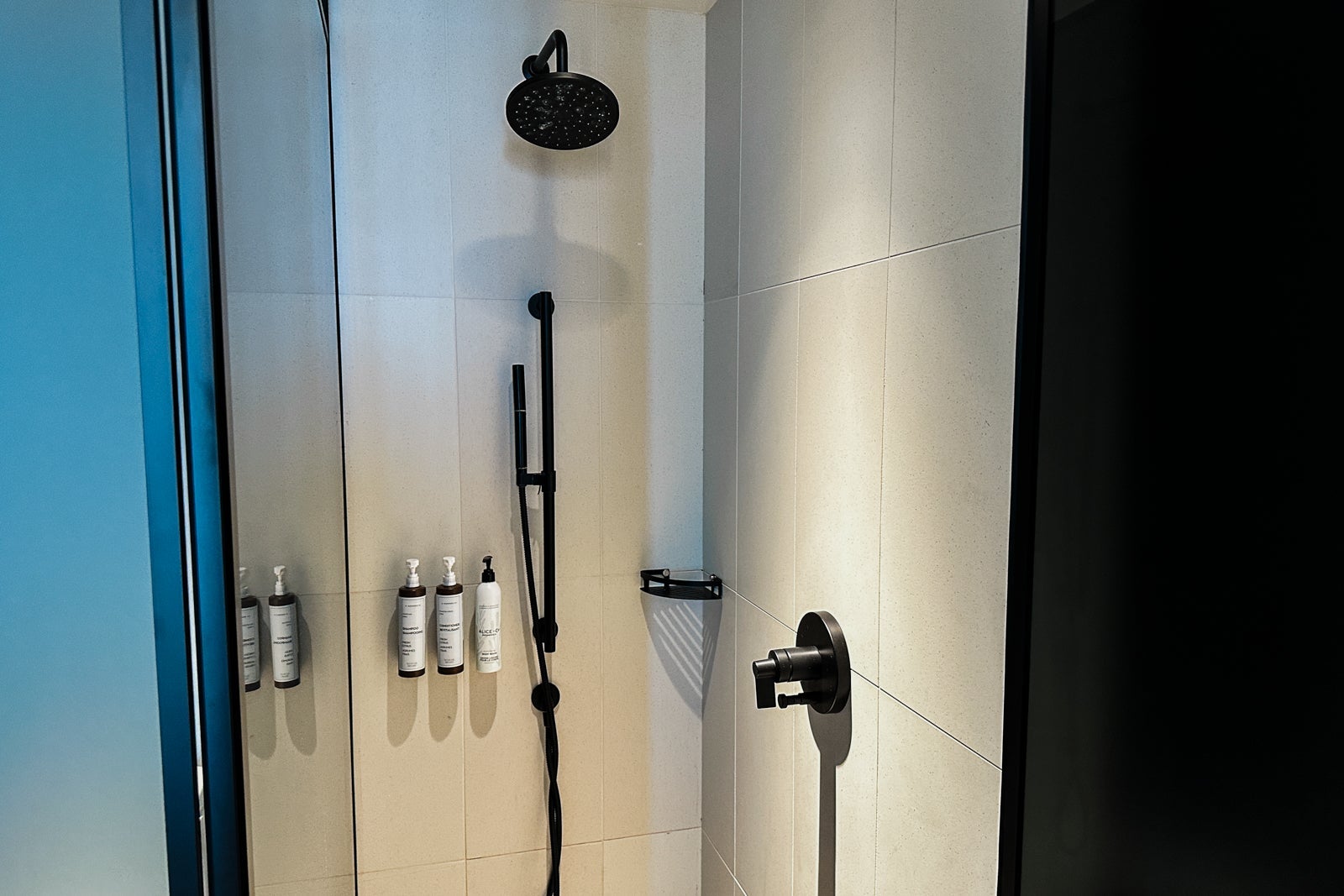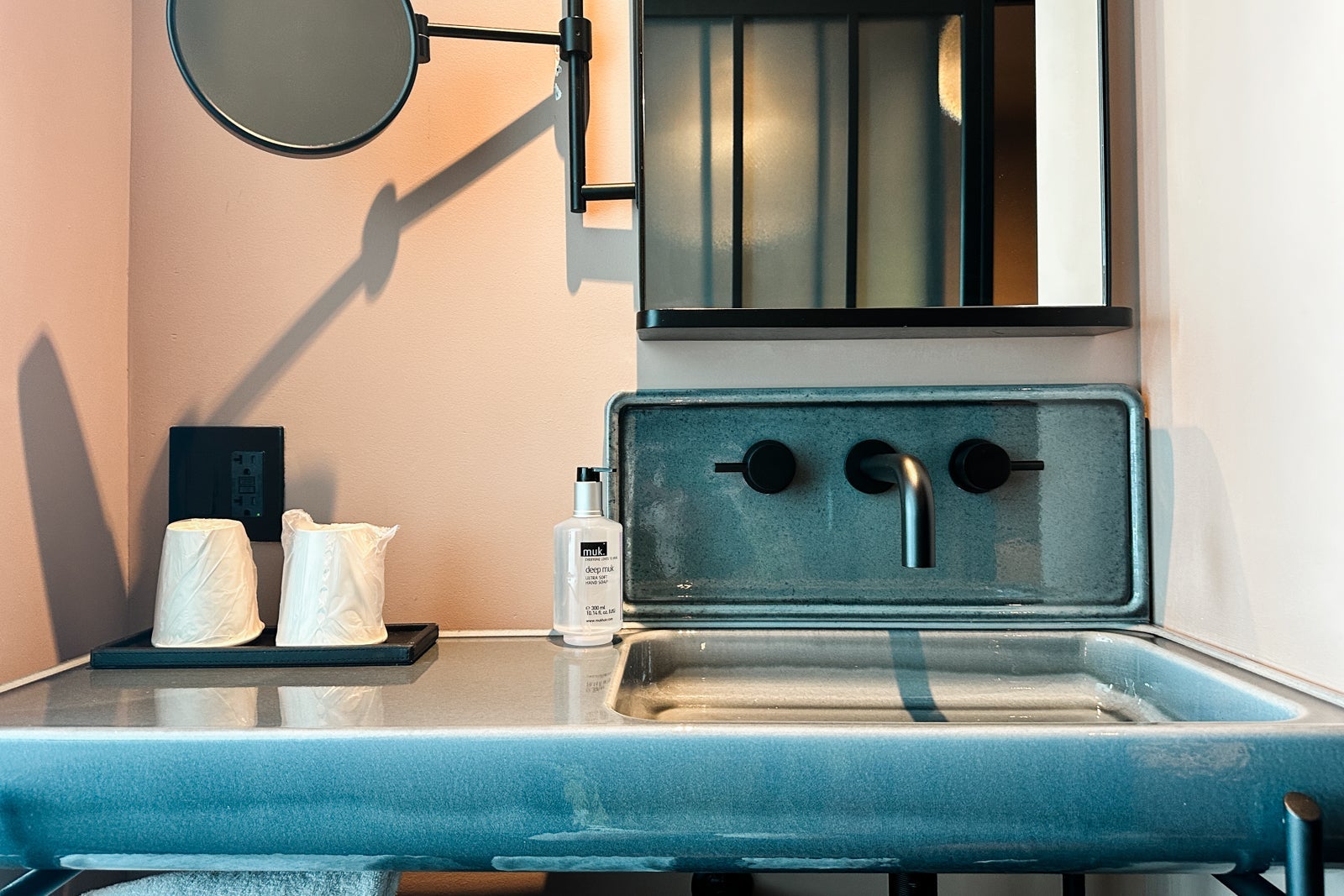 The bathroom area was also minimal, with the sink and mirror floating off to the side and, as in the Moxy, the shower and toilet divided into two rooms across from the vanity.