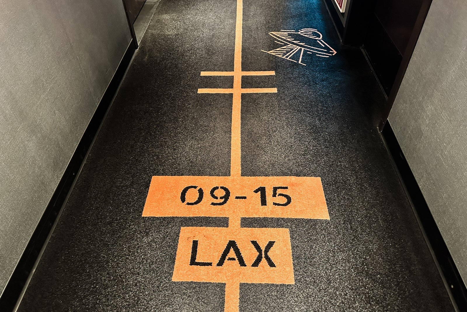 The hallways leading to the rooms in the Moxy had fun carpeting, sort of mirroring an airport runway — but with a little alien-themed twist. This area also featured help-yourself amenity closets where you could grab extra towels and other things one might need during a stay.
