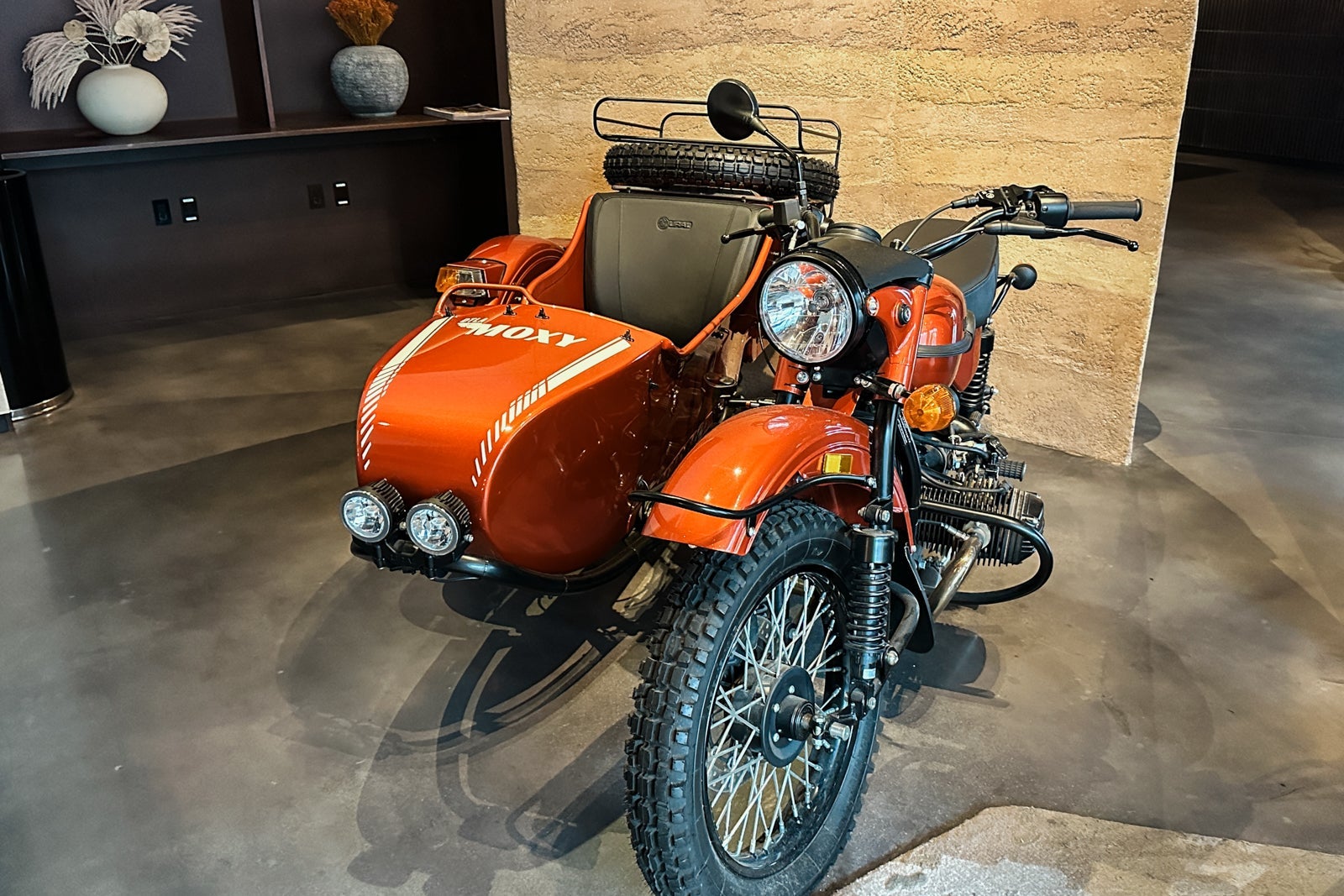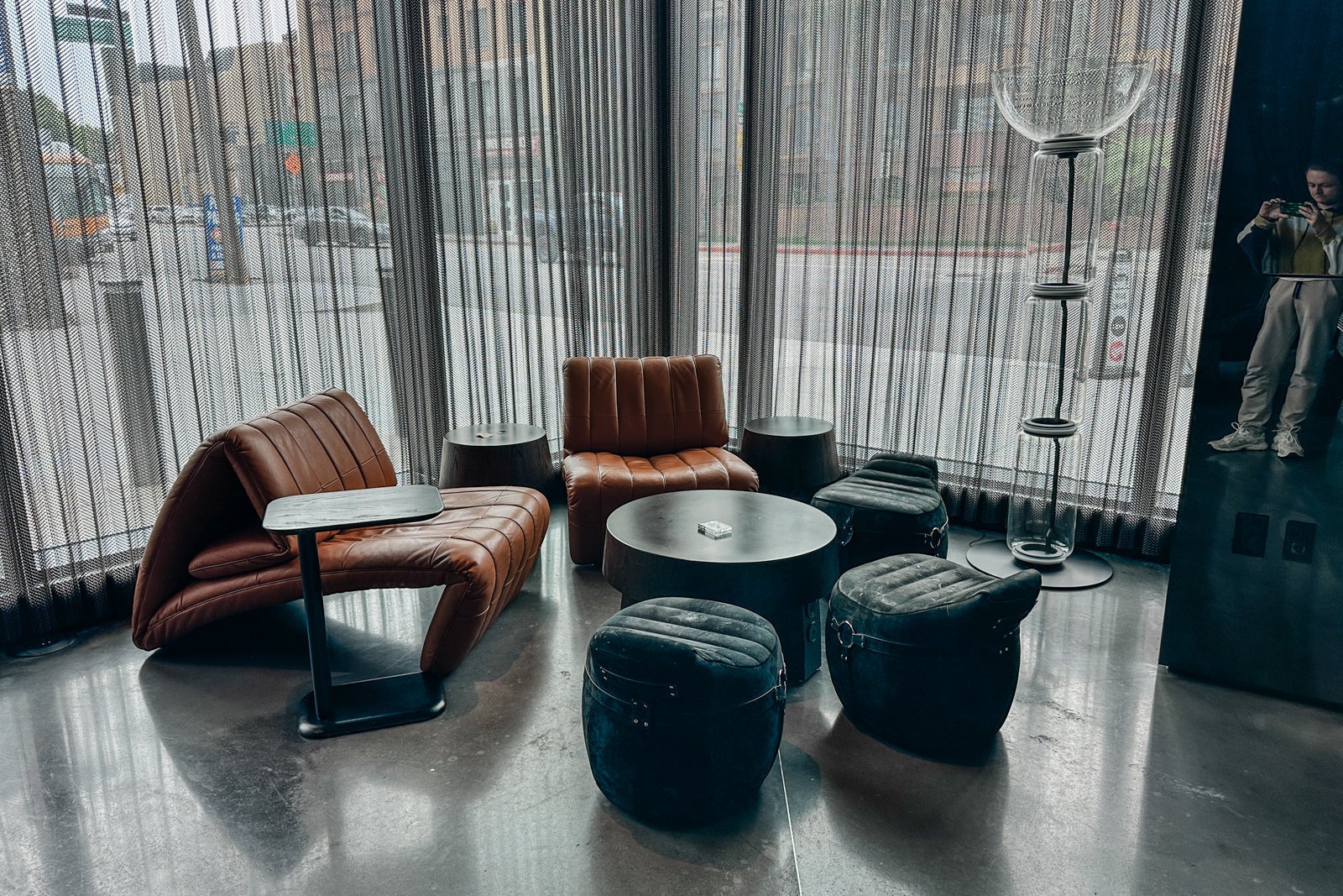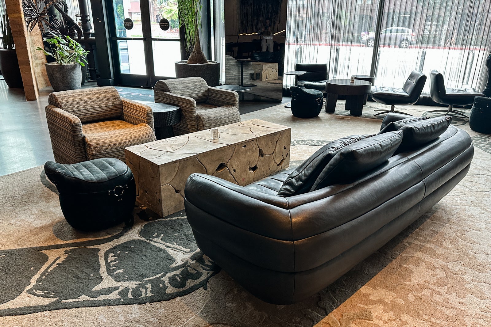 Moxy Downtown Los Angeles was inspired by the 1969 film "Easy Rider" and the spirit of Southern California. Upon entering the lobby, I noticed green succulents, concrete floors and a massive snake rug dominating the public seating area where people hung out or worked at large tables. A motorcycle with a sidecar was the star of many guest photographs. The vibe felt distinctly cool, and I enjoyed spending time in the lobby.
