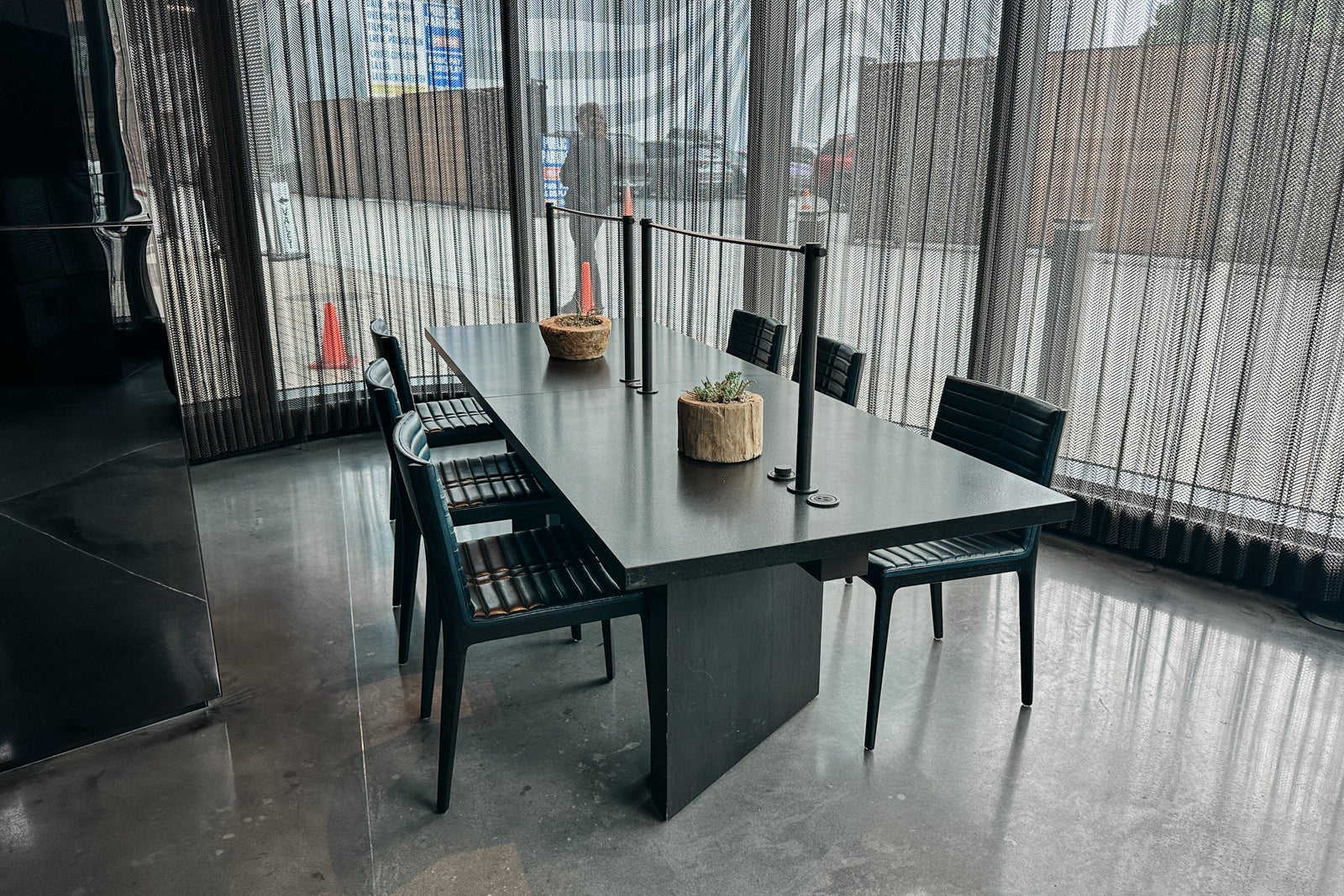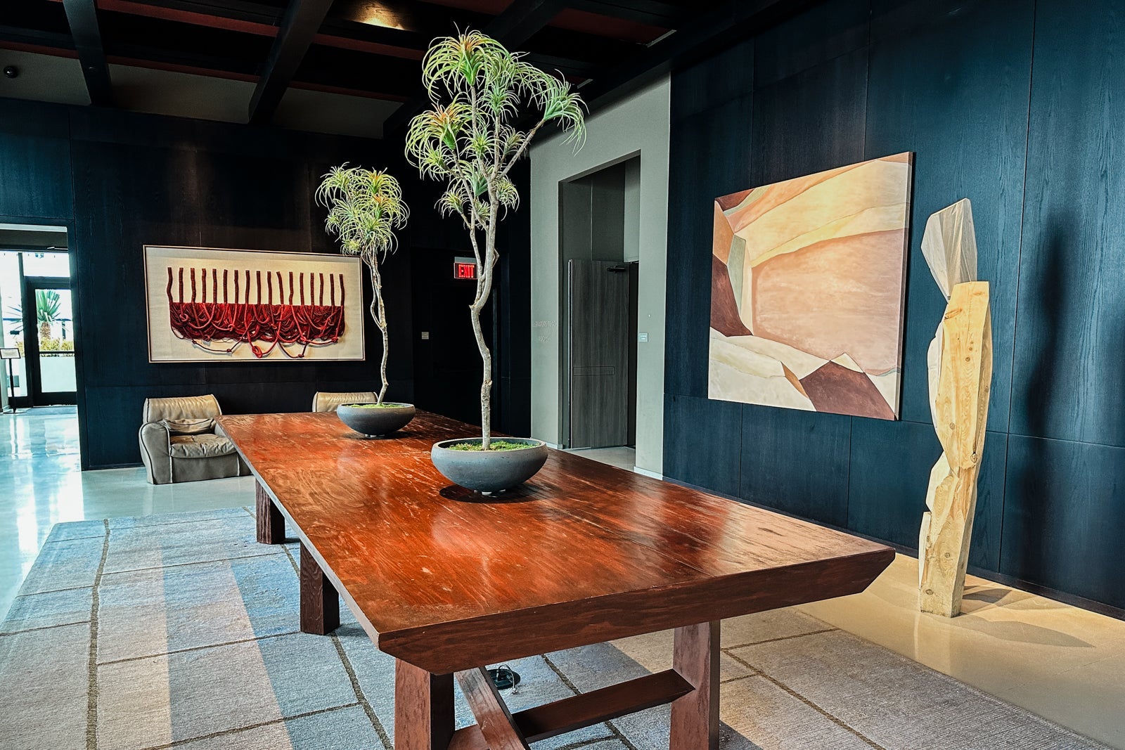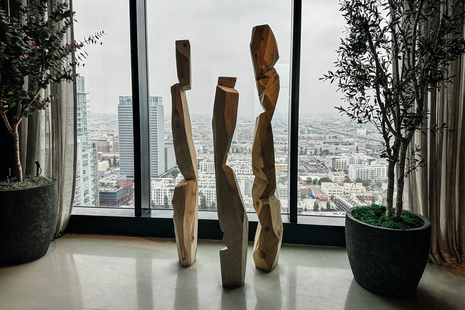 Throughout the lobby, minimalist elements like elegant potted trees and rock sculptures were an earthy yet chic reminder of California's various landscapes. To one side of the lobby, a library with communal seating stayed busy throughout the day. The massive wall of windows also stayed crowded with guests taking in sweeping views of the City of Angels.