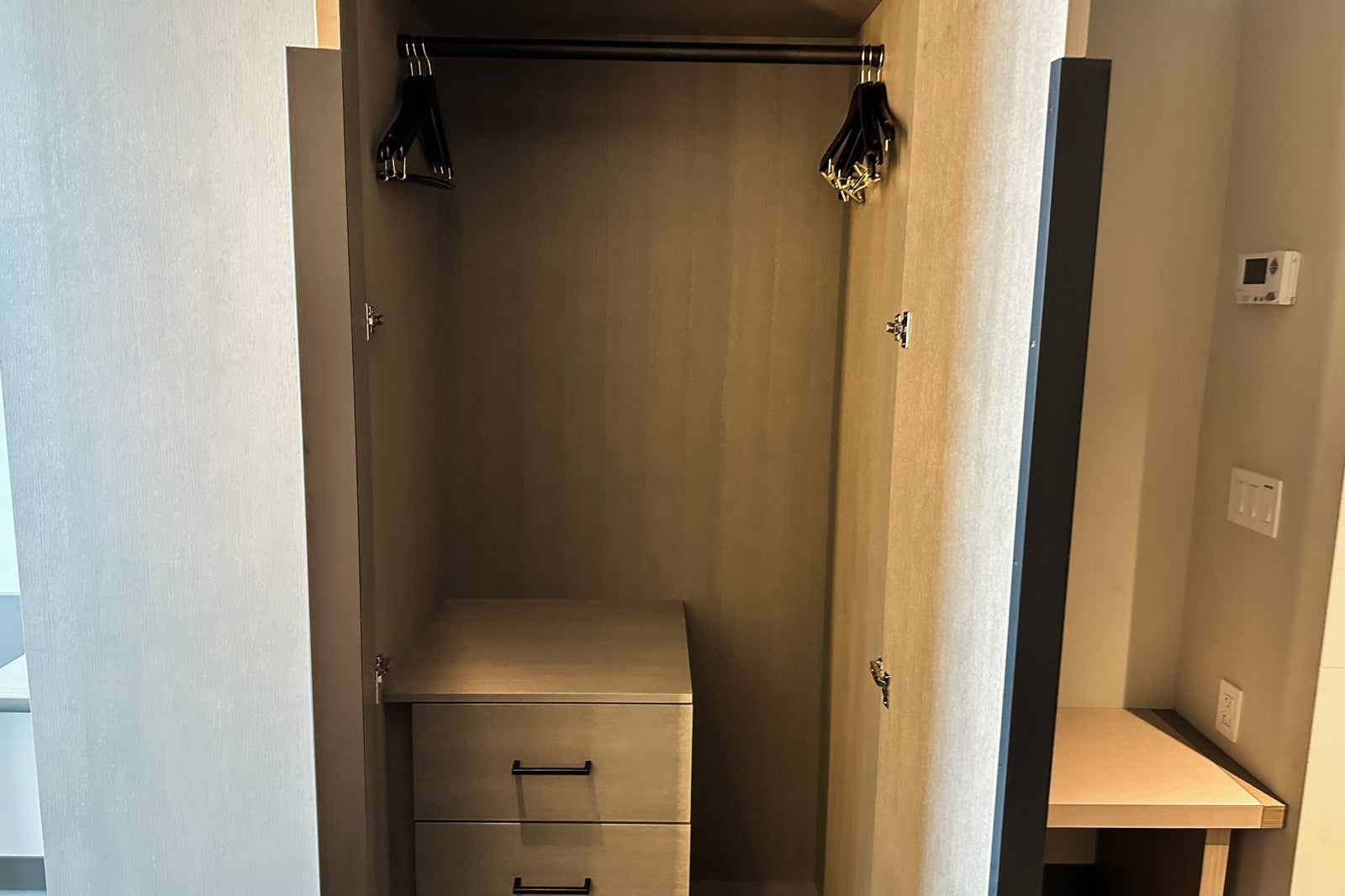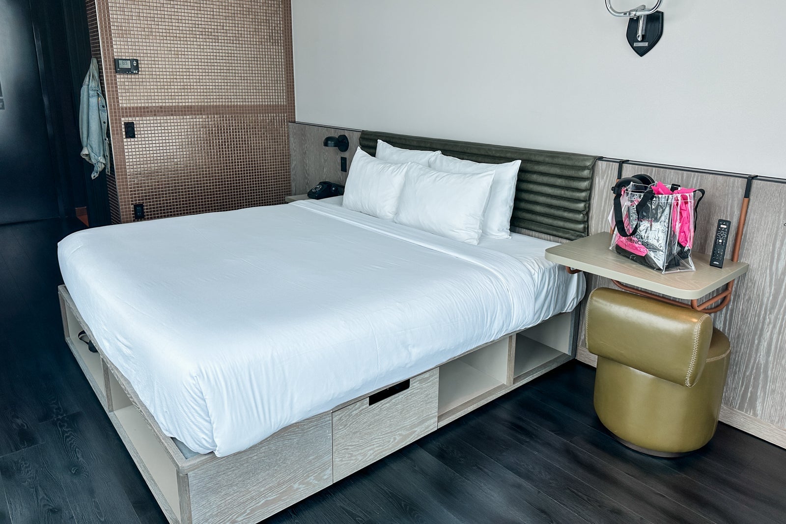 Though Moxy rooms are typically small, they offer smart storage solutions, like underbed storage and multiple places to hang clothes.