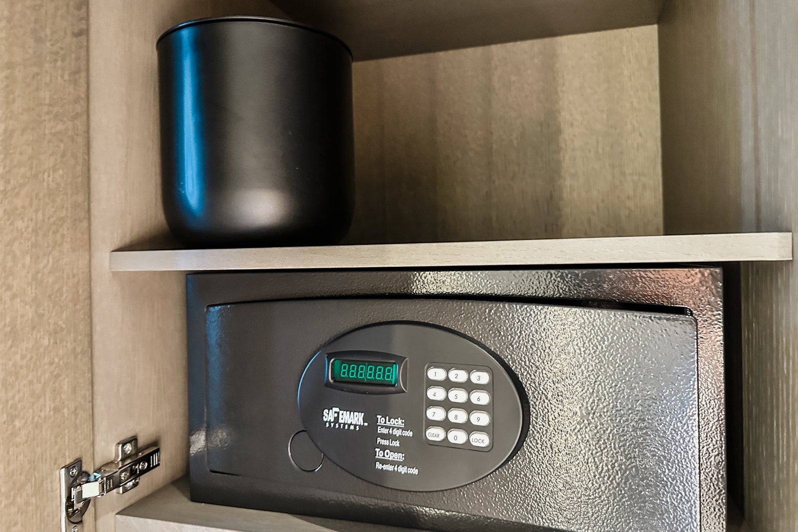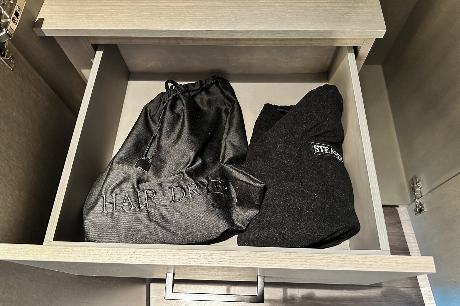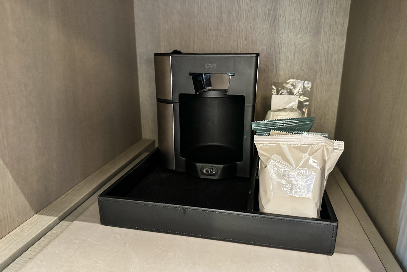 This room also had a closet with shelves and hanging space as well as amenities throughout like a safe, a basic coffee maker, a hair dryer and a steamer.