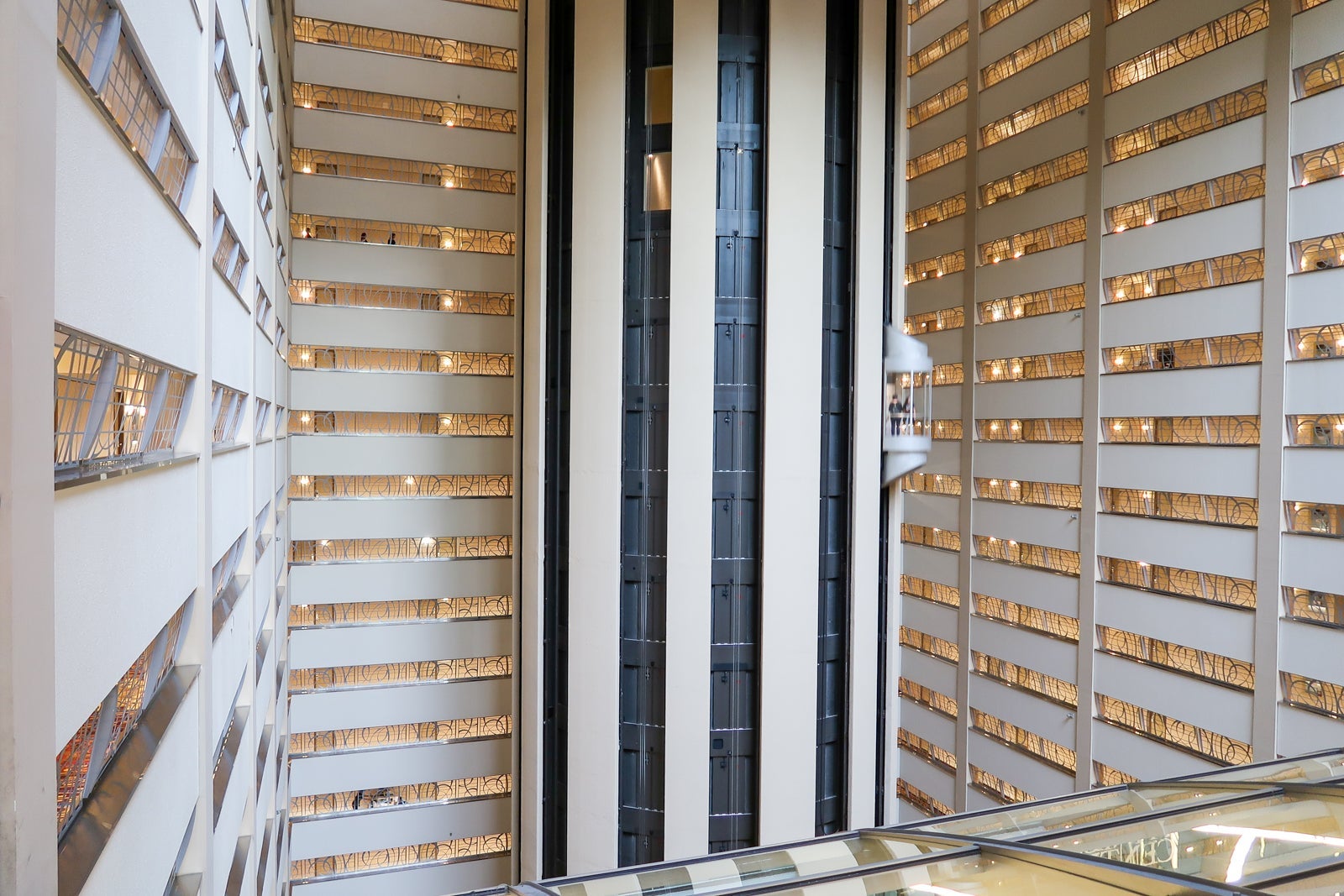Several of the elevators had glass walls, and you got a fantastic view of the interior of the huge building as you whizzed up and down.