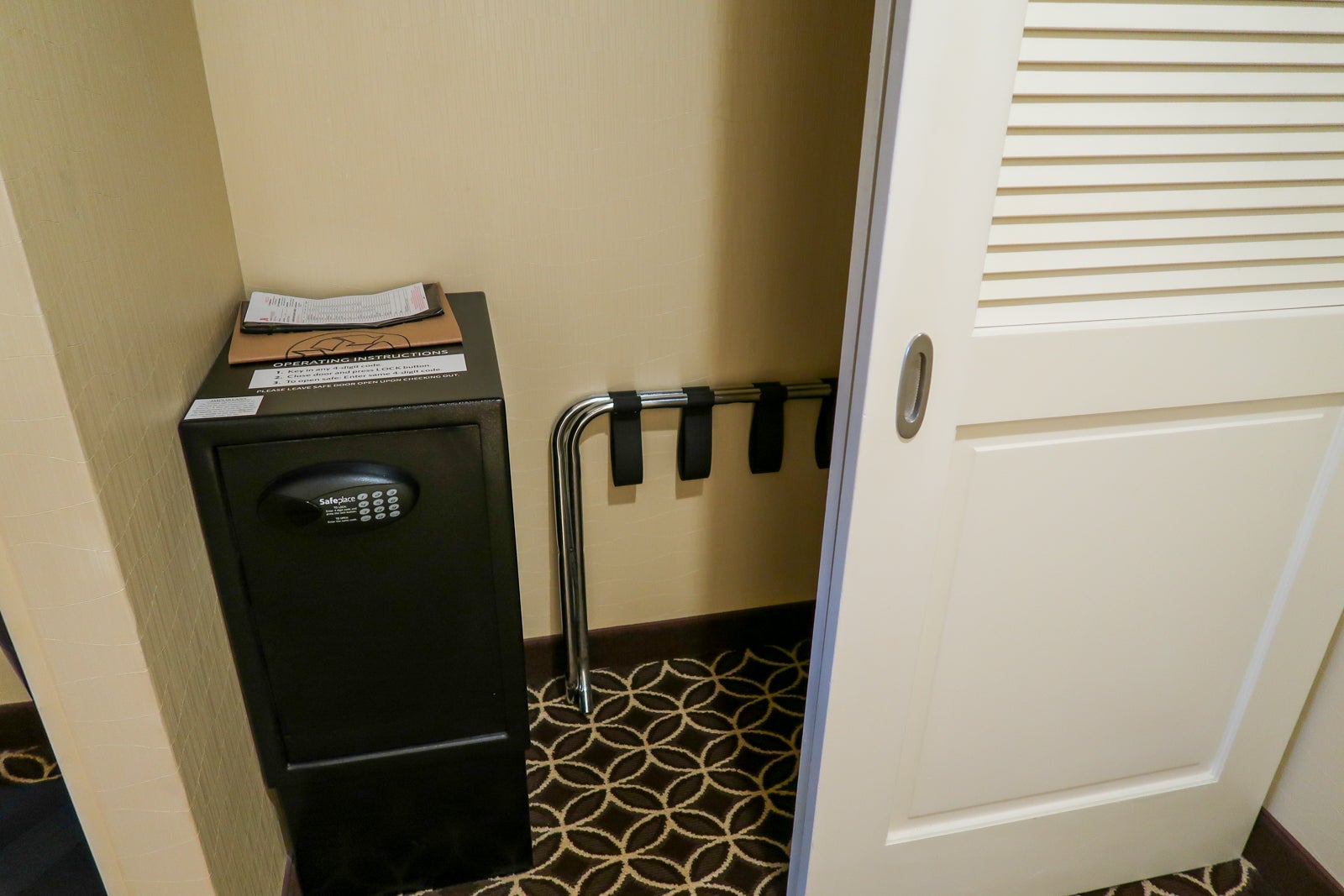 Opposite the bathroom and next to entrance door was a closet with a safe and luggage rack.