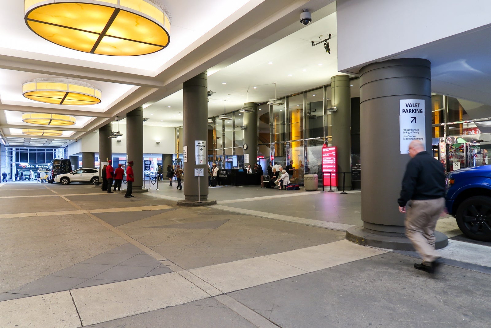 A hotel this size covered in gigantic billboards was unlikely to have a luxurious, personalized entrance or check-in experience. Down either side street were the vehicle and pedestrian entrances.