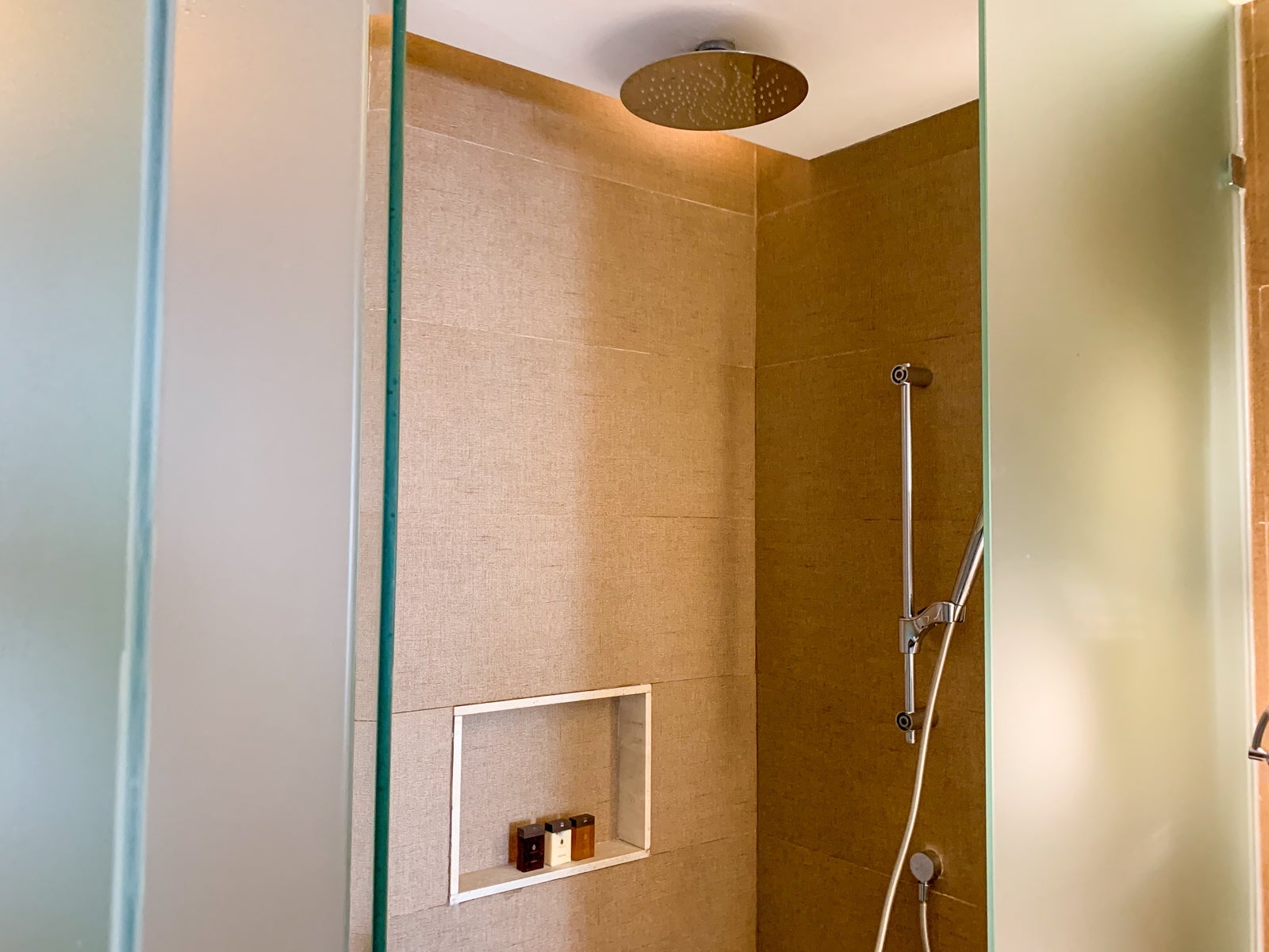 Sure, there was a beautiful, giant soaking tub and a nice, standalone rainfall shower. But neither was ideal for young kids. The tub was too deep for any normal-sized parent to reach in and comfortably bathe his or her child. And not every child will take a shower, especially by themselves.
