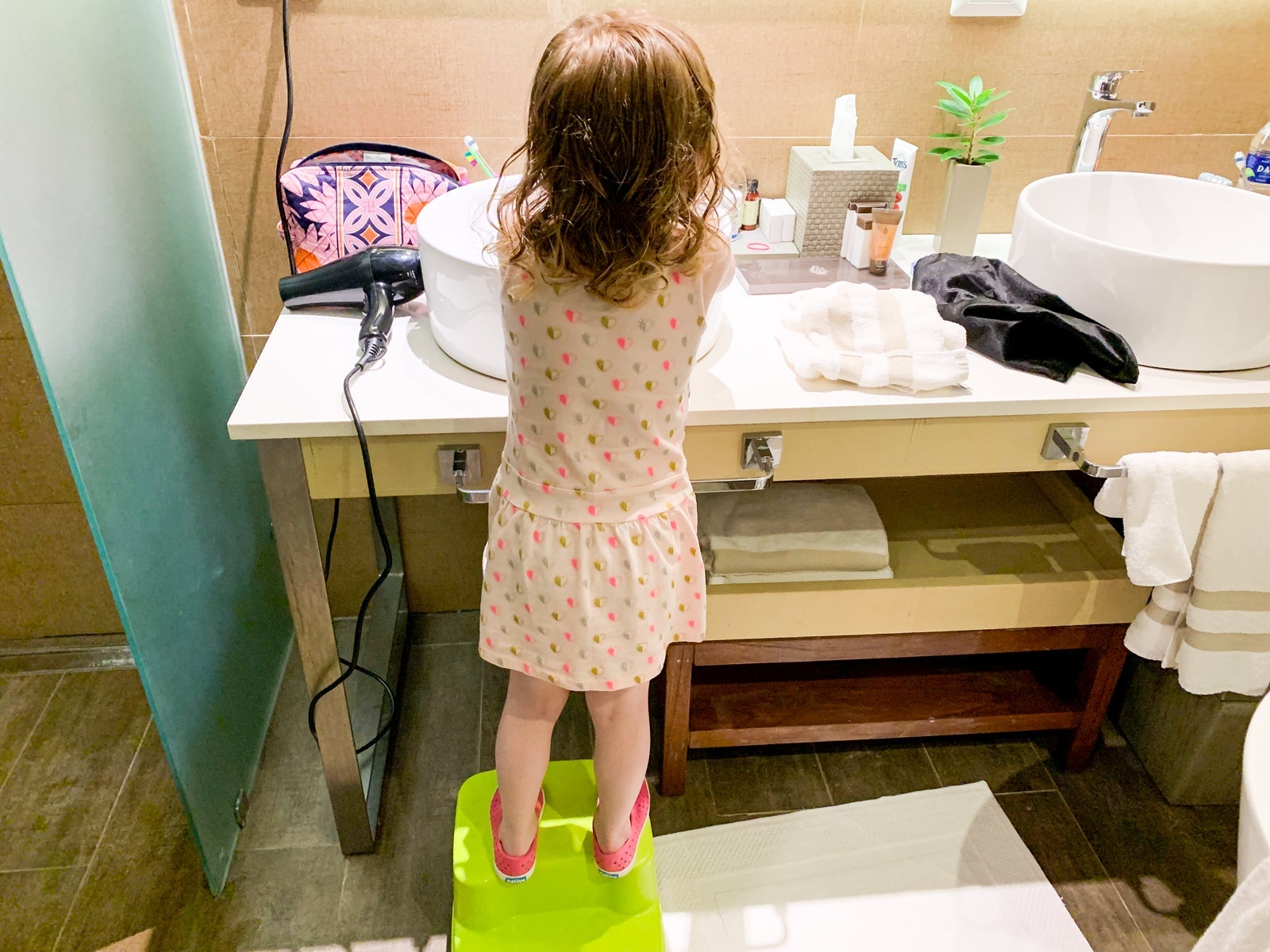 Then there were the sinks, trendy his-and-her sinks with generous counter space. There was just one catch: They were already high up, but the giant lip that rose up several extra inches to form the basin prevented our toddler from washing her hands by herself or brushing her teeth. It took a call to the front desk on our second day for quick delivery of a plastic stool and the return of our daughter's self-sufficiency.