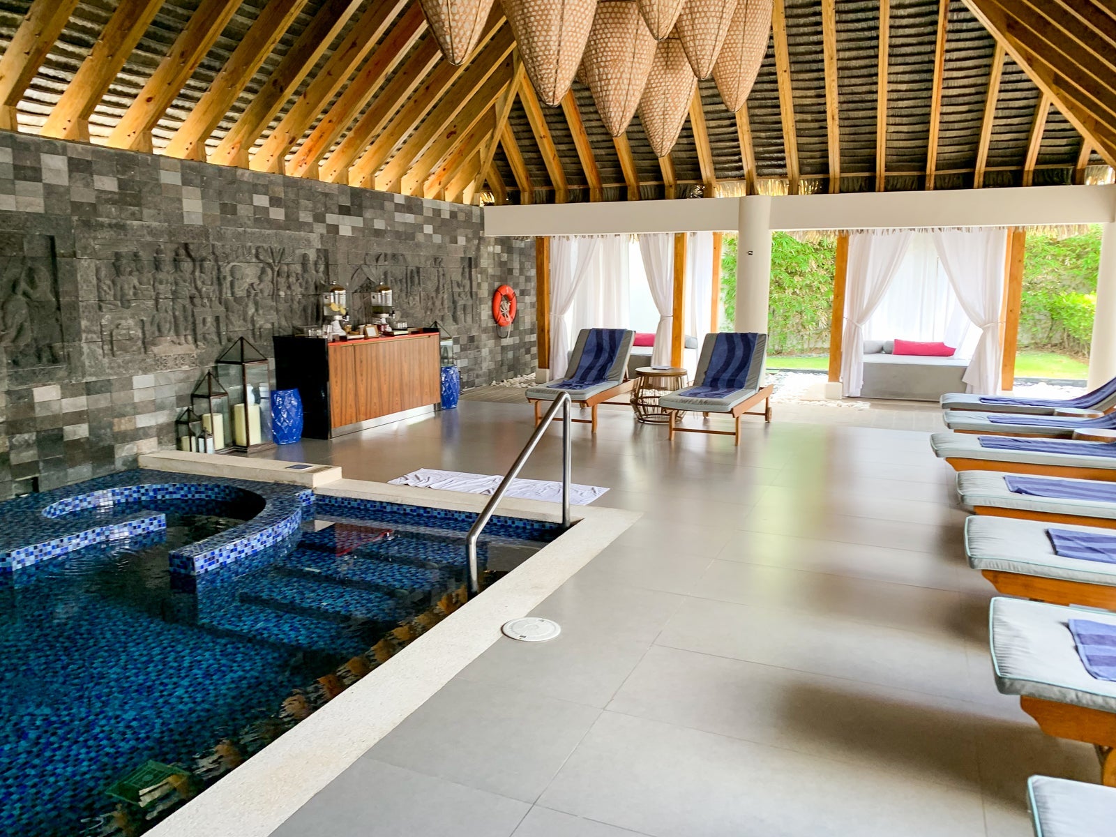 A series of water features and sensory pools helped us unwind, and then we lounged in plush chairs under a thatched roof with open sides. While reading my book in relative silence, a heavy downpour came. I was dry but got to enjoy the strong breeze and sound of the rain. I could have stayed there all day, but there was only so much babysitting we could ask of the grandparents. (You can, by the way, ask to have your treatments in outdoor huts just past the wet area.)