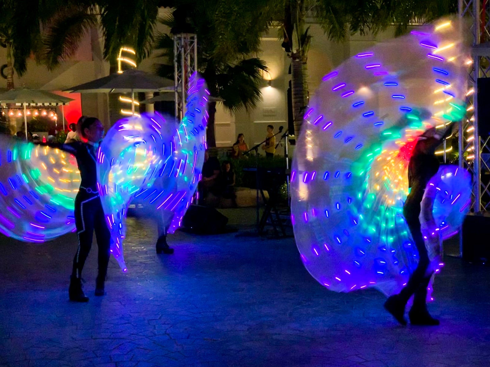 Each night, there was entertainment for kids near all the restaurants, including a small circus one evening and outdoor children's movies another night. For adults, there were performances, bands and dancers. The kids often also jumped into the fun.