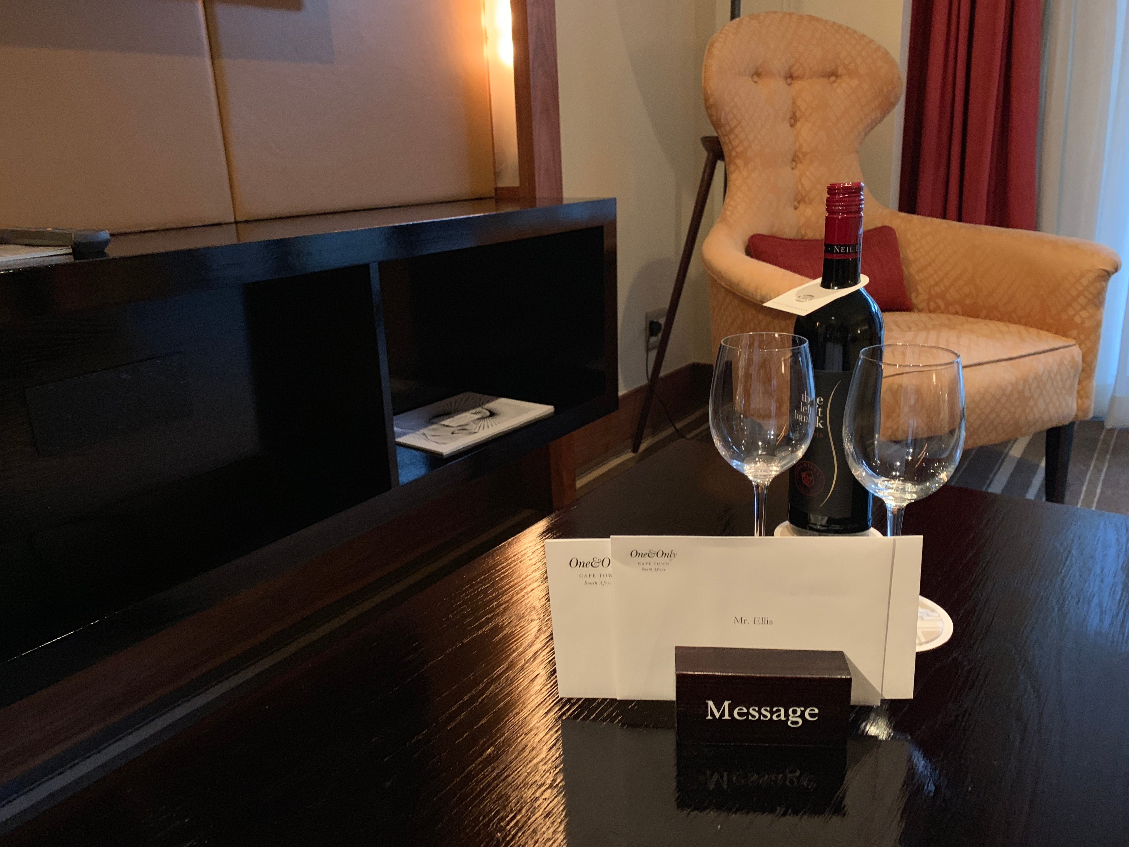 When I arrived at my room, I noticed that the staff had left for me as a welcome amenity a lovely bottle of South African red wine, but unfortunately I didn't even have time to open it, given how busy we were on this trip.