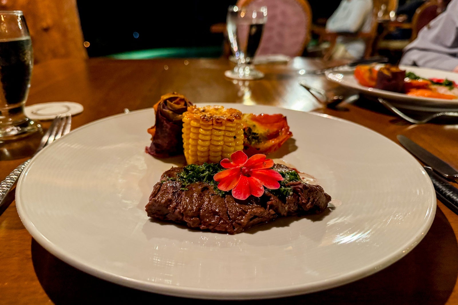 For dinner, heartier dishes, including broccoli soup, mango-carrot salad, sizzling rib-eye with sweet potato puree and mushrooms, or skirt steak with chimichurri, prevail. To round out your meal, expect desserts like vanilla flan or papaya-coconut panna cotta.