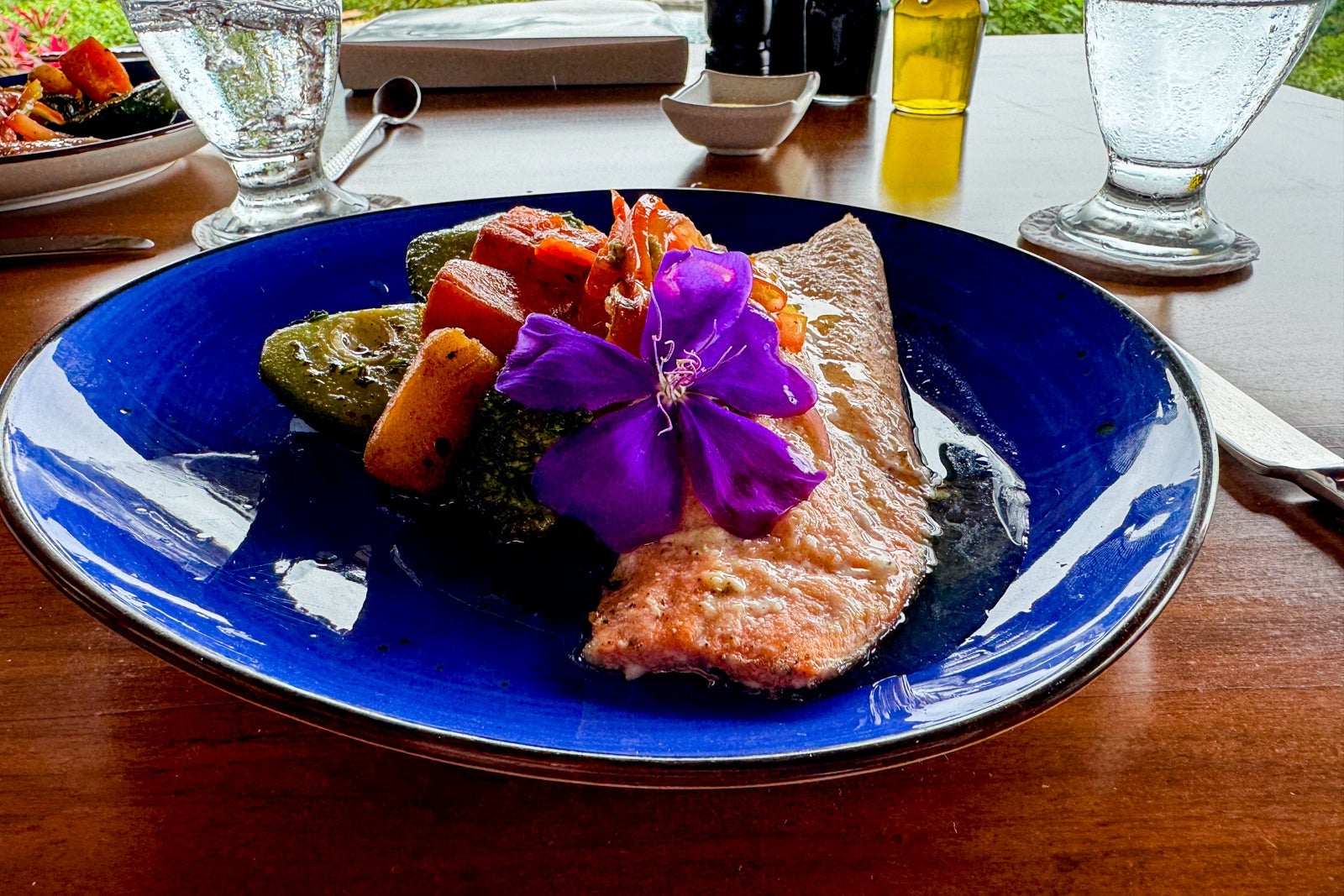 Lunch might include fresh-caught comber fish in asparagus sauce with pumpkin and spinach or mountain trout with sweet potato and squash, plus fresh salads and desserts like a sweet corn pie.