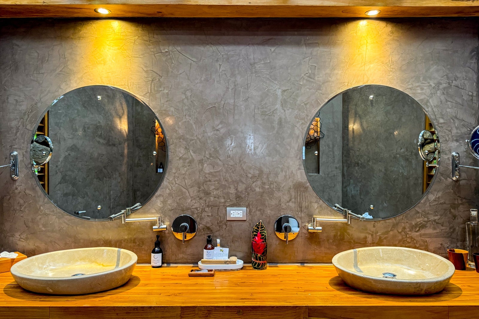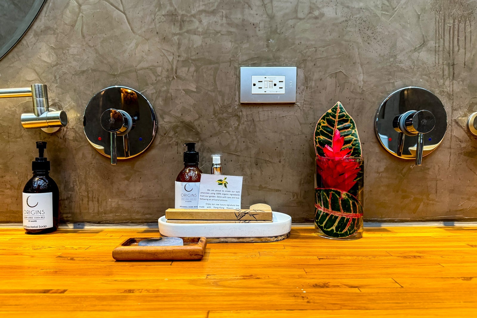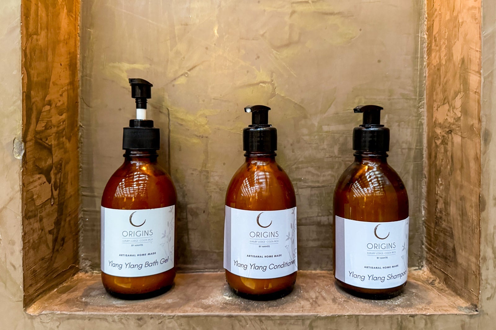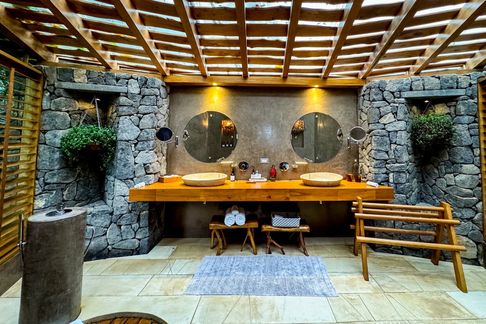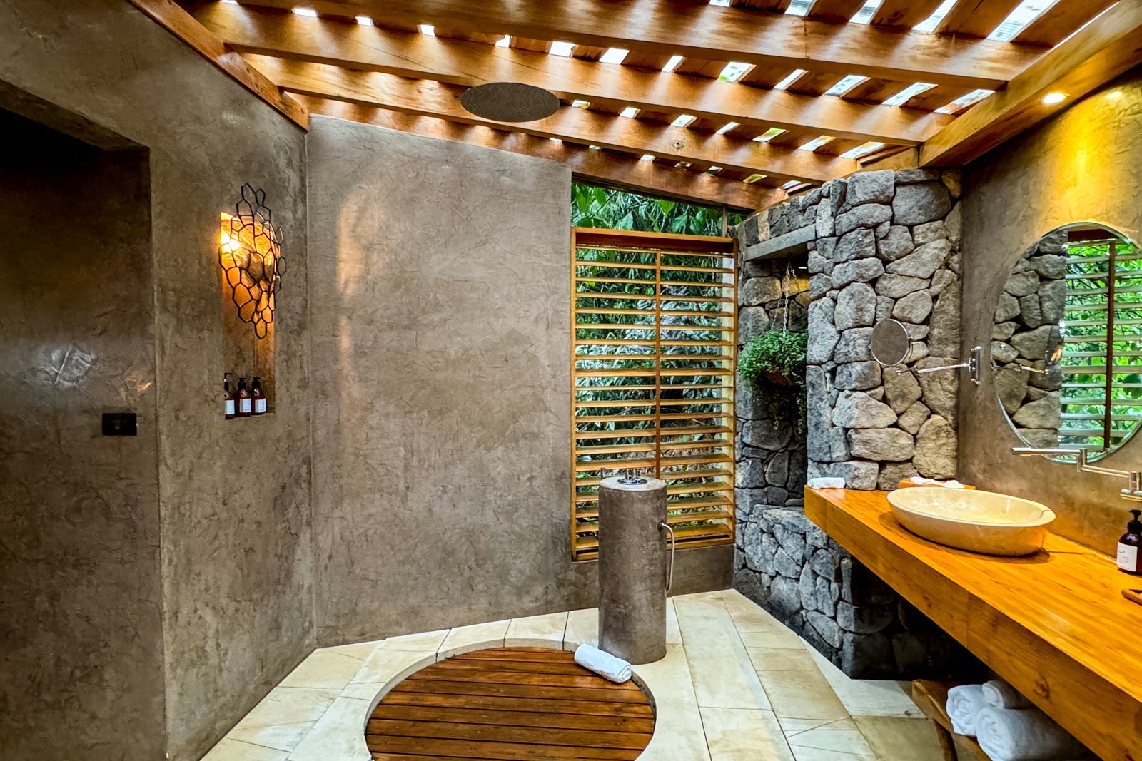 The skylit bathrooms with rough-hewn stone walls are filled with light, and the freestanding, wall-less showers feel like bathing under a gentle rain. The hotel produces its own all-natural bath and soap products from ylang-ylang grown organically on the property.